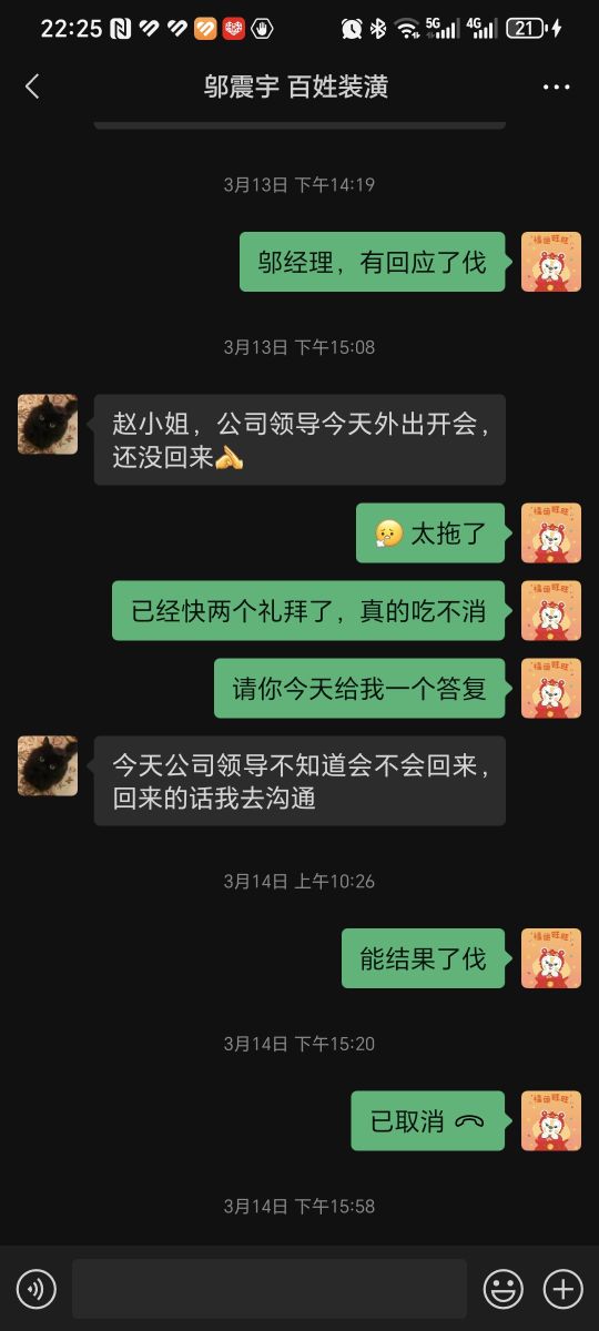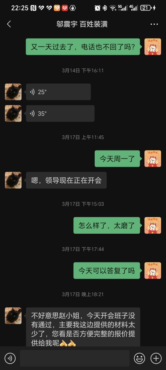 我于25年2月28日,與百姓裝潢(寧夏路777號)簽訂裝修合同并支付了2萬元訂金。當(dāng)晚即發(fā)現(xiàn)提供給我的預(yù)算單上諸多內(nèi)容存在疑問,包括項(xiàng)目單價(jià)過高、預(yù)算內(nèi)容與設(shè)計(jì)圖內(nèi)容不符等等。于3月2日(合同簽訂后還不滿48小時(shí)),前往該公司溝通相關(guān)事宜。對方無法給出準(zhǔn)確答復(fù),且態(tài)度惡劣。鑒于合同上存在的問題,以及對方的態(tài)度惡劣,我提出申請解除合同,對方未予以答復(fù)。后我向12345市民熱線反映情況,百姓公司工作人員答復(fù),我的訴求轉(zhuǎn)到了室內(nèi)裝修協(xié)會,他們就是室內(nèi)裝修協(xié)會的成員,就是由他們自己處理的,溝通中一直回避我的訴求,要求我繼續(xù)在他們公司裝修,但又無法消除我的疑慮。后一直以各種借口拖延答復(fù),一會兒領(lǐng)導(dǎo)開會去了,一會兒要等班子會議決議,總之是一拖再拖,甚至是我發(fā)信息、打電話都不接不回復(fù)了。直到3月17日晚上,答復(fù)我班子會議未通過。而我和他們簽訂的合同上,約定3月18日開工。3月18日,對方未聯(lián)系我,未開工,已實(shí)際違約,要求百姓公司承擔(dān)違約責(zé)任,解除合同。