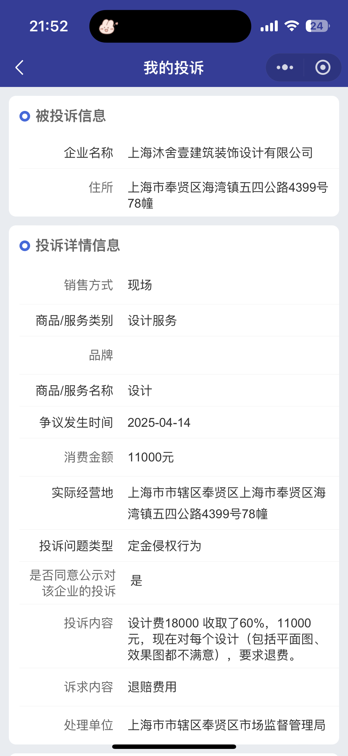 | 投訴類型 | 合同糾紛 | 投訴人 | 張** | 被投訴單位 | 上海沐舍壹建筑裝飾設(shè)計(jì)有限公司 |