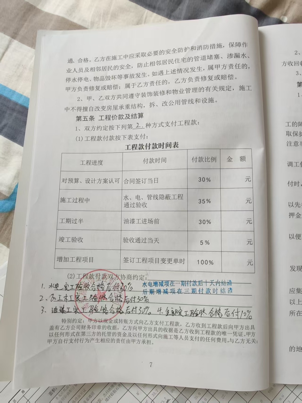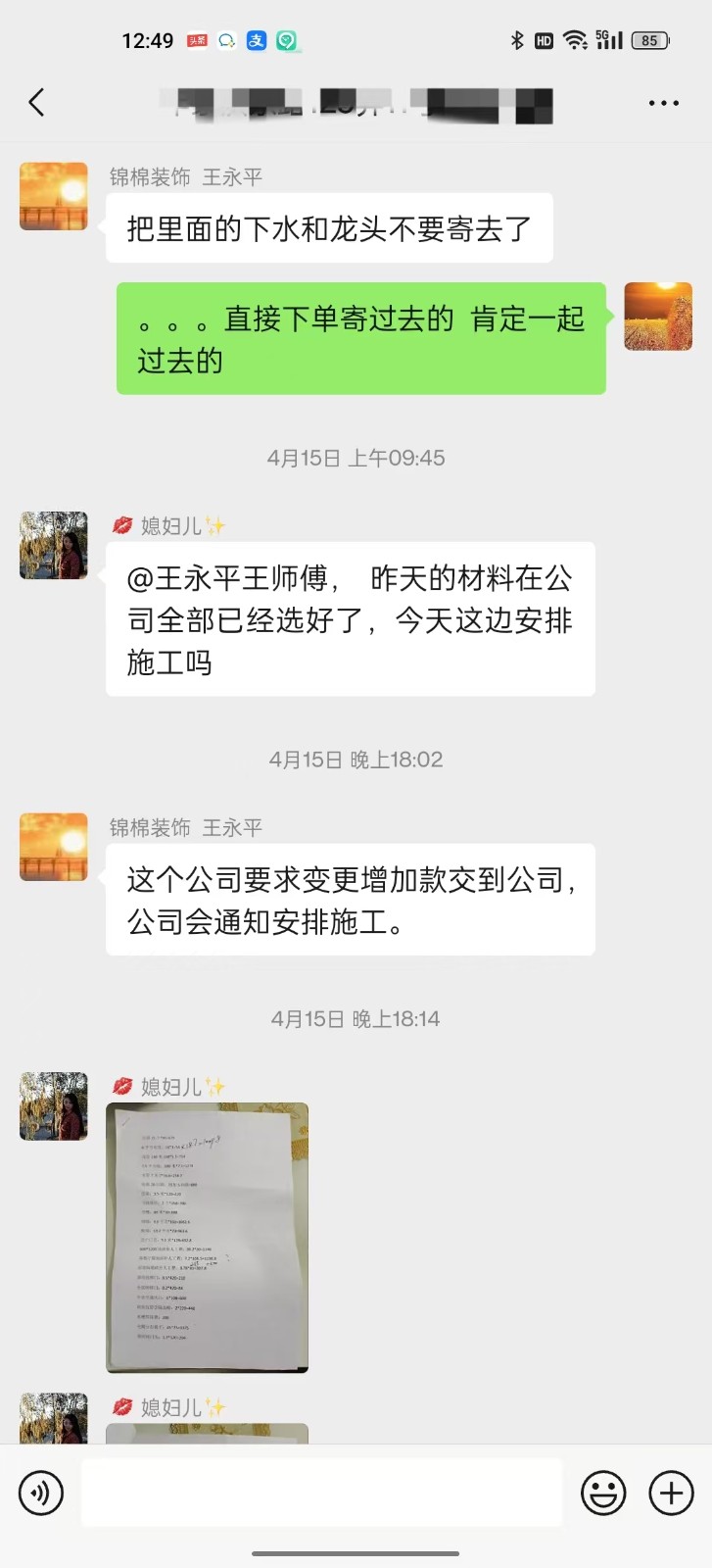到目前為止已經(jīng)繳納前期款項90%(第二筆款項約定是瓦工,木工驗收合格付30%(即5.04萬)。但木地板和柜門尚未安裝),在2025/4/12 號繳納完 第三筆款項5.04萬元后,裝修隊長就拋出了大筆的增項,施工前無任何告知,且揚(yáng)言只有跟公司付清了增項,才能開始后期的施工。
