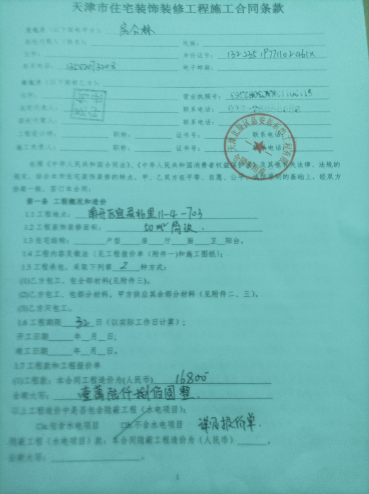 | 房型 | 一房 | 聯(lián)系地址 | 天津****** | 項目負(fù)責(zé)人 | 李鑫淼 |