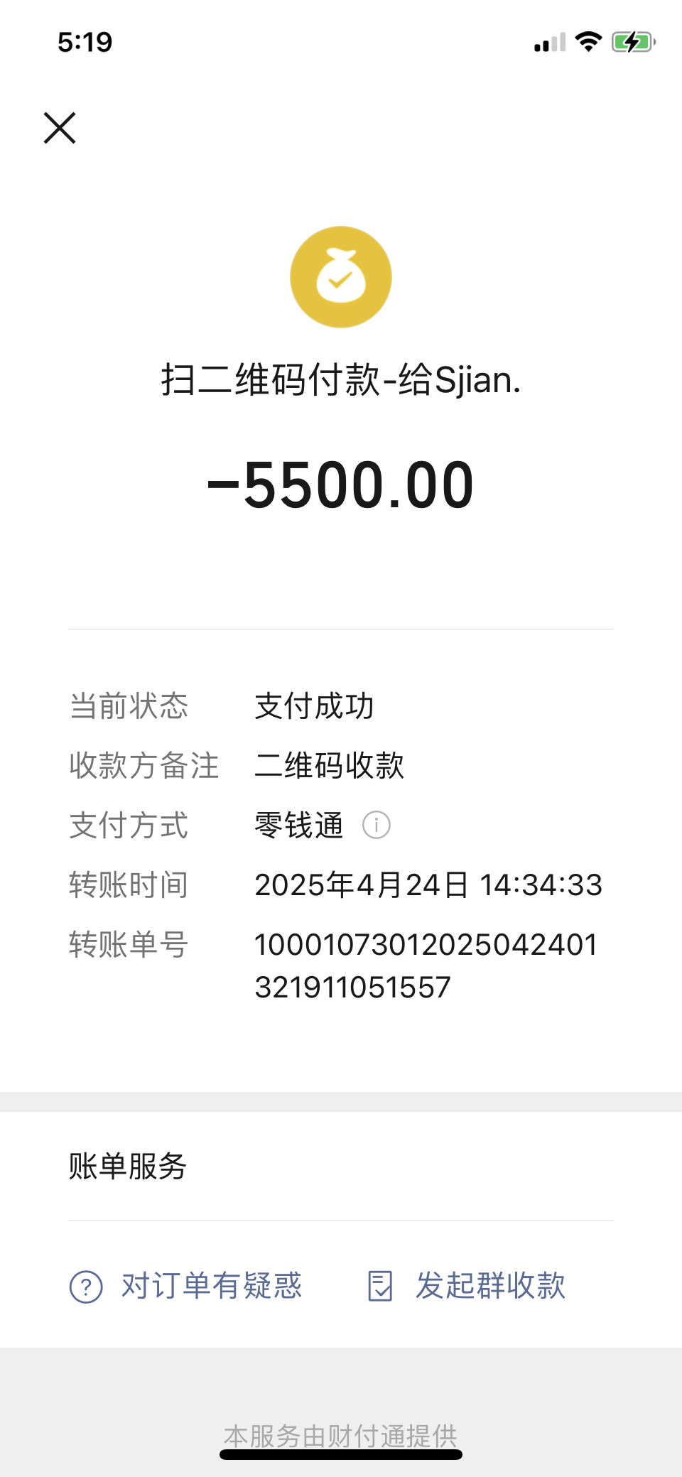 趙勇說門窗費要先預付5500元,他給了我一個微信收錢碼讓我掃碼把錢付給了叫sjian的。之后由于微信里錢不夠先付給他公司500元,兩天后又付了5500元,完成了合同約定的6000元首期款。