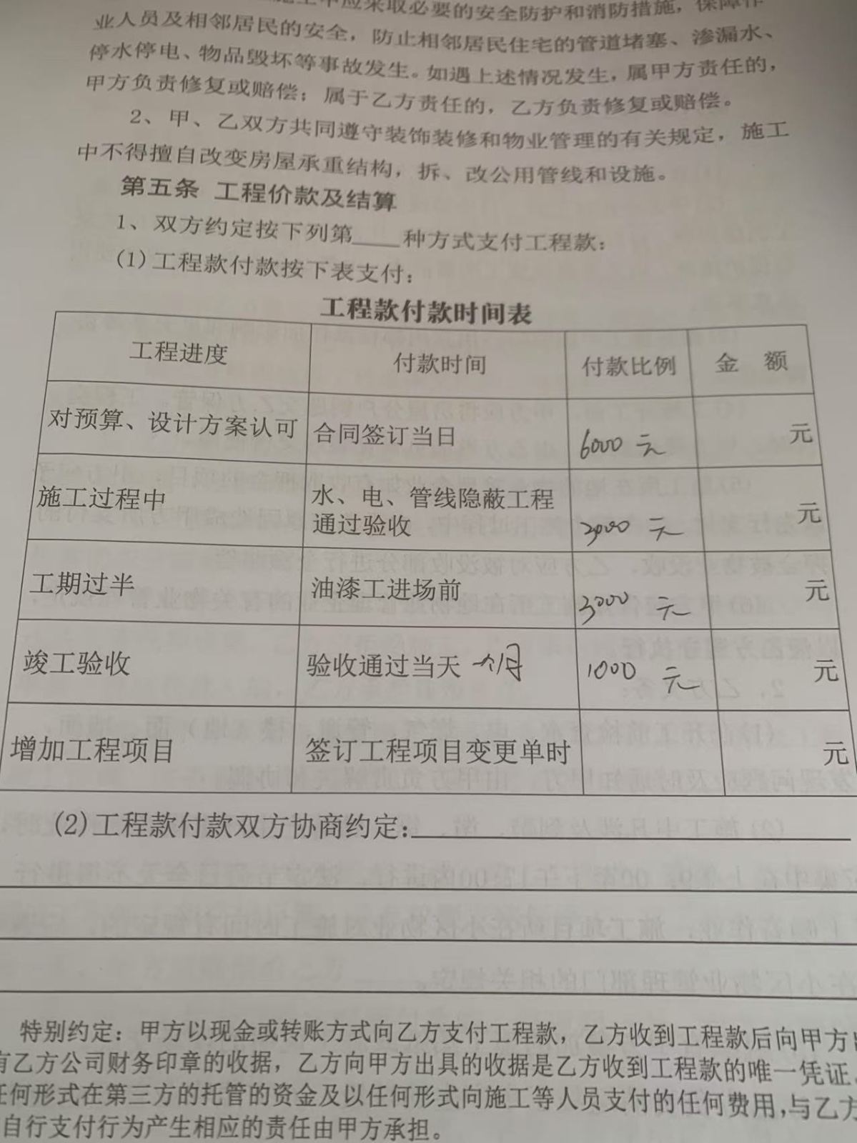 首先,第一批砸墻的工序剛完工,該公司的王副總就在微信群里給我說,27號安排水電材料進場,要我再給他公司付5000元。告訴他,合同明明寫的很清楚了,水電工程完工驗收合格后再付3000元啊。王副總說他不知道趙勇跟我簽合同的事。這就怪了,他是趙勇的領導,居然不知道。我把合同拍照片給他看。
