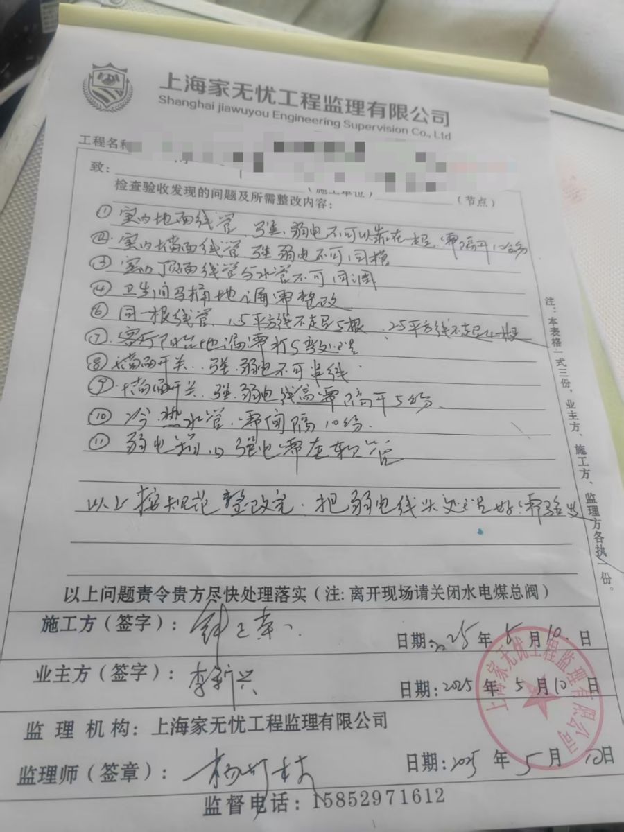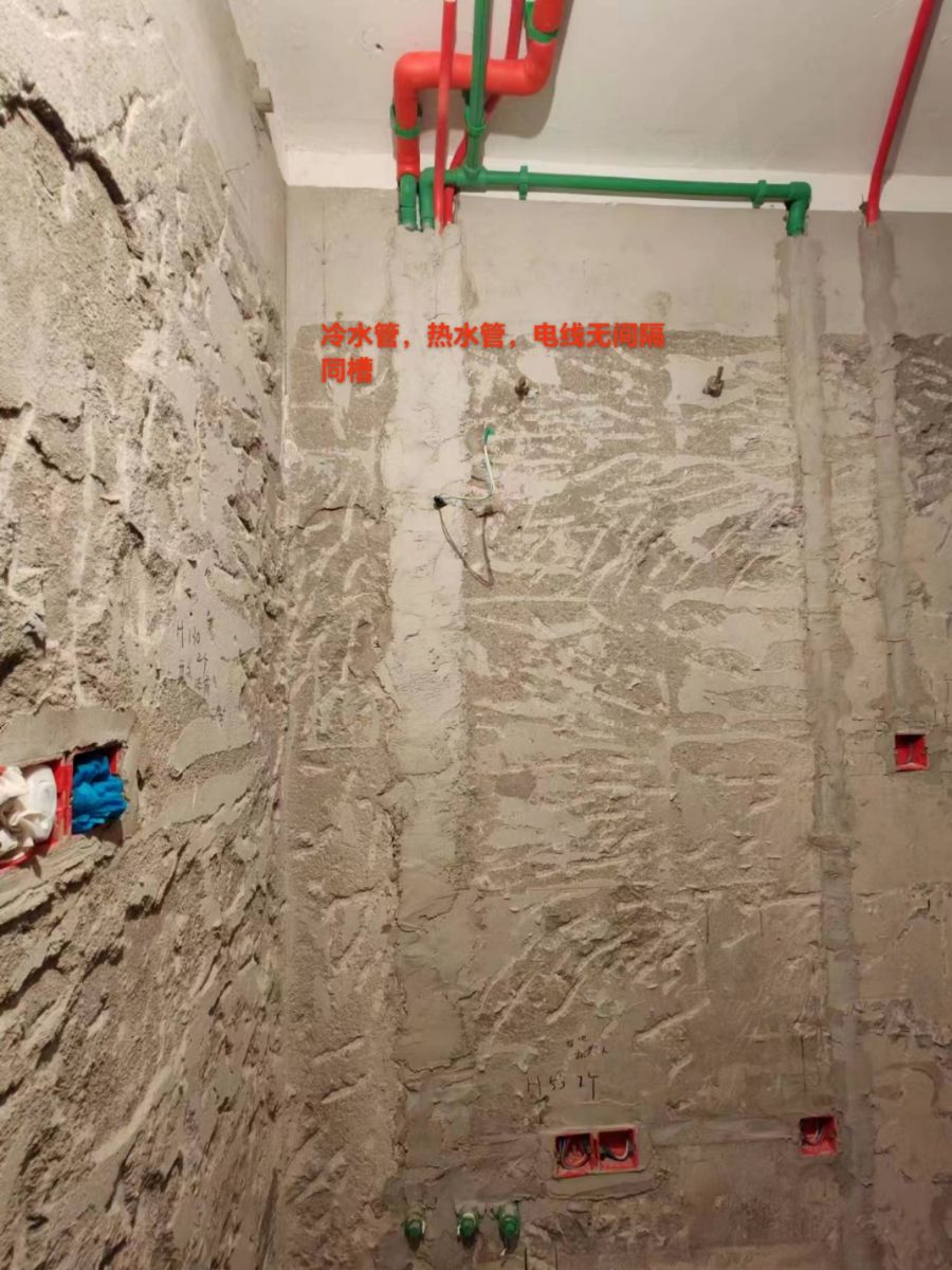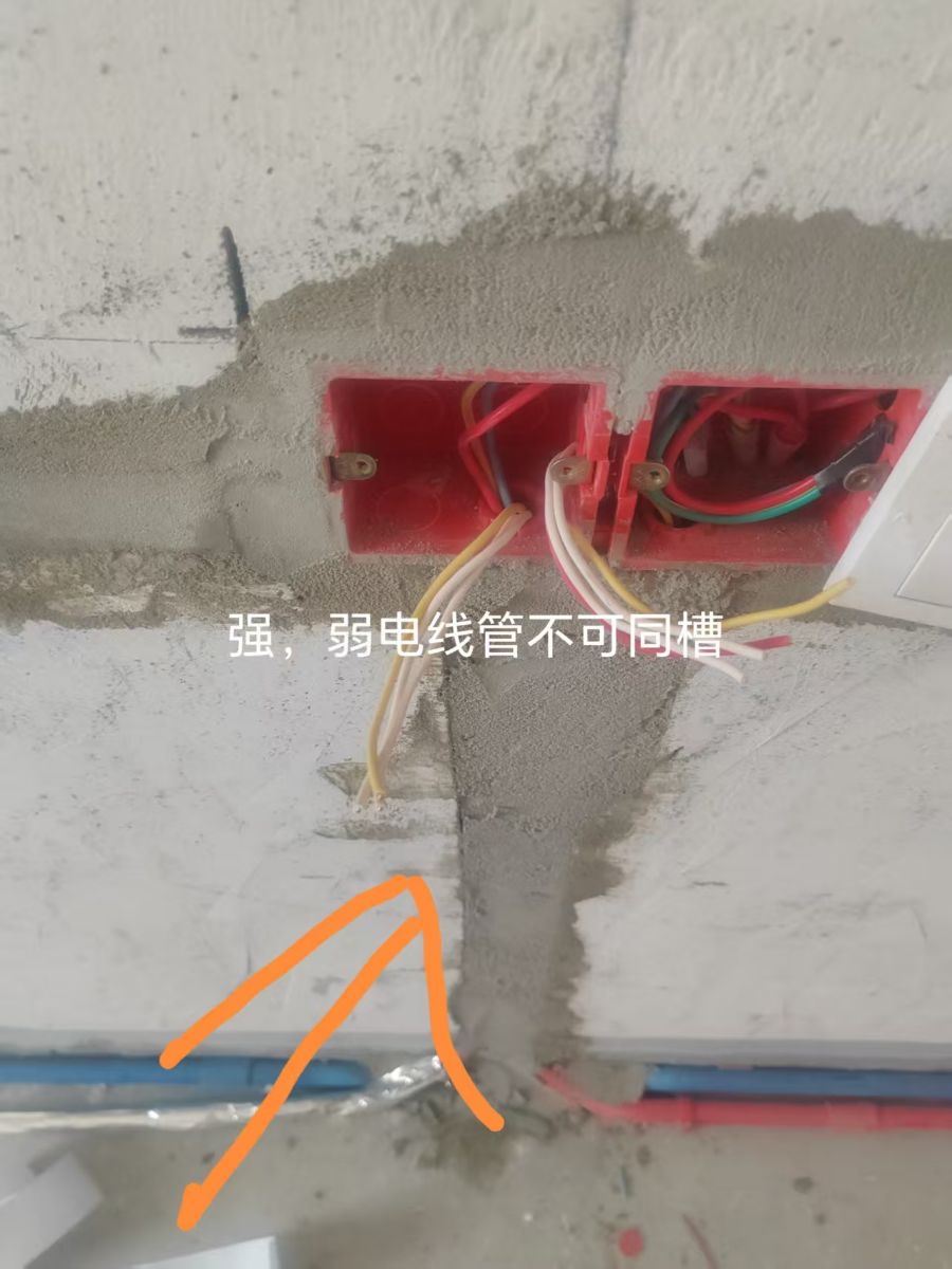 2.水電施工,強(qiáng)弱電0距離同槽,冷熱水管+電線0距離間隔同槽,強(qiáng)弱電線盒串線,一根線管超過(guò)5根線都在一起等等各種問(wèn)題,施工不規(guī)范,且有安全隱患