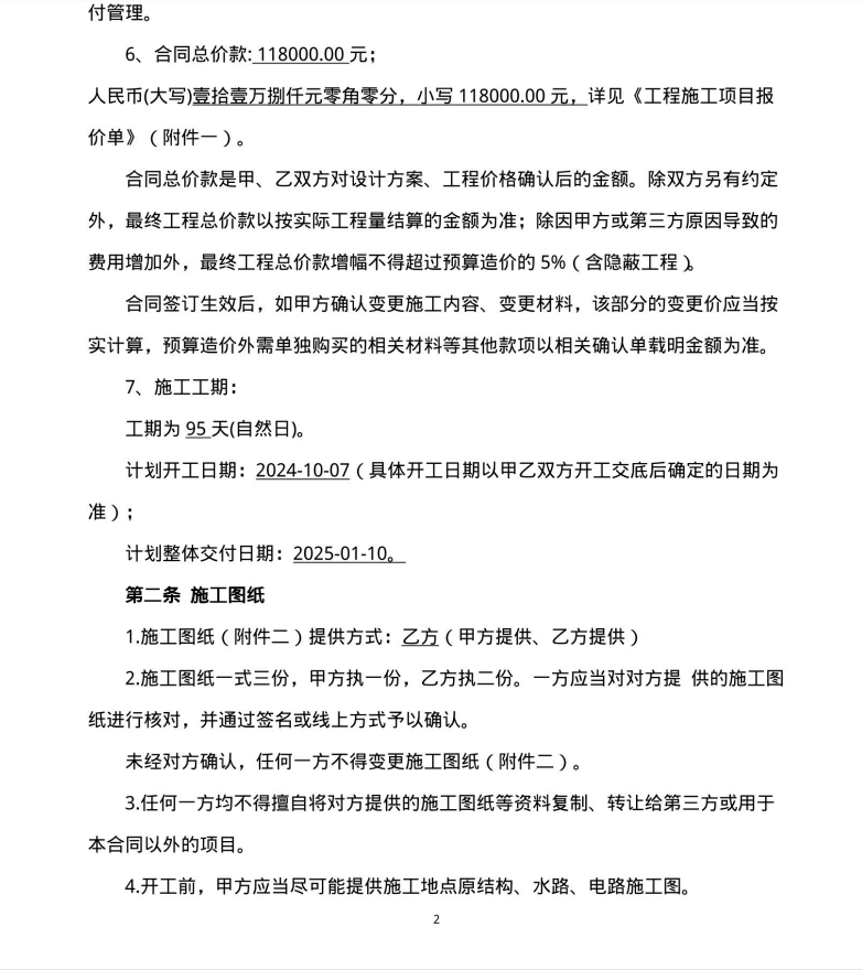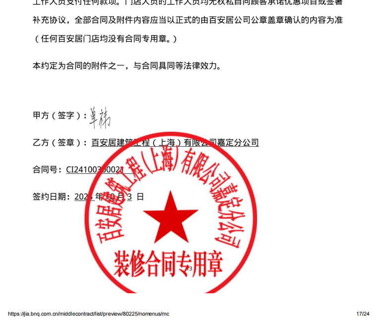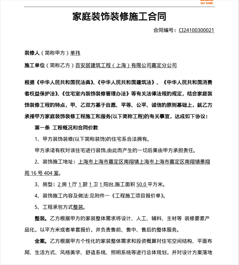 裝修合同簽約日期2024年10月3日,竣工日期定為2025年1月10日, 逾期 賠付100元/天