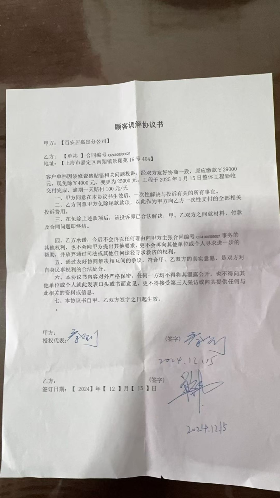當(dāng)時(shí)頭一天看見(jiàn)廚房瓷磚貼成衛(wèi)生間的瓷磚,(衛(wèi)生間瓷磚未貼)當(dāng)晚告知貼錯(cuò)。等第二天我們協(xié)商之后看怎么處理,結(jié)果第二天下午去施工現(xiàn)場(chǎng),工人已經(jīng)貼完衛(wèi)生間瓷磚(將錯(cuò)就錯(cuò))當(dāng)時(shí)我們要求敲掉重貼,百安居項(xiàng)目經(jīng)理秦劍和店長(zhǎng)楊帥與質(zhì)檢負(fù)責(zé)人郭剛說(shuō)重貼很麻煩,耽誤工期,不給重貼,我們也不懂,對(duì)他們將錯(cuò)就錯(cuò)的這個(gè)行為感到不可思議,最后說(shuō)尾款減免4000元作為貼錯(cuò)墻磚的補(bǔ)充,我們也沒(méi)辦法。只能同意