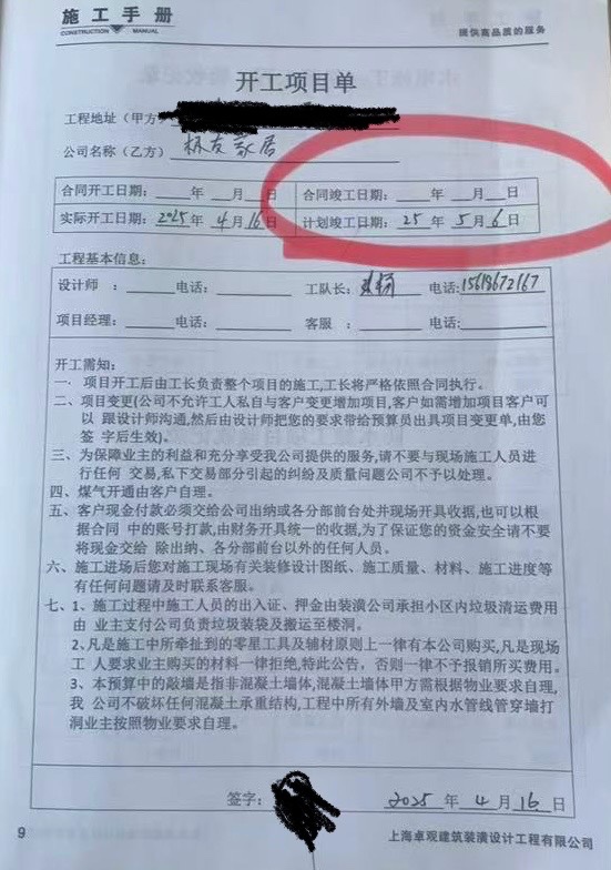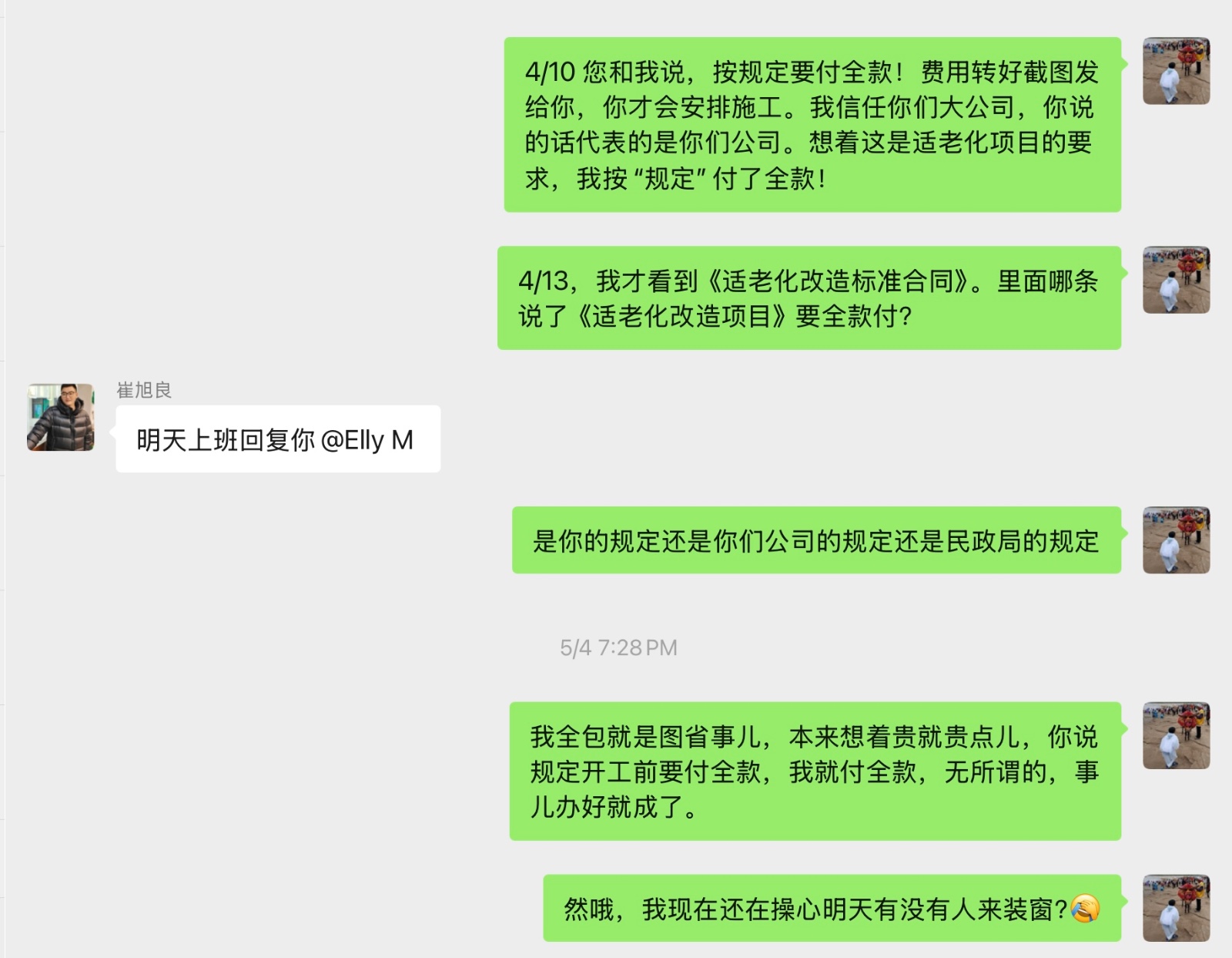 該工程經(jīng)理一直回避我關(guān)于他說的“按規(guī)定,適老化改造項(xiàng)目要開工前一次性付清全款才能開始施工”的疑問。用“明天回復(fù)你”來(lái)打發(fā)我,但無(wú)論我私信他還是在裝修小群?jiǎn)査啾椋两癫换貜?fù)。