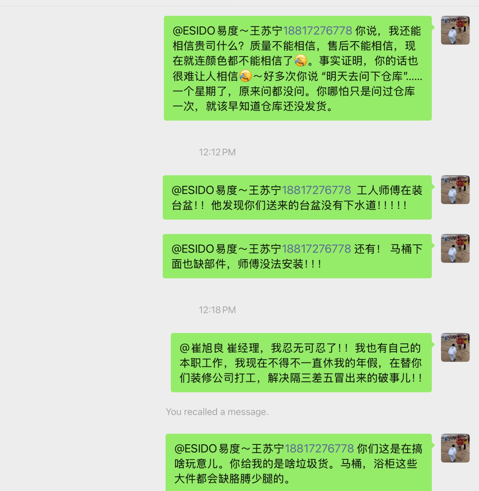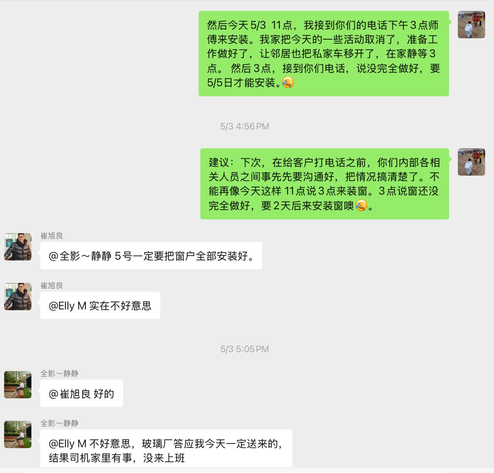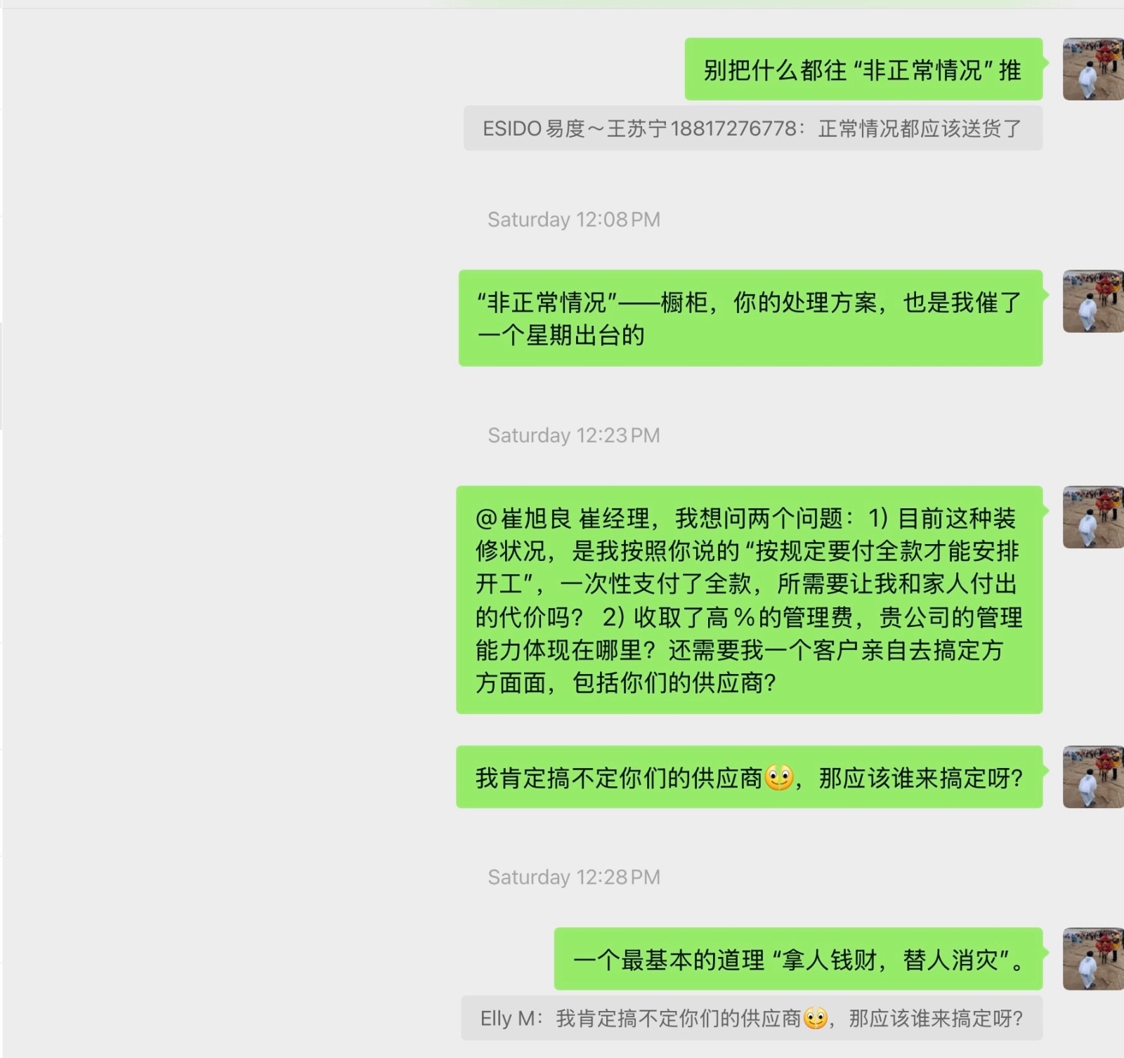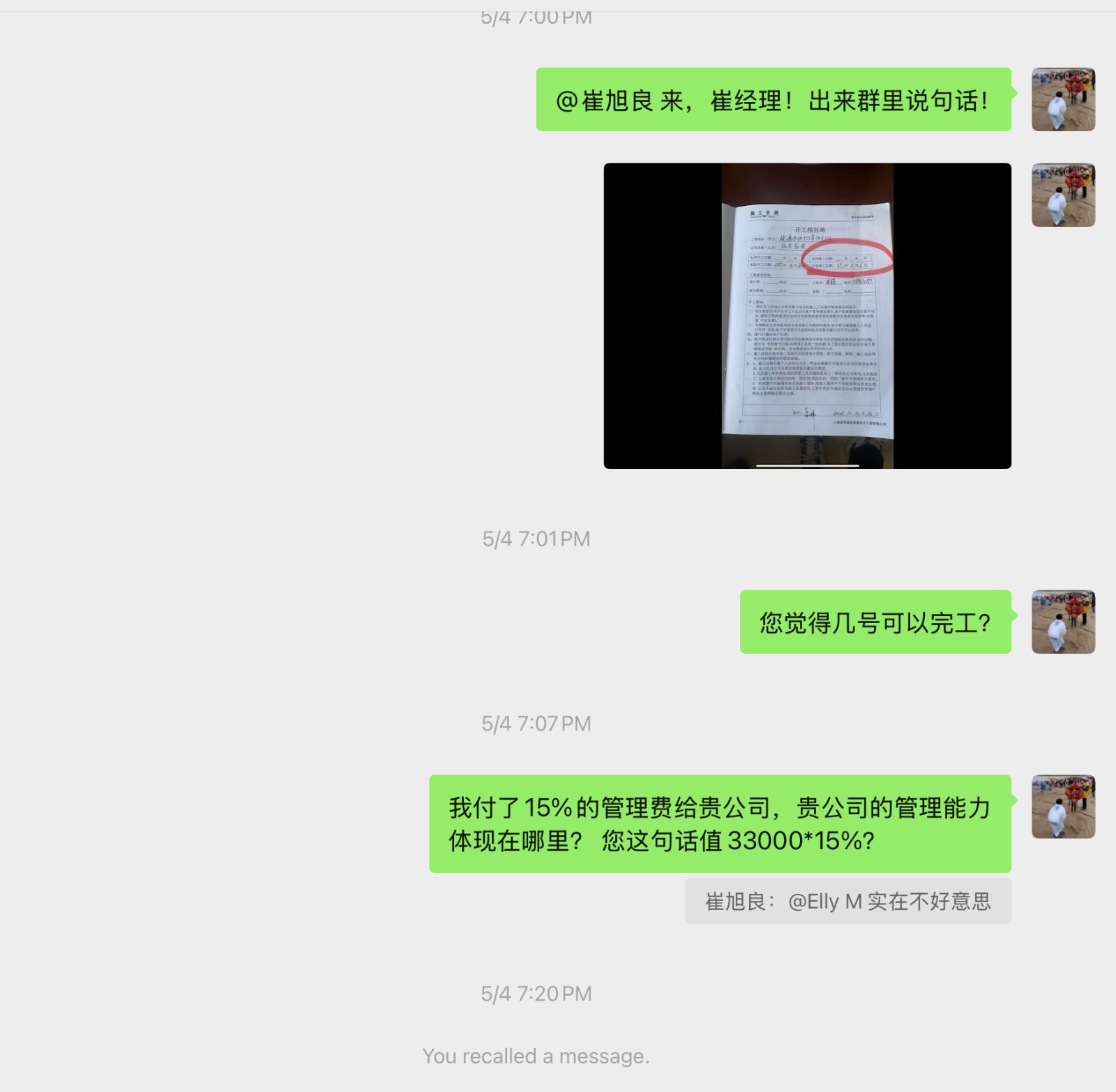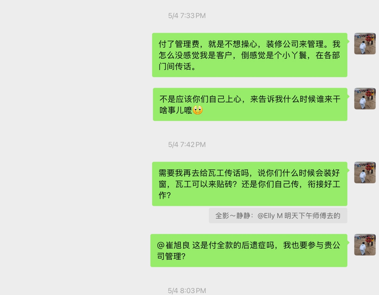 裝修公司工程經(jīng)理崔旭良只會(huì)在微信群里喊喊口號(hào):“要盡快”“你們要對(duì)接好”,“不要出差錯(cuò)”,至于他的話有沒有落到實(shí)處不關(guān)心。其供應(yīng)商工作出差錯(cuò)和拖延,一直是我在裝修小群里催和盯,被我催急了,該工程經(jīng)理才再出來(lái)說幾句。