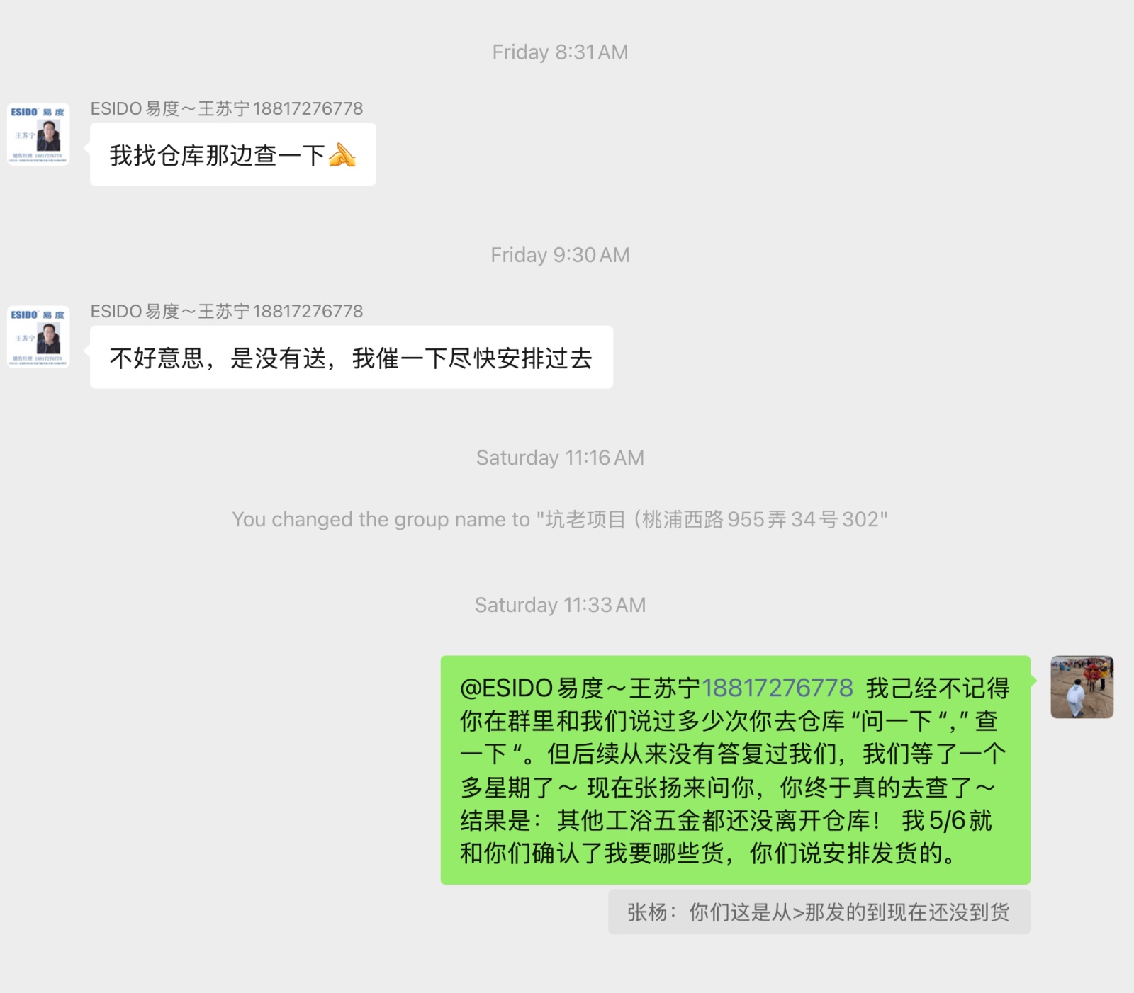 幾乎每次裝修公司的供貨商出差錯(cuò)、拖延,都要我這樣在微信群里喊他,該項(xiàng)目經(jīng)理才出來(lái)在微信群里“溜達(dá)一下“