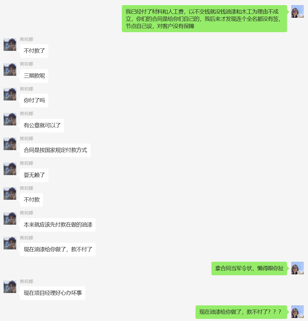 (8)最后一點(diǎn)是引起矛盾的關(guān)鍵點(diǎn),都是提前付費(fèi),沒有質(zhì)量檢查和結(jié)算環(huán)節(jié),剛電工做完開槽,付第二批款項(xiàng),漆工和木工還沒弄,就要把最后一個(gè)30%付了,理由是漆工和木工的錢就靠這個(gè)出,我是半包,前面8750+4500+7500=20750,肯定可以支付各項(xiàng)材料及人工費(fèi)用了,各種雜項(xiàng)基本都沒真開始就付費(fèi)接近結(jié)束。而且合同里他們自己定義的付款節(jié)點(diǎn)和面議的完全不一致,合同之后項(xiàng)目經(jīng)理及簽合同的人多日不見,隔一些天通知做一個(gè)零工。我需要協(xié)會幫助如何監(jiān)督完成最后的項(xiàng)目質(zhì)檢,并討論對客戶的保護(hù)機(jī)制。謝謝!