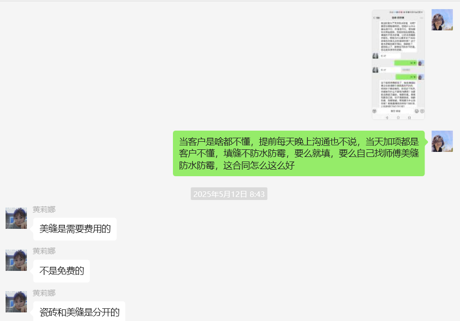 (5)瓷磚貼好后,跟我說合同里的填縫不合適,貼成1mm縫可以,并且不防水不妨霉,現(xiàn)在貼5mm縫,美縫不包,要么1300給我們做,要么自己做人做,我自己找人做,到這時(shí)通知是因?yàn)榇蠹叶贾馈?br />(6)石膏線鏟下來,說石膏不包,要不付錢,要么自己找人做,我自己找人做,也是大家都知道,就我不知道。