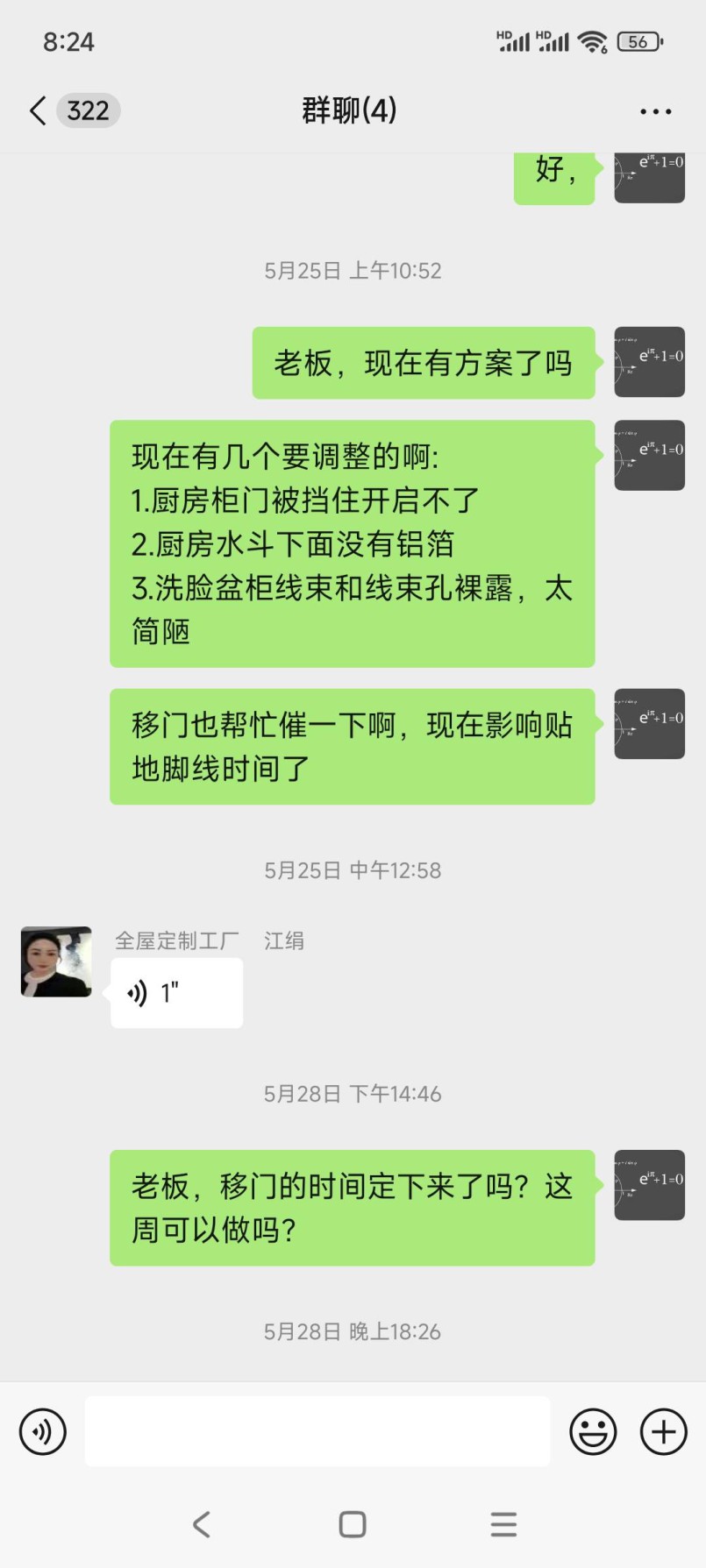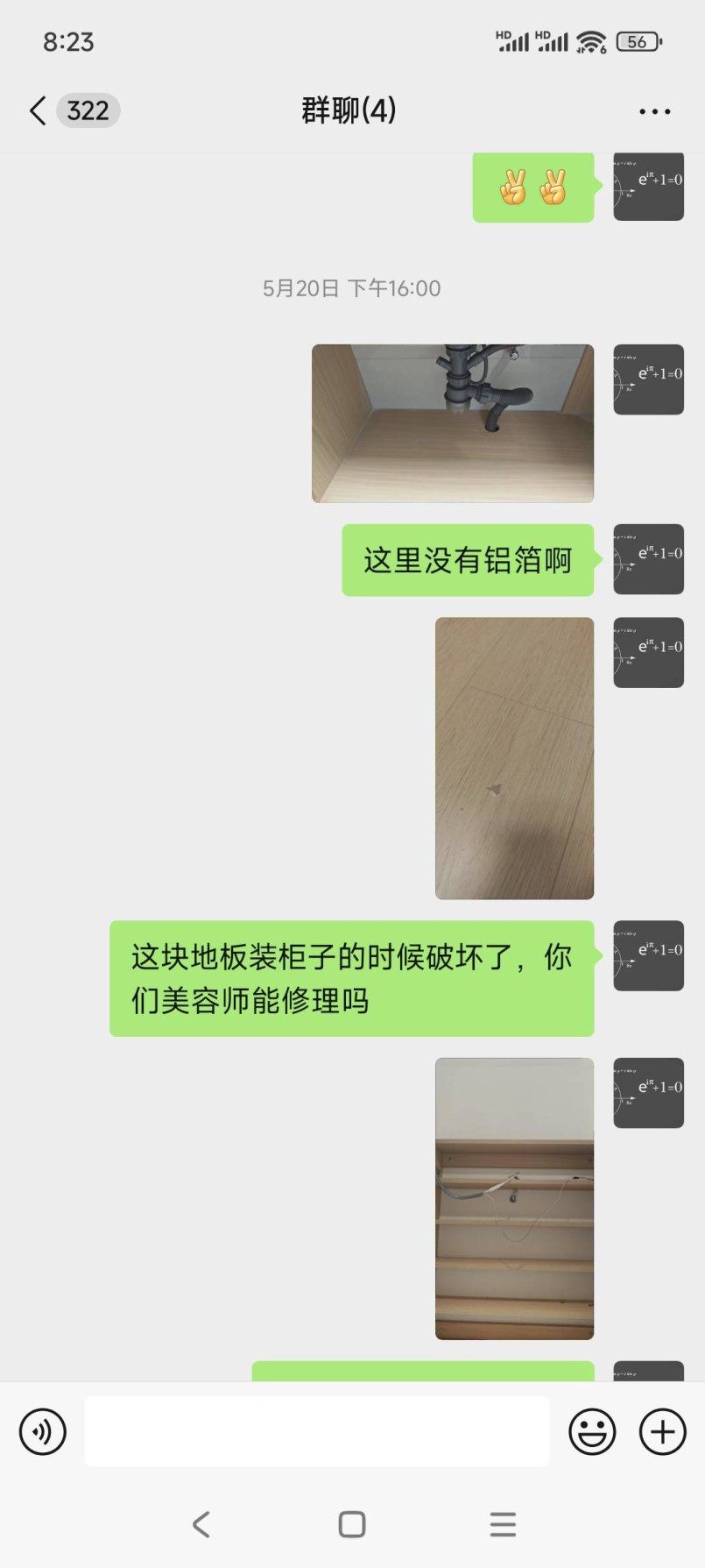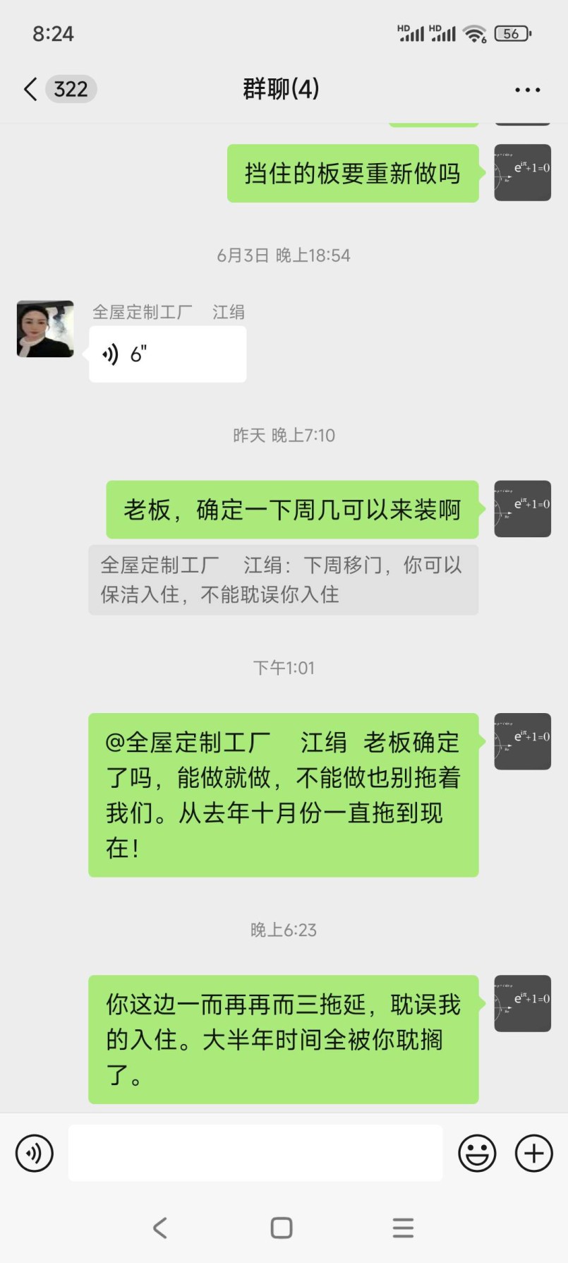 3.言而無信:承諾按指定時(shí)間施工,結(jié)果一托再拖,毫無進(jìn)展。明確告知會(huì)影響貼T腳線和補(bǔ)漆,仍無進(jìn)展。