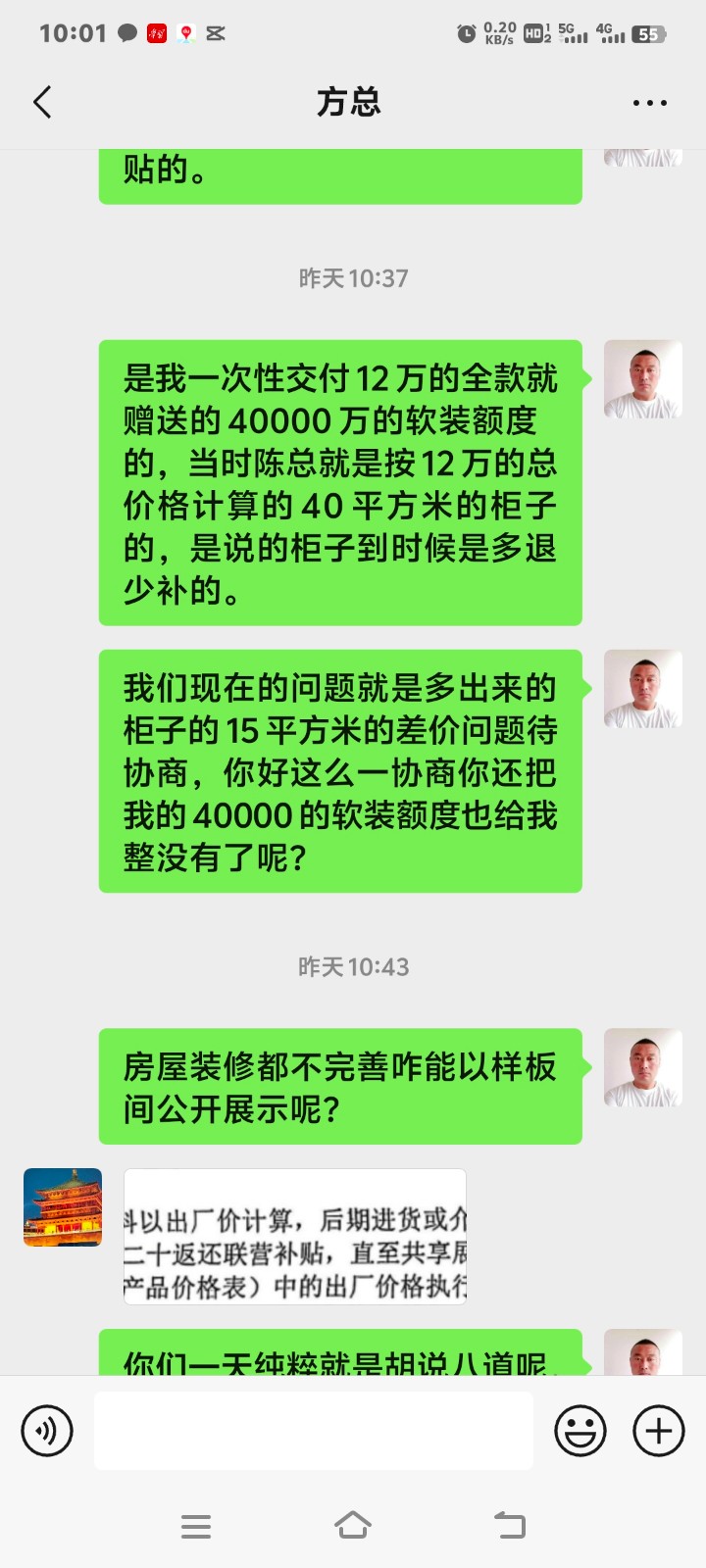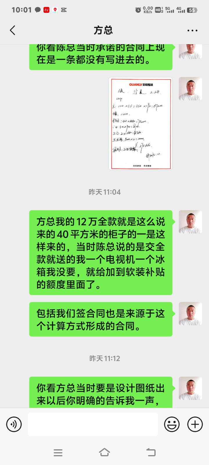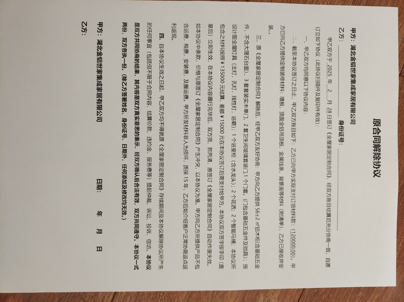 3:我現(xiàn)在被(湖北金鋁世家集成家居有限公司)合同套路了我們家東拼西湊的12萬元的裝修資金,現(xiàn)在是就給我發(fā)過來了頂板墻板還有一些裝飾線條,安裝完了我通知他們過來量完了柜子門的尺寸,不給我發(fā)貨,就說的是給我發(fā)過來的貨已經(jīng)用了76000千元了,柜子的費(fèi)用給我算了8-9萬,說我當(dāng)時(shí)交付的12萬元的材料預(yù)付款還剩下3萬多元了,我現(xiàn)在已經(jīng)上當(dāng),天天欲哭無淚,在此表達(dá)我個(gè)人上當(dāng)經(jīng)過,告知廣大網(wǎng)友普通老百姓,全屋定制純粹套路詐騙割韭菜,不要上當(dāng)全是陷阱,不給我們開發(fā)票這家公司還有偷稅漏稅行為懇請(qǐng)當(dāng)?shù)卣毮懿块T嚴(yán)查這家公司,希望公安局的,工商管理局的,市場監(jiān)管局的,稅務(wù)局的,能為面除害幫助更多的人追回?fù)p失,也要嚴(yán)查打擊這個(gè)沒有一點(diǎn)人性的騙子公司,不能任他們?cè)谏鐣?huì)上明目張膽的繼續(xù)詐騙百姓的血汗錢了,希望廣大網(wǎng)友看到能幫忙轉(zhuǎn)發(fā)點(diǎn)贊,以免更多的人去上當(dāng)受騙了。謝謝大家![合十][合十][合十]