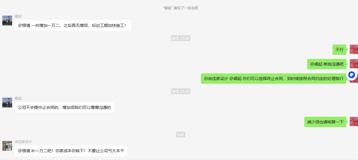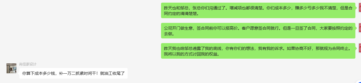 1,事件經(jīng)過:12月7日交鑰匙給他們開始施工,目前裝修進(jìn)展在60%左右,6月6日把第三筆款(共計11.97萬)付過后,剩余尾款1.83萬。收到尾款后他們說這個工程他們虧了,有些地方比簽合同時預(yù)算用料多,列出來一個閉口合項目的增項,要求加錢12000元,加過之后才愿意施工。工程過程我唯一要求的增項的地方是板材環(huán)保規(guī)格升級的600元,和地坪找平的2000元。其中減項部分(家具面積減少,鋼筋混凝土澆筑取消等減項)價格初步核算有2萬多。還有其他工程減配導(dǎo)致的一系列的問題。我的想法是增減項都有,寬且節(jié)省部分我也不要求他們退錢。希望他們抓緊時間把剩余的工程開展下去。但是就是咬著不付款項不開工。