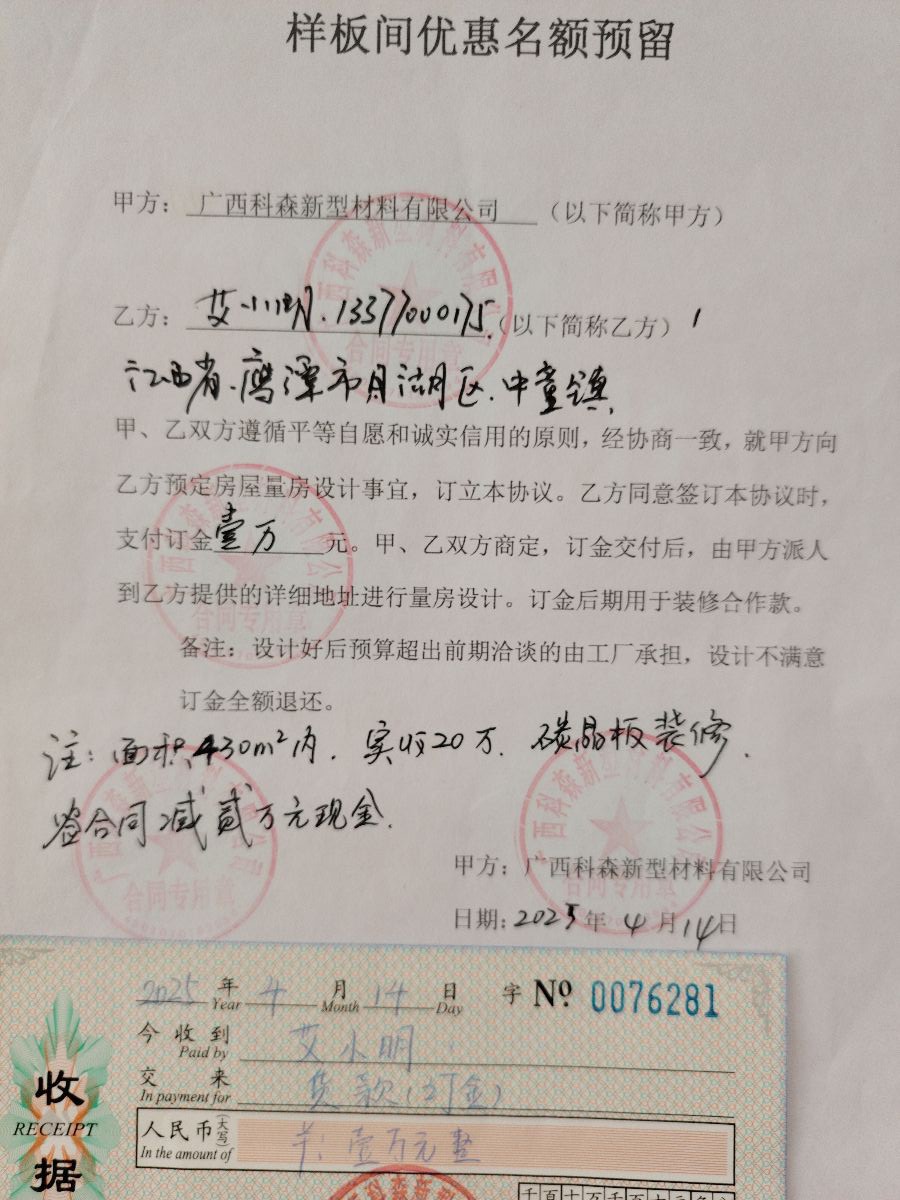 2025年4月14日到廣西科森材料有限公司了解裝修的價(jià)格,其全屋420平方全屋裝修大概需要20萬元(除水電)包括地面地板磚,門,吊頂,墻壁,和運(yùn)費(fèi),人工等費(fèi)用,超出部分由工廠承擔(dān)。訴求人自已出裝修人工,商家就送8萬元的家電,砸金蛋送1.8萬元的家電,共送9.8萬元的家電,訴求人交了1萬元的定金(定金可以抵扣2萬元),商家還贈(zèng)送了2000元的車費(fèi)給訴求人。