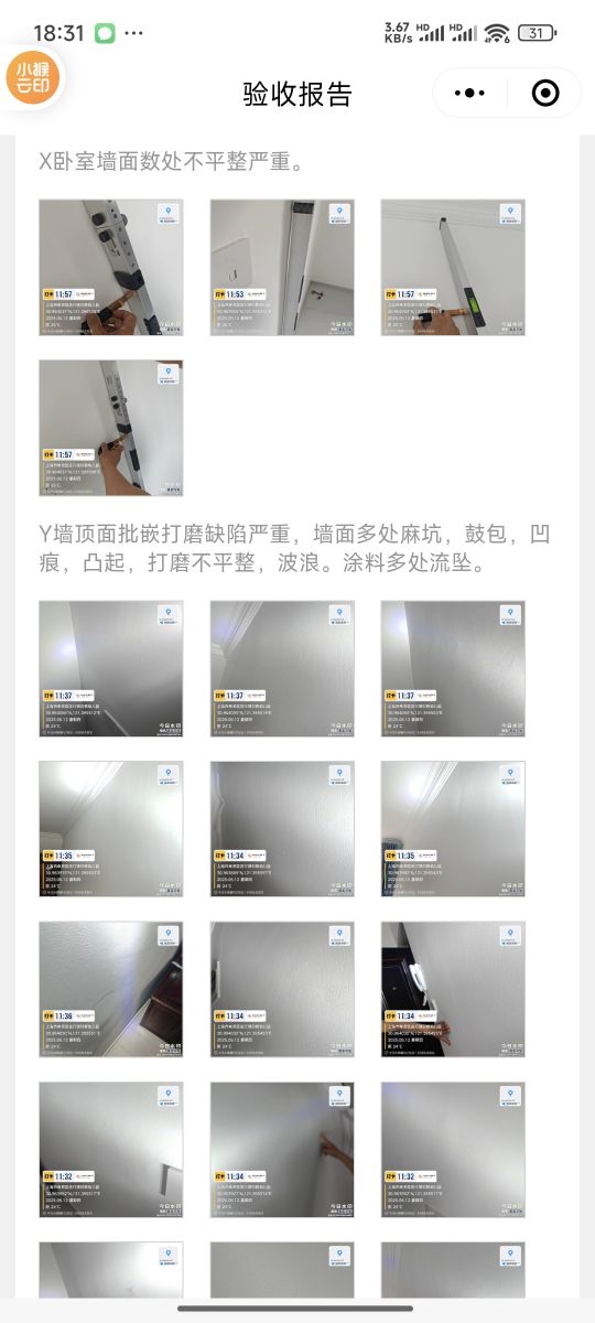 24.強頂面批嵌打磨缺陷嚴重,墻面多處麻坑,鼓包,凹陷,凸起,打磨不平整,波浪,涂料多處流墜