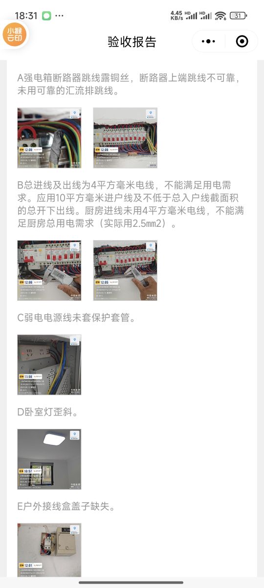 2.總進線及出線為4平方毫米電線不滿足用電需求,應(yīng)使用10平方毫米進戶線及不低于總?cè)绾山孛娣e的總開下出線路,廚房進線為用4平方毫米電線,不能滿足廚房總用電需求(實際使用2.5平方毫米)