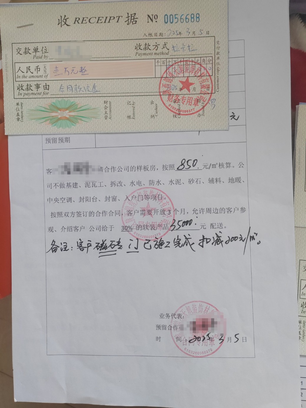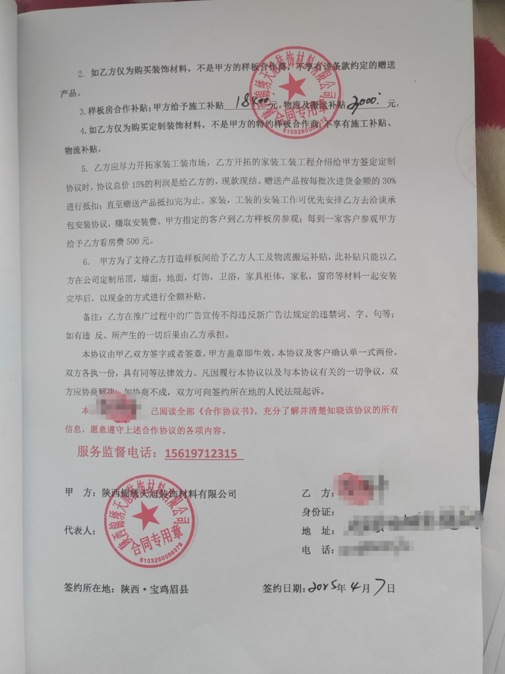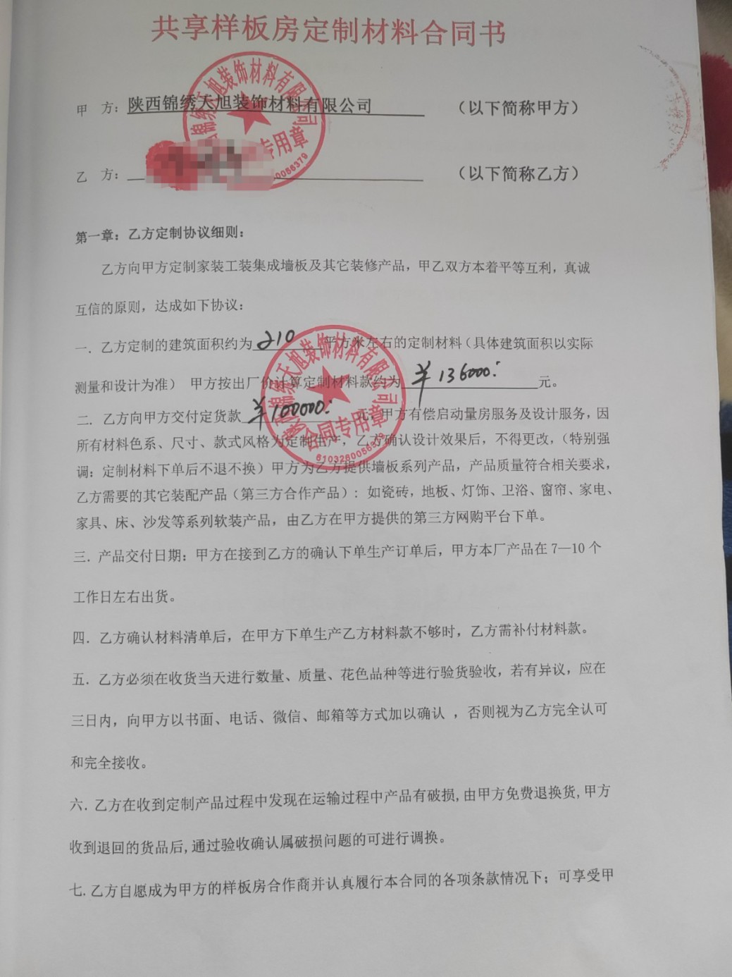 曝光陜西錦繡天旭裝修材料有限公司\n\n投訴時間:2025-06-16\n\n事發(fā)地區(qū):陜西省,寶雞市,眉縣\n\n涉及單位:陜西錦繡天旭裝修材料有限公司\n\n地址;陜西省寶雞市眉縣首善街道美陽街西段寶深機(jī)械集團(tuán)有限公司南廠22號\n\n今年 3 月初,我在抖音刷到陜西錦繡天旭裝修材料有限公司的廣告,“全屋整裝,硬裝軟裝全包,還送家電,工期短,拎包入住” 的宣傳極具吸引力,我留下了聯(lián)系方式。此后,公司業(yè)務(wù)員頻繁通過微信、電話熱情邀請我前往考察。\n\n2025 年 3 月 1 日,我來到該公司工廠,葉經(jīng)理親自接待,并帶我參觀樣板房他還表示工廠正在征集樣板間,有活動,同時口頭承諾:除水電改造、沙子水泥費(fèi)用由我自行承擔(dān)外,其余裝修工程均由工廠負(fù)責(zé);贈送價值 3.5萬元的軟裝、家具、家電、燈飾及衛(wèi)浴產(chǎn)品;公司承擔(dān) 它1.84萬元人工費(fèi).3000元物流費(fèi)、搬運(yùn)費(fèi)等全部費(fèi)用;此外,我還能獲得 10% - 15% 的業(yè)務(wù)提成,每帶一個客戶看房可享 500 元補(bǔ)貼,且絕無其他附加費(fèi)用。得知我家房子面積 210平報價13.6 萬元就能裝得跟樣板間一樣。\n\n3 月 5 日,我再次前往公司確認(rèn)這些承諾,得到肯定答復(fù)后,我簽訂了 10000 元定金合同。4 月 7日,公司以 “工期耽誤太久” 為由,催促我盡快交費(fèi)。在對方勸說下,我又通過支付寶支付了 4 萬元。當(dāng)時簽訂的 “材料合同” 并非正規(guī)制式合同,如今回想,這正是陷阱的開端。王旭工廠隨后告知我補(bǔ)齊合同款,否則材料發(fā)下出來,無奈我又于5.15日補(bǔ)付了50000元,隨后僅發(fā)來墻板、地磚、吊頂?shù)然A(chǔ)材料,人工和物流費(fèi)用以及所需輔材卻讓我先行墊付,承諾后期返還。然而,裝修到定制柜子階段時,對方告知費(fèi)用已用完,要求我再付款才繼續(xù)施工,此時我才徹底醒悟,這家公司根本不是做裝修的,前期的全包承諾、補(bǔ)貼、贈送等,全是為了誘導(dǎo)我簽約,實則是材料購銷合同高價賣材料欺負(fù)老百姓看不懂合同。\n\n所謂的樣板房效果、軟裝贈送,以及實報實銷的費(fèi)用承諾,都成了空話。截至目前,我不僅承擔(dān)了水泥、沙子、水電改造、砸墻等費(fèi)用 8000余元,還墊付人工費(fèi)、物流費(fèi)及各類輔材費(fèi) 59333元。加上給公司支付的定金 10000 元、4月 7日的 40000 元、5 月 15日的 50000 元合計支付給該公司10萬整,房子僅裝修三分之一,我就已累計支出 167333余元,卻只收到少量基礎(chǔ)裝修材料。\n\n希望我的教訓(xùn)能給大伙提個醒,裝修千萬別圖省事,多打聽多對比,別像我一樣,錢花了家還沒裝好。同時也懇請有關(guān)部門出面處理。