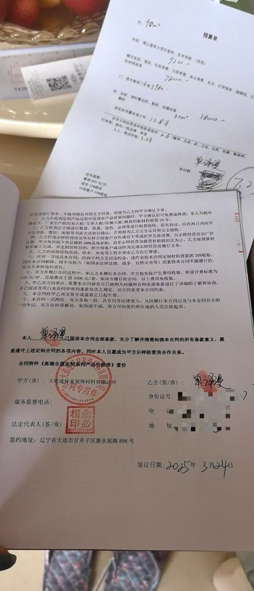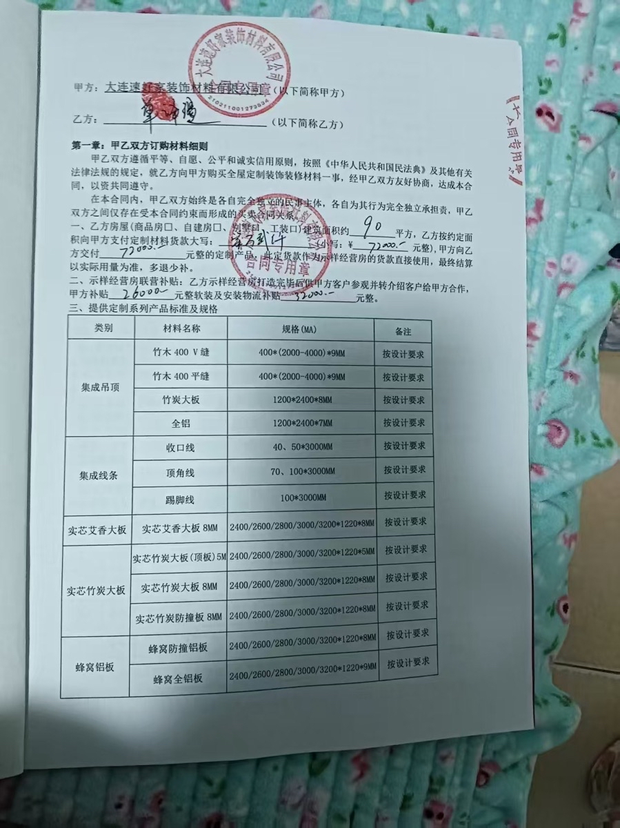 2025年3月份,我在抖音上瀏覽到了全屋定制的視頻,并留下聯(lián)系方式。隨后,大連速好裝材料有限公司的客服人員主動添加我的微信,頻繁來電推薦他們的產品。他們聲稱相較于傳統(tǒng)裝修更加省錢省時,除了水電我們自己承擔之后其他都他們全包。于3月24日我最終決定前往他們的工廠參觀考察,并在客服的熱情接待下,被他們的產品介紹和優(yōu)惠力度所吸引。并繳了10000元意向金,,4月15日又繳了2.6萬并簽訂了合同,談好后最終以7.2萬談好品質不變,6月13號后該公司又以需要做材料為由又讓我繳納了3.1萬元材料款,不繳錢不讓卸貨,運費還讓我墊付2100,送過來的材料連生產日期,批號,合格證都沒有,和我當時在他們公司看的完全世兩回事,現(xiàn)在對方卻拿合同說事,我是在他們打馬虎眼的情況下簽的合同,其實該公司就是高價買材料的公司,材料高于市場價好幾倍,。該公司在明知我真實需求是全屋裝修的情況下,通過口頭承諾制造 “包工包料” 的假象,誤導我認為是全包服務,最終欺詐我簽訂材料購銷合同以謀取暴利。