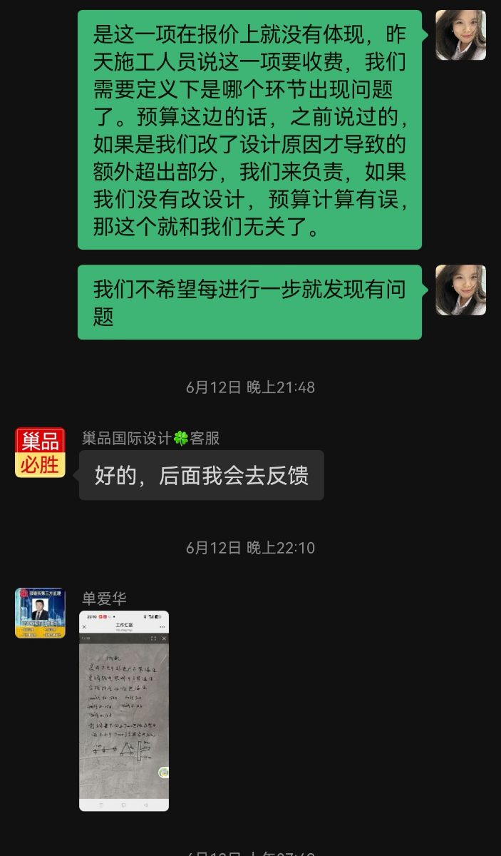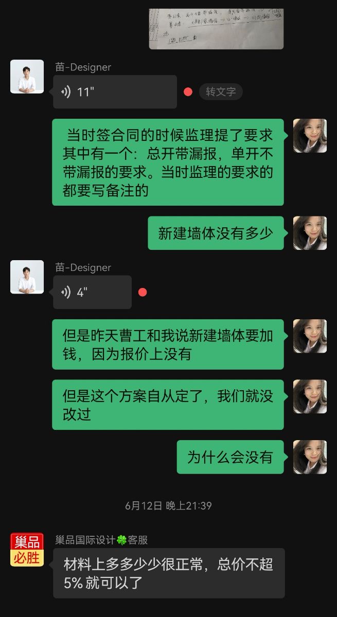 4、之前簽單前溝通過如果設(shè)計(jì)不改,由于他們內(nèi)部計(jì)算價(jià)格的問題這部分差價(jià)不應(yīng)該我們承擔(dān)。后期居然告訴我們新建墻體需要收錢。新建墻體這一部分是本身設(shè)計(jì)里就有的