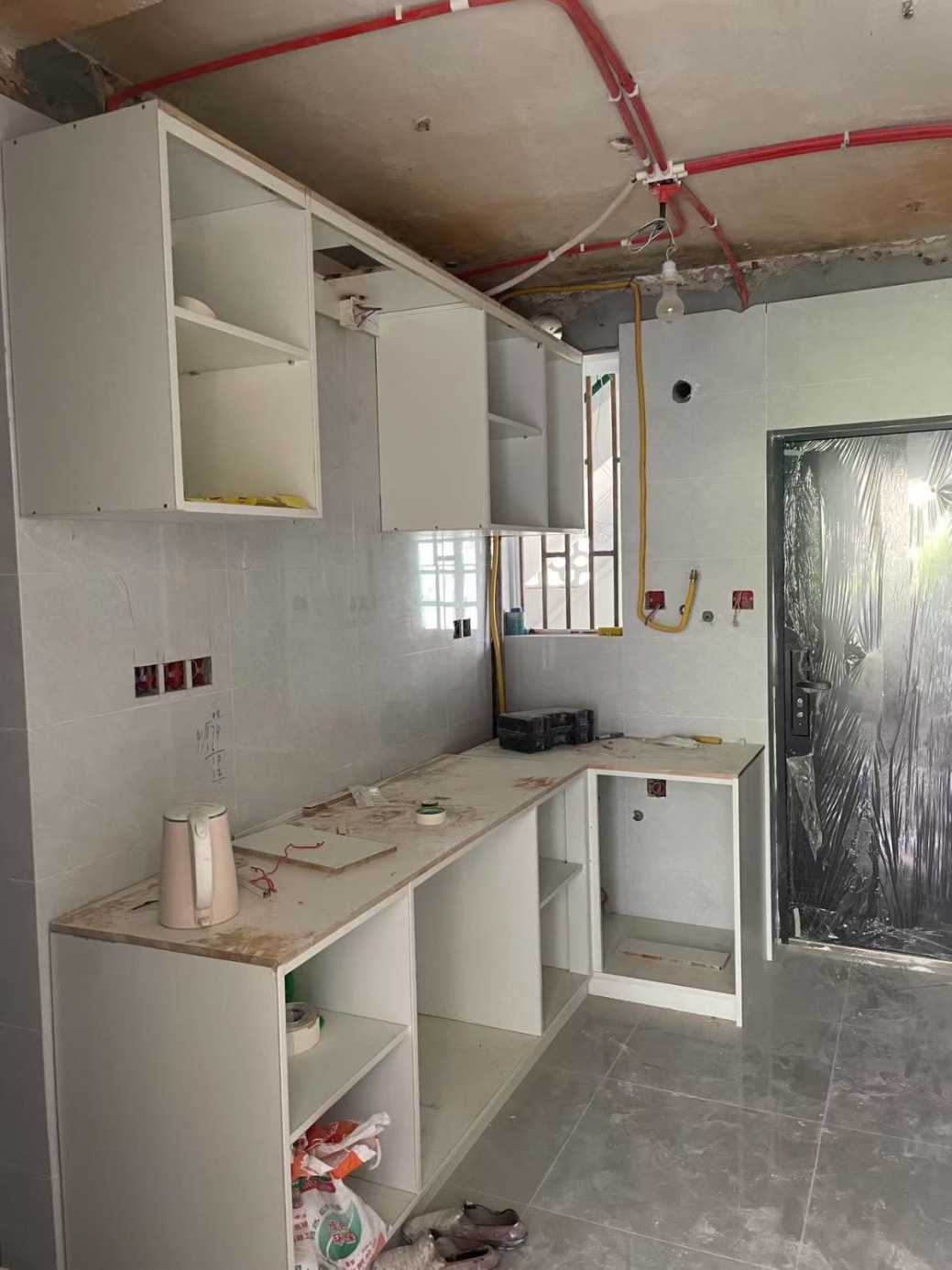 合同約定3月31日完工,目前已經(jīng)拖延整整3個月。還有廚衛(wèi)的集成吊頂、所有房間的開關(guān)和插座、進戶的強弱電箱、空調(diào)打洞、地板、門等等都沒做。