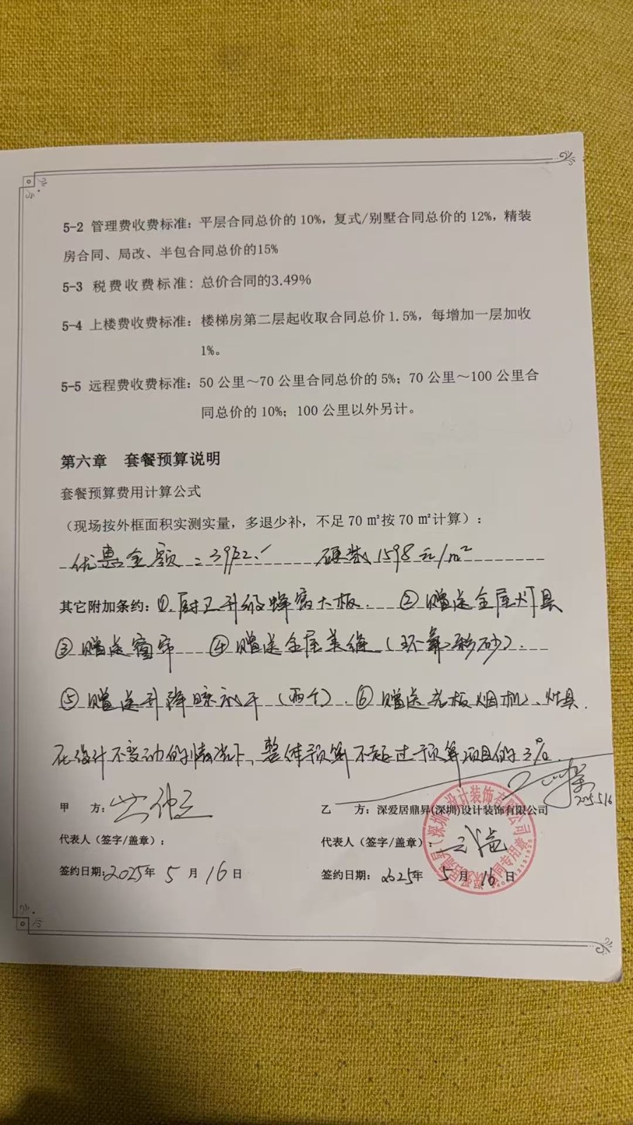 5 月 16 日,我前往深愛(ài)居鼎昇(深圳)設(shè)計(jì)裝飾有限公司。一到公司,銷售與設(shè)計(jì)師便熱情相迎,他們火力全開,把公司描繪得近乎完美,什么服務(wù)貼心、質(zhì)量過(guò)硬、口碑極佳,說(shuō)得天花亂墜。他們精準(zhǔn)拿捏我圖省事省心的心理,不斷誘導(dǎo)我簽訂合同。不僅承諾材料可以自由挑選,還有物品贈(zèng)送,更是信誓旦旦地表示,整體預(yù)算不會(huì)超過(guò)預(yù)算項(xiàng)目的 3%,還口頭保證絕無(wú)增項(xiàng),工程質(zhì)量絕對(duì)有保障。