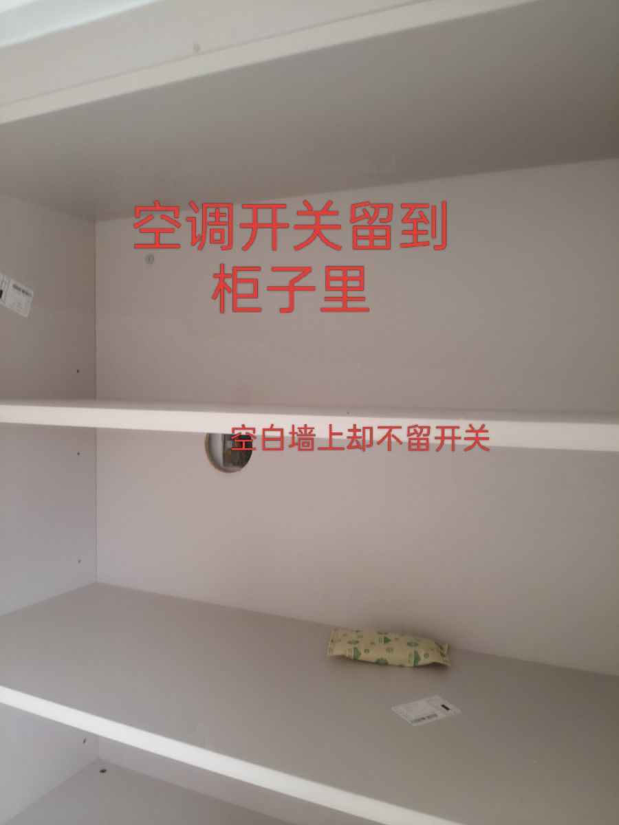 中途差錯:全屋定制多處錯誤和不合理之處,顏色搞錯,抽油煙機位置的潛入搞錯,次臥空調(diào)開關(guān)竟然留在全屋定制得書柜里,讓我們把空調(diào)裝柜子里嗎?就算有這種做法,是否應該提前與我們溝通?