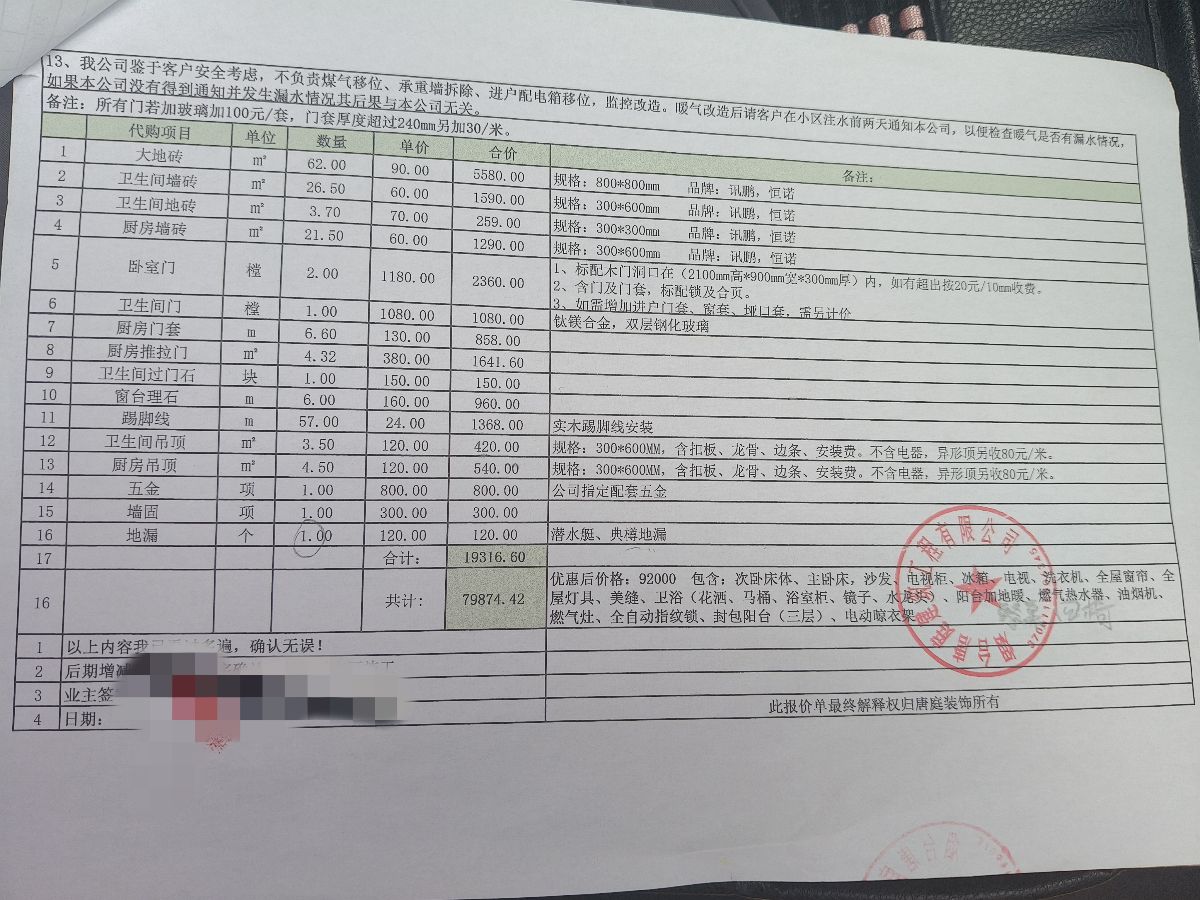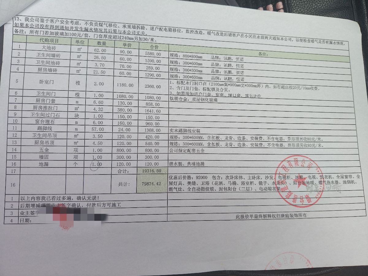 比如,宣稱先施工后付款,而合同的付款節(jié)點卻在工程量一半,家具家電,衛(wèi)浴,燈具窗簾等等全部未干的情況下,92000的合同款讓我們付完了91000,只剩1000選尾款,對我方權(quán)利毫無保障。