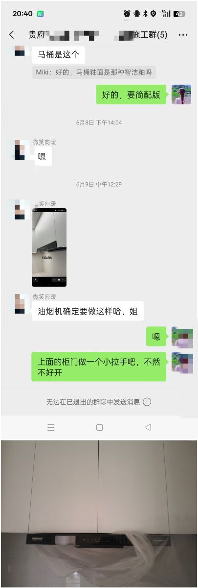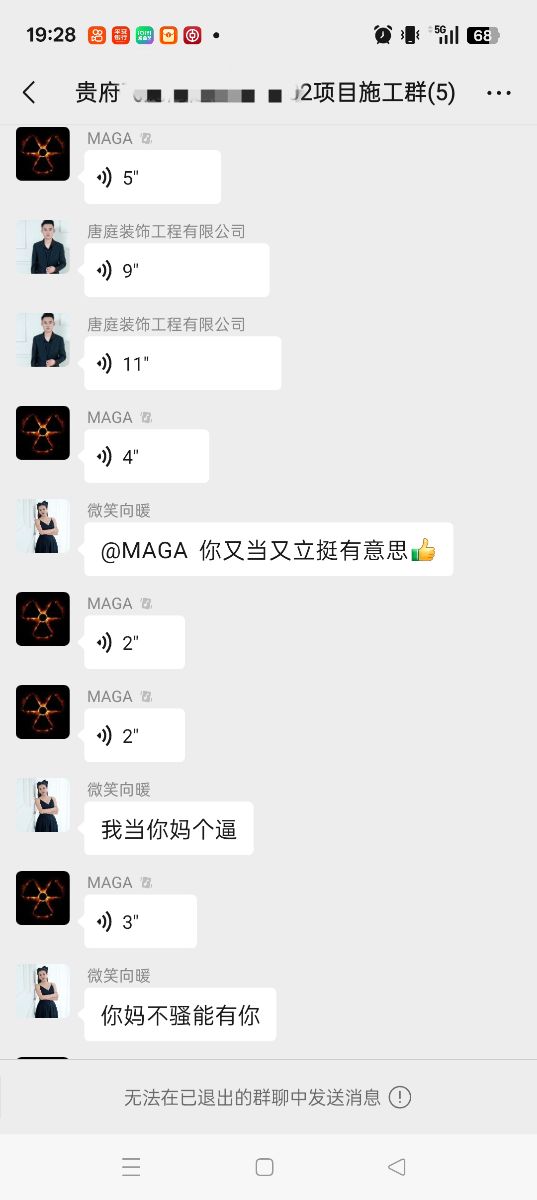 但對方在后面又矢口否認有此承諾,也就是在剩余約3萬元工程量時只給我們留1000元尾款,其余付清,再次威脅不付就停工。無奈,協(xié)商后給了6200答應先進家具,衛(wèi)浴等,但是等了幾天我問家具物流時,對方又再次要錢,稱不付清就不訂,且再一次威脅停工,我方如果按他要求付清,那我們后續(xù)將近2萬元的工程量未干,毫無保障,于是他惱羞成怒,各種威脅且辱罵,并把我們?nèi)坷趧h除,移出群聊。
