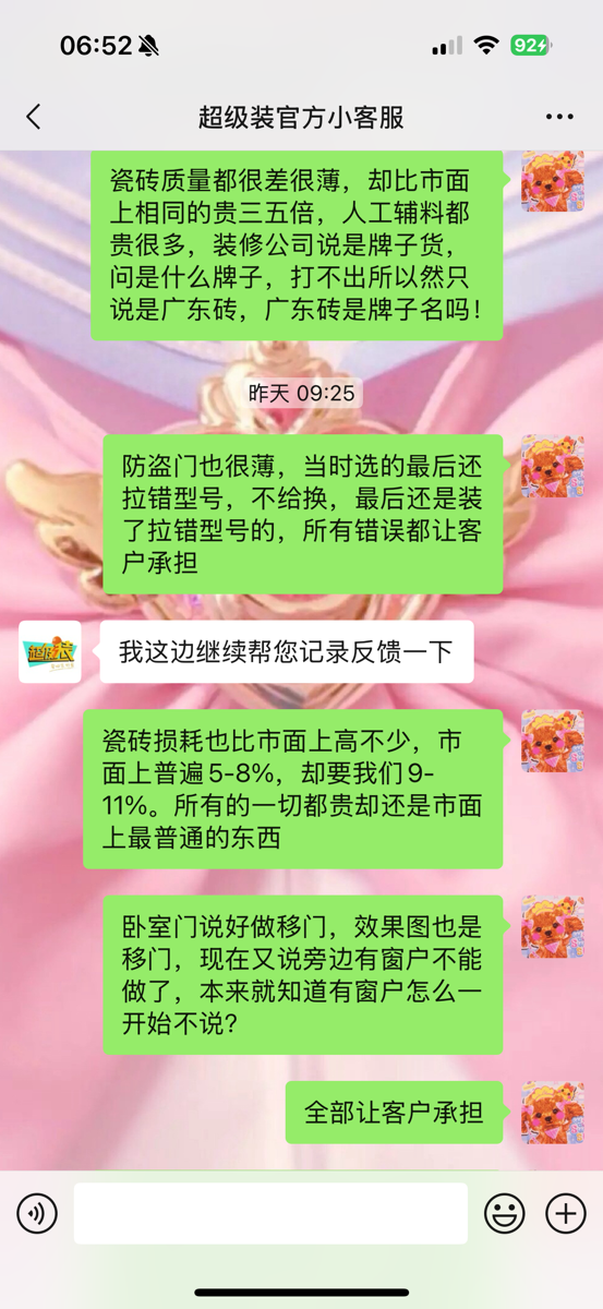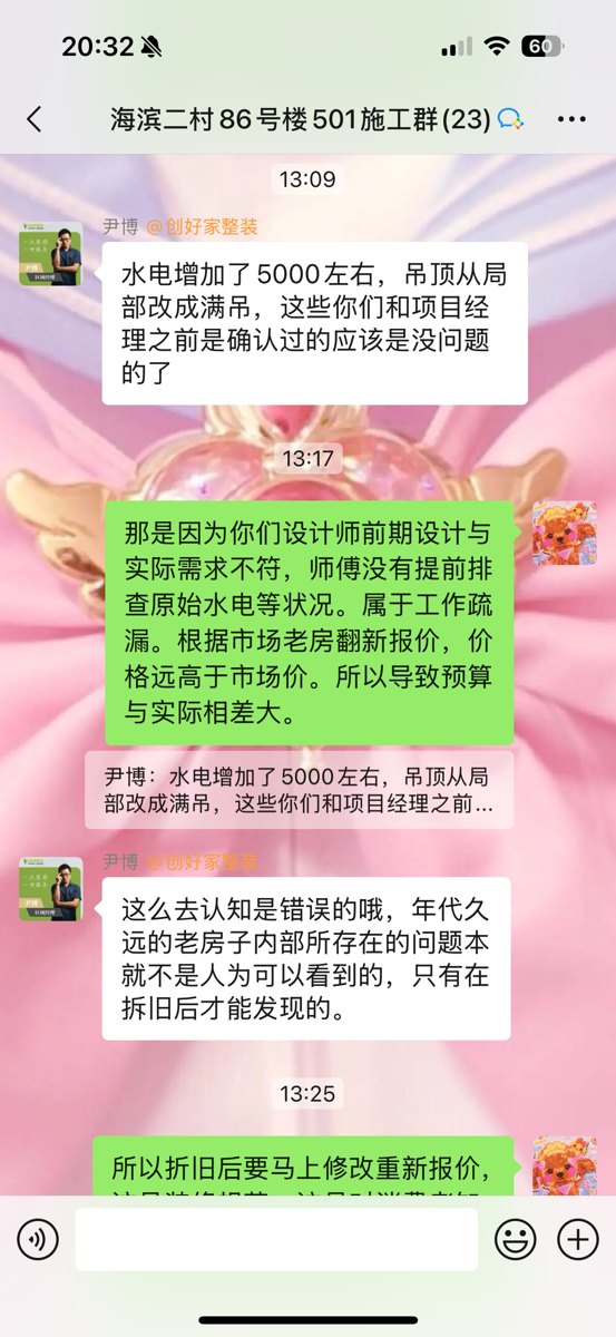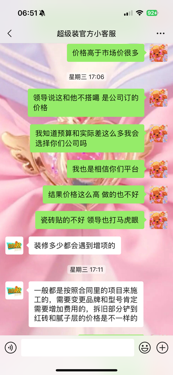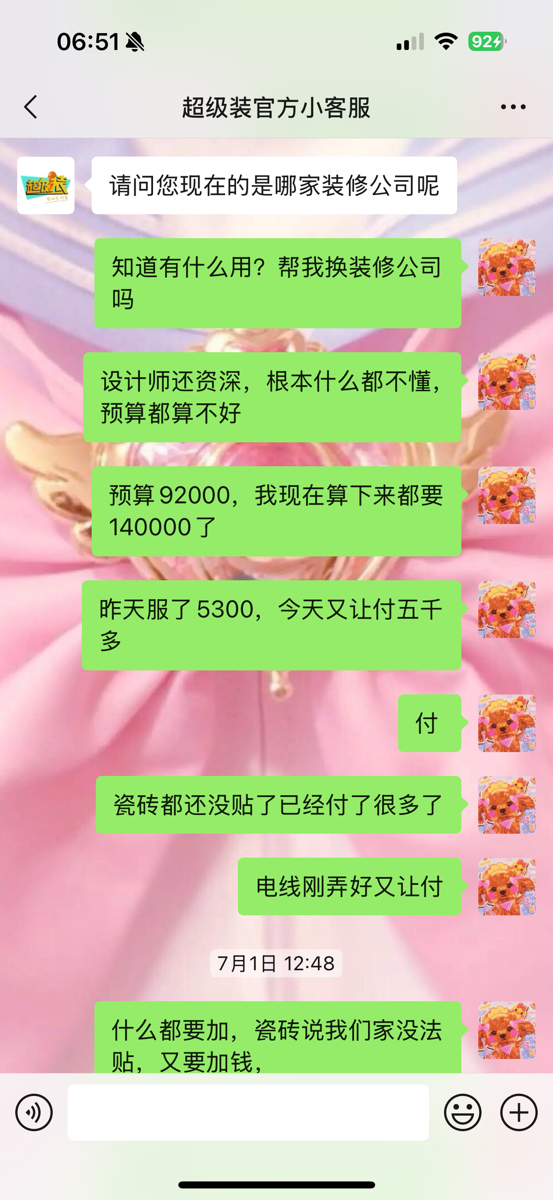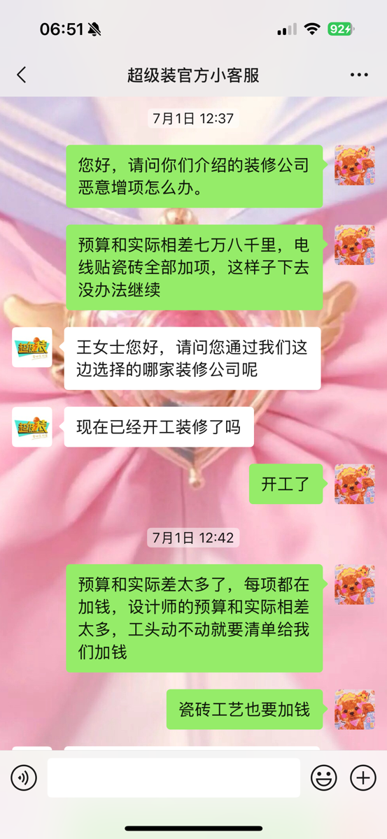 設(shè)計(jì)師前期設(shè)計(jì)與實(shí)際需求不符,拆舊后,應(yīng)當(dāng)立即修改重新報(bào)價(jià),這是裝修規(guī)范,這是對(duì)消費(fèi)者知情權(quán)的保障,是必要流程,而不是讓消費(fèi)者被蒙在鼓里。師傅也沒(méi)有提前排查原始水電等狀況,屬于工作疏漏。根據(jù)市場(chǎng)老房翻新報(bào)價(jià),價(jià)格遠(yuǎn)高于市場(chǎng)價(jià)。所以導(dǎo)致預(yù)算與實(shí)際相差大。如不做增項(xiàng)就影響工期,到頭來(lái)也是我們消費(fèi)者承擔(dān),裝修公司工人技術(shù)有限,價(jià)格高,一切都要用增項(xiàng)解決問(wèn)題,不為消費(fèi)者考慮,視消費(fèi)者的預(yù)算不顧,不按照裝修行規(guī)及時(shí)更改預(yù)算等,逃避責(zé)任,不顧消費(fèi)者的權(quán)益,一切都要消費(fèi)者承擔(dān)風(fēng)險(xiǎn)。比如瓷磚貼不好怪房子裝修公司領(lǐng)導(dǎo)怪房子情況不同,但好的技術(shù)好的瓷磚質(zhì)量哪怕房子是歪的都可以貼好,損耗要了我們9%-12%都高于市場(chǎng)很多了也貼不好?不是有名的瓷磚品牌,價(jià)格讓我們消費(fèi)者不要與線上比較?視我們消費(fèi)者預(yù)算不顧,明知最普通的瓷磚在線上也有,也不告知,讓我們高價(jià)線下購(gòu)買,還一次次的補(bǔ)磚,讓我們消費(fèi)者一步步走進(jìn)價(jià)格的陷阱。都做到這了難道停下?消費(fèi)者后知后覺(jué),承擔(dān)的風(fēng)險(xiǎn)越來(lái)越大。