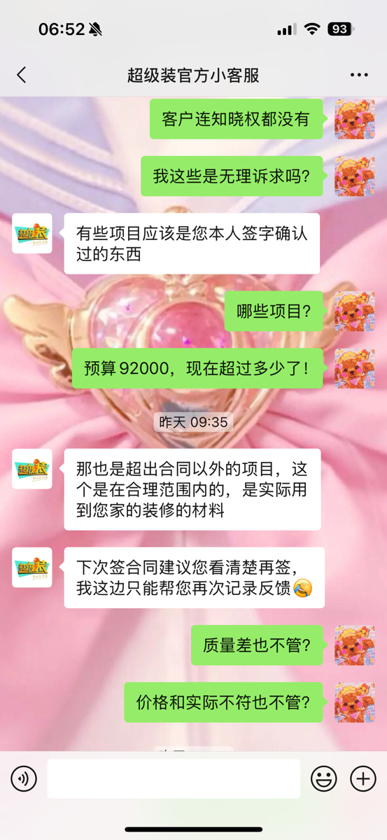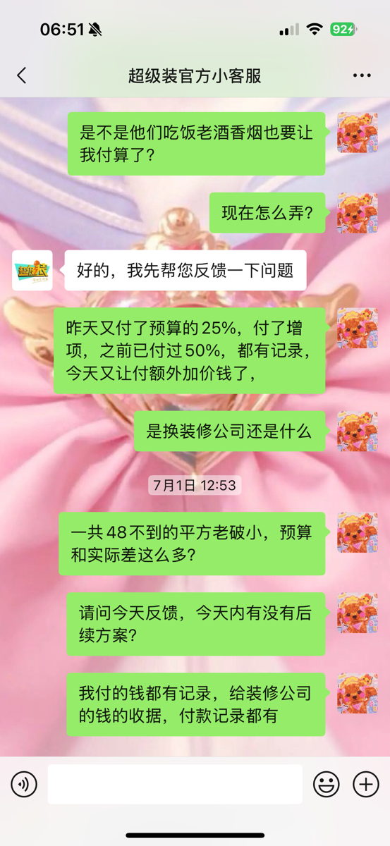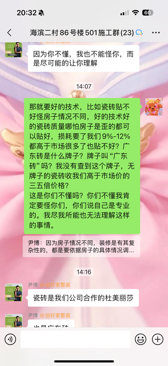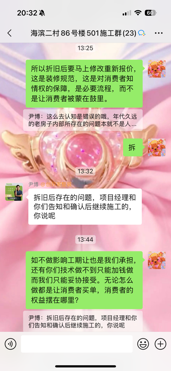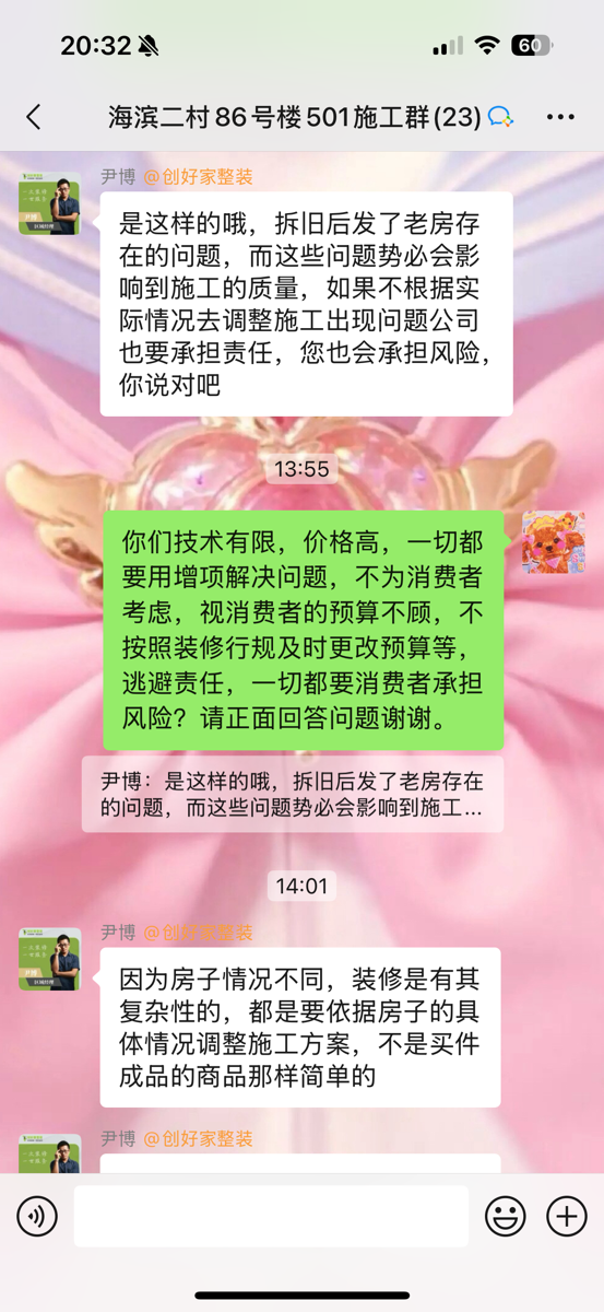 設(shè)計(jì)師前期設(shè)計(jì)與實(shí)際需求不符,拆舊后,應(yīng)當(dāng)立即修改重新報(bào)價(jià),這是裝修規(guī)范,這是對(duì)消費(fèi)者知情權(quán)的保障,是必要流程,而不是讓消費(fèi)者被蒙在鼓里。師傅也沒(méi)有提前排查原始水電等狀況,屬于工作疏漏。根據(jù)市場(chǎng)老房翻新報(bào)價(jià),價(jià)格遠(yuǎn)高于市場(chǎng)價(jià)。所以導(dǎo)致預(yù)算與實(shí)際相差大。如不做增項(xiàng)就影響工期,到頭來(lái)也是我們消費(fèi)者承擔(dān),裝修公司工人技術(shù)有限,價(jià)格高,一切都要用增項(xiàng)解決問(wèn)題,不為消費(fèi)者考慮,視消費(fèi)者的預(yù)算不顧,不按照裝修行規(guī)及時(shí)更改預(yù)算等,逃避責(zé)任,不顧消費(fèi)者的權(quán)益,一切都要消費(fèi)者承擔(dān)風(fēng)險(xiǎn)。比如瓷磚貼不好怪房子裝修公司領(lǐng)導(dǎo)怪房子情況不同,但好的技術(shù)好的瓷磚質(zhì)量哪怕房子是歪的都可以貼好,損耗要了我們9%-12%都高于市場(chǎng)很多了也貼不好?不是有名的瓷磚品牌,價(jià)格讓我們消費(fèi)者不要與線上比較?視我們消費(fèi)者預(yù)算不顧,明知最普通的瓷磚在線上也有,也不告知,讓我們高價(jià)線下購(gòu)買,還一次次的補(bǔ)磚,讓我們消費(fèi)者一步步走進(jìn)價(jià)格的陷阱。都做到這了難道停下?消費(fèi)者后知后覺(jué),承擔(dān)的風(fēng)險(xiǎn)越來(lái)越大。