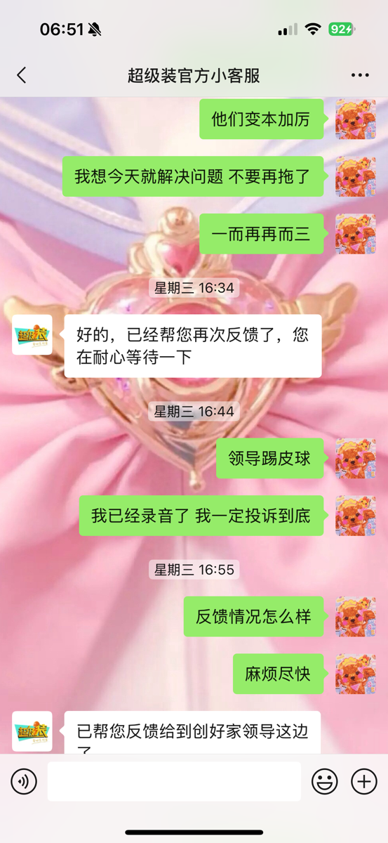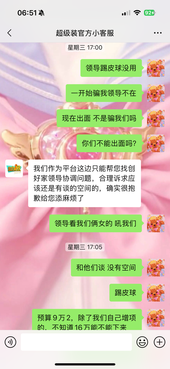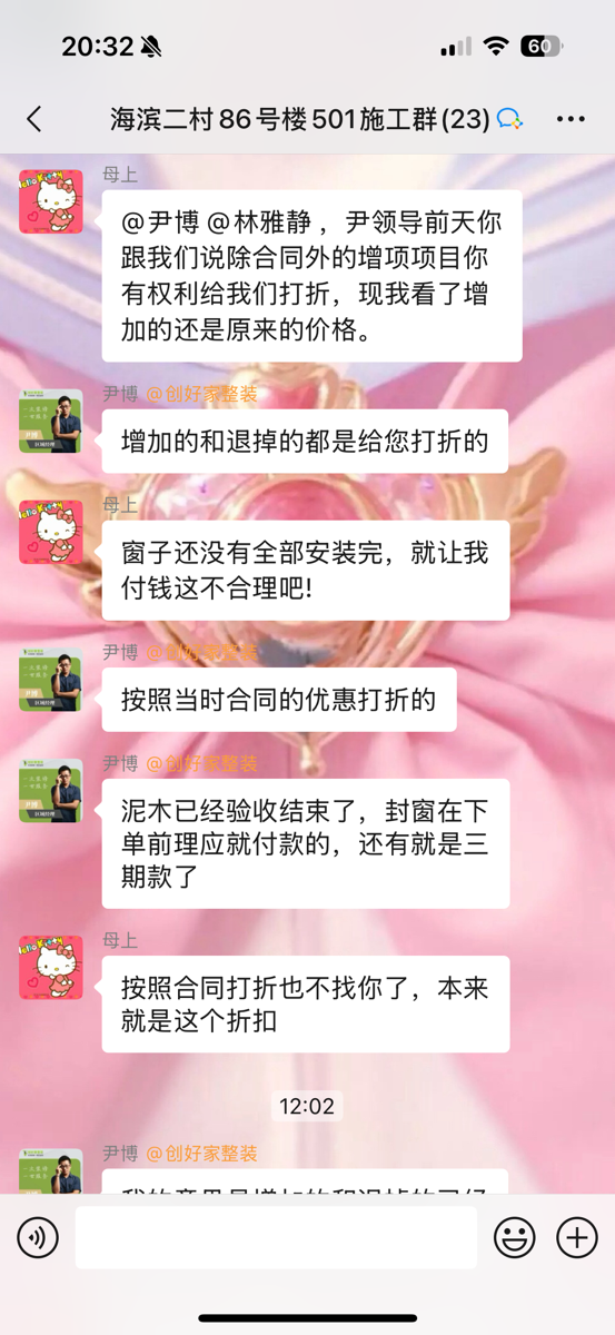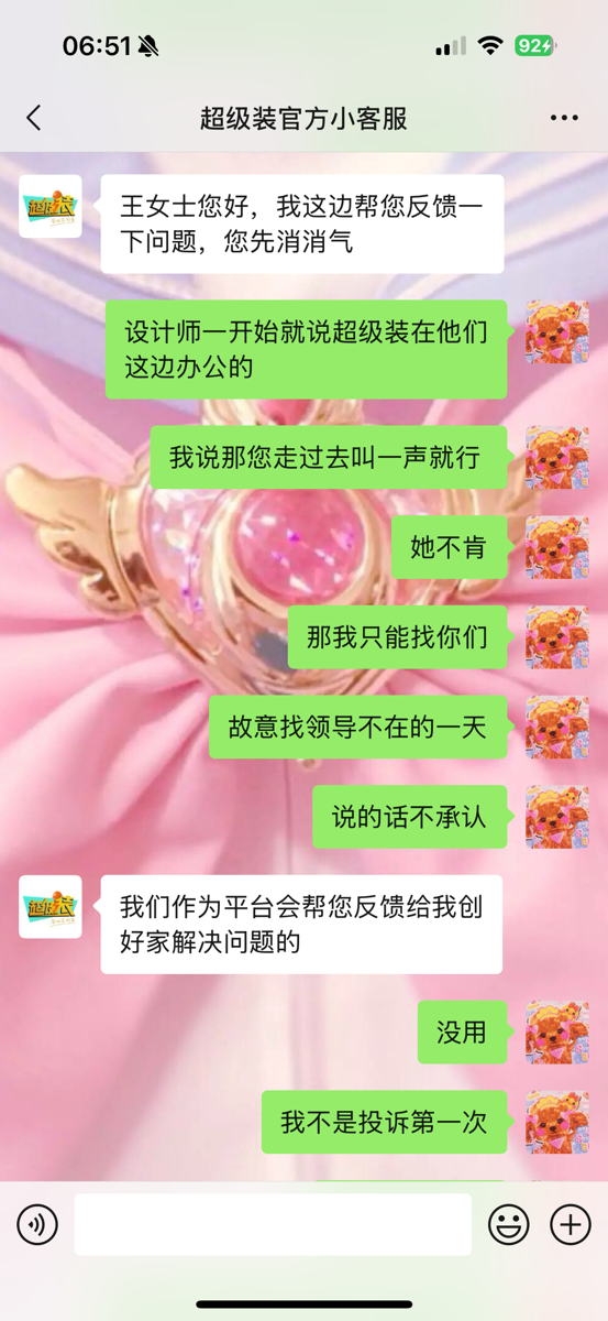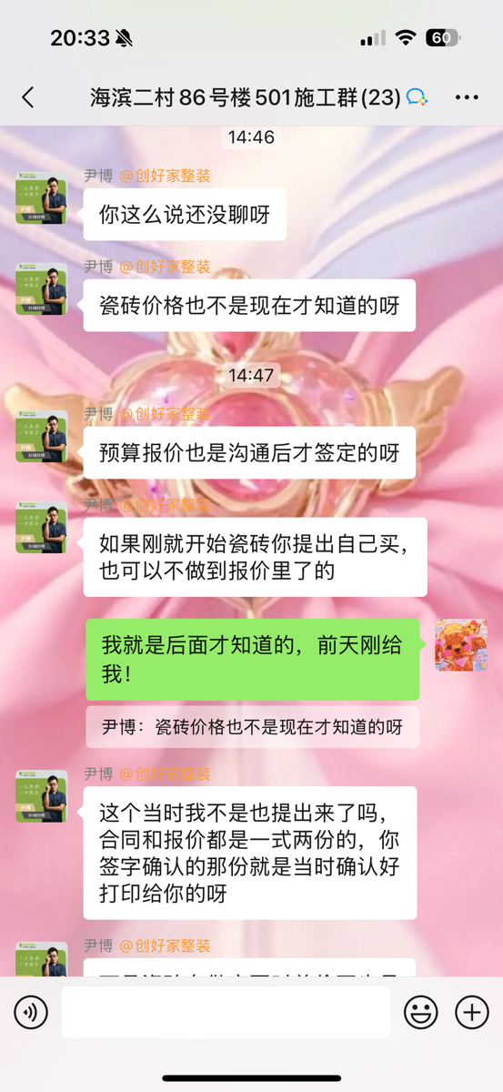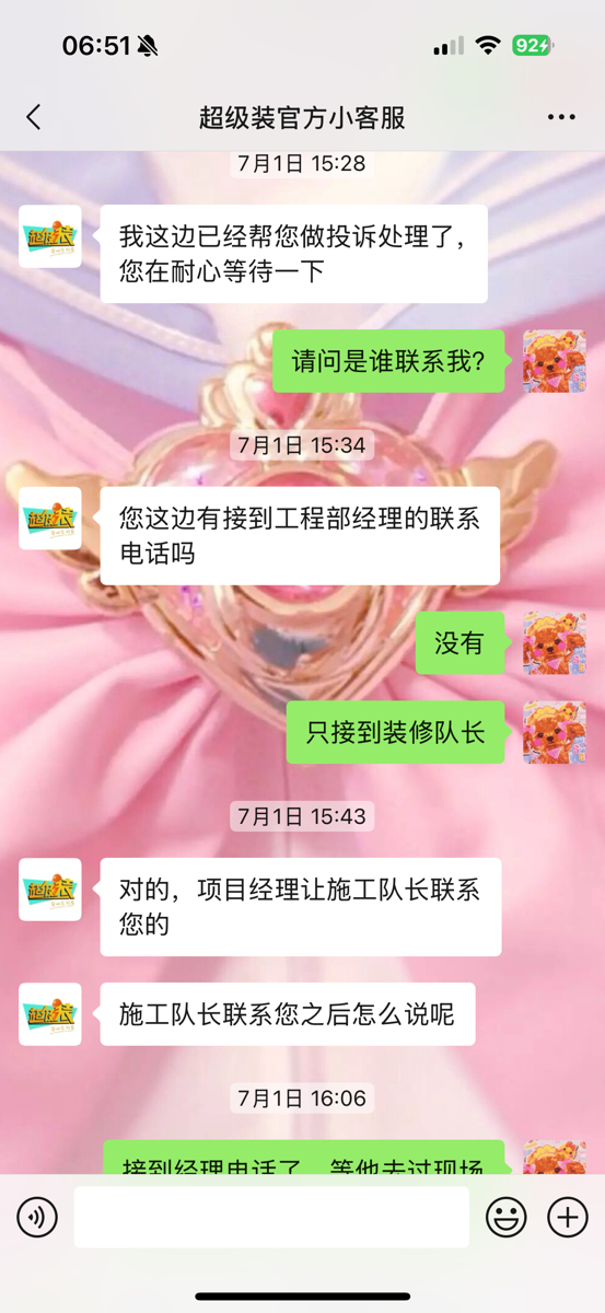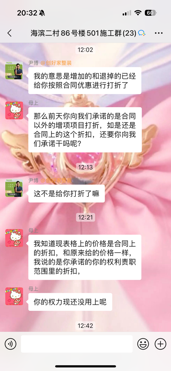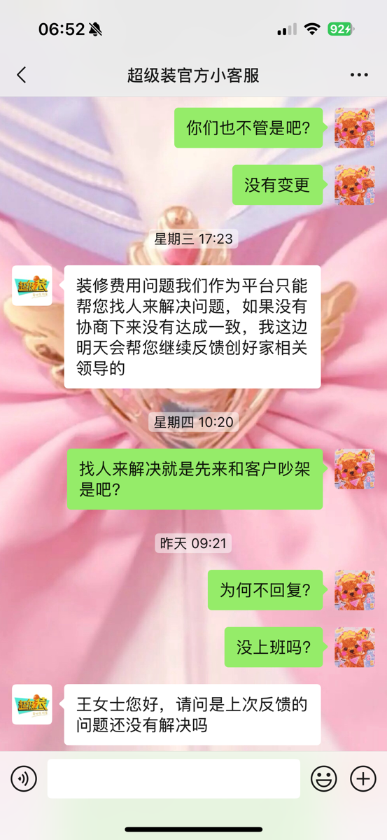 我通過(guò)上海超級(jí)裝平臺(tái)欄目,和創(chuàng)好家裝修公司簽訂裝修合同,裝修過(guò)程中出現(xiàn)各種問(wèn)題需要解決,比如價(jià)格高質(zhì)量差,設(shè)計(jì)師不給半包外的其它明細(xì),裝修過(guò)程中常出現(xiàn)錯(cuò)誤,增項(xiàng)多等。創(chuàng)好家裝修公司不解決,我請(qǐng)求超級(jí)裝平臺(tái)出面解決,客戶說(shuō)我只能反饋給創(chuàng)好家,其它沒(méi)有責(zé)任,并拒收我的電話。反饋后也沒(méi)有得到解決。