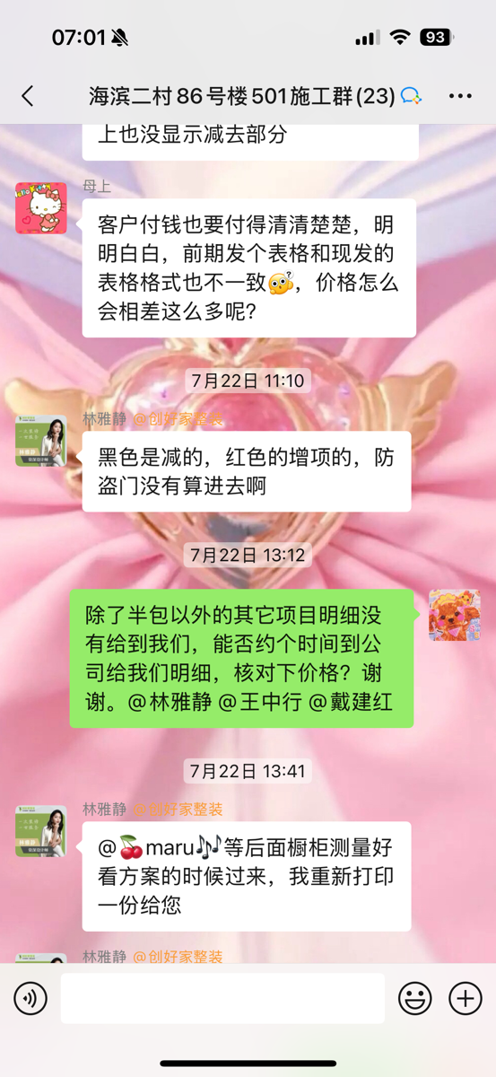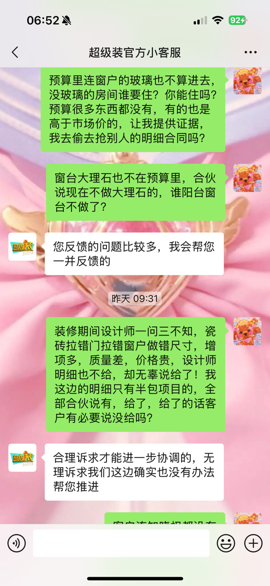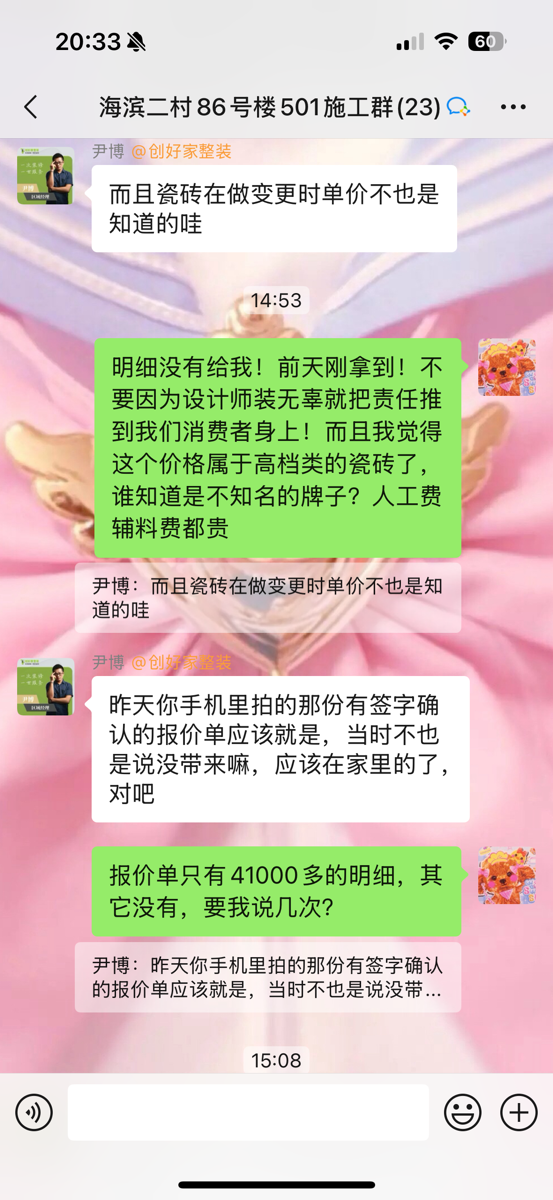 設(shè)計(jì)師不給明細(xì),屬于工作失職,也不符合裝修行規(guī)。到泥工木工結(jié)束階段了還是催促再三才肯給,在他們公司,設(shè)計(jì)師還在領(lǐng)導(dǎo)面前裝無(wú)辜說(shuō)給了,領(lǐng)導(dǎo)也冤枉消費(fèi)者說(shuō)給了,顛倒黑白,因不給明細(xì)導(dǎo)致消費(fèi)者在裝修過(guò)程中一直很被動(dòng),比如窗戶費(fèi)用明細(xì)沒(méi)有,告知我們預(yù)算里不含玻璃,沒(méi)有玻璃的窗戶算什么窗戶?比如瓷磚價(jià)格高于市場(chǎng)價(jià)很多,消費(fèi)者并不知情,并且一直補(bǔ)瓷磚補(bǔ)了幾次,價(jià)格一直在增加,都做到一半了難道不補(bǔ)?貼的也很粗糙,證明瓷磚質(zhì)量很一般工人技術(shù)也一般。所有的風(fēng)險(xiǎn)都要消費(fèi)者承擔(dān)。