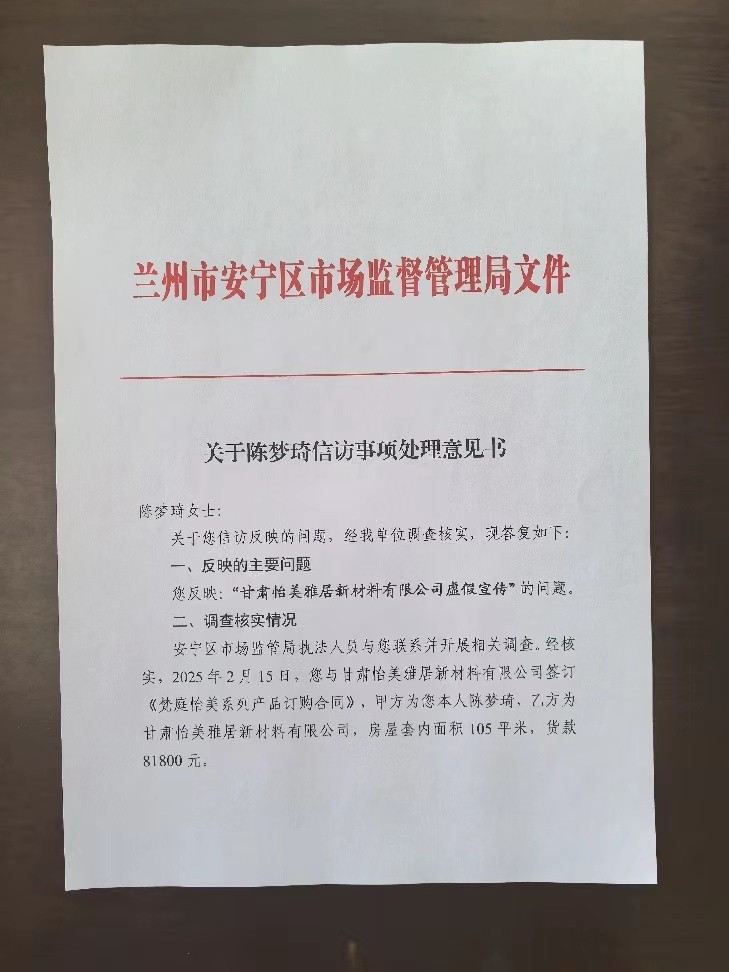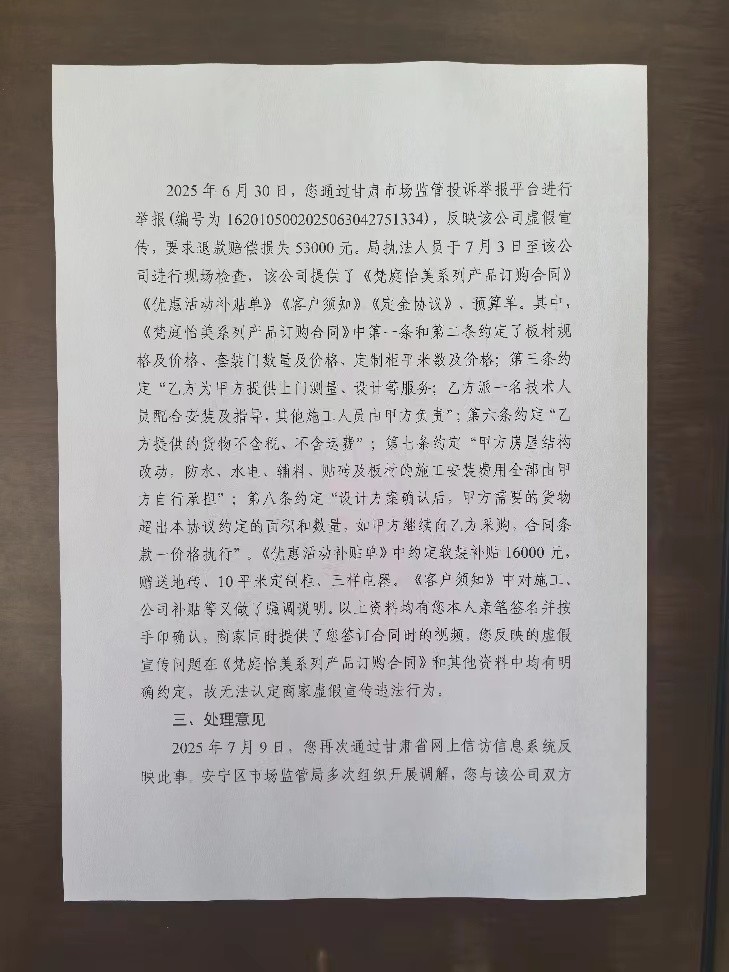 本人是在25年抖音廣告看到甘肅怡美雅居的虛假宣傳視頻,廣告語6萬就能裝好一套三室,拎包入住,后留下聯系方式工作人員邀請本人去線下參觀。通過公司吹噓他們的新型材料比傳統(tǒng)裝修更高級,更容易清潔還有20年的質保,一個月就裝好另贈送部分軟裝補貼基本達到入住條件,主要是便宜裝好11萬不到。