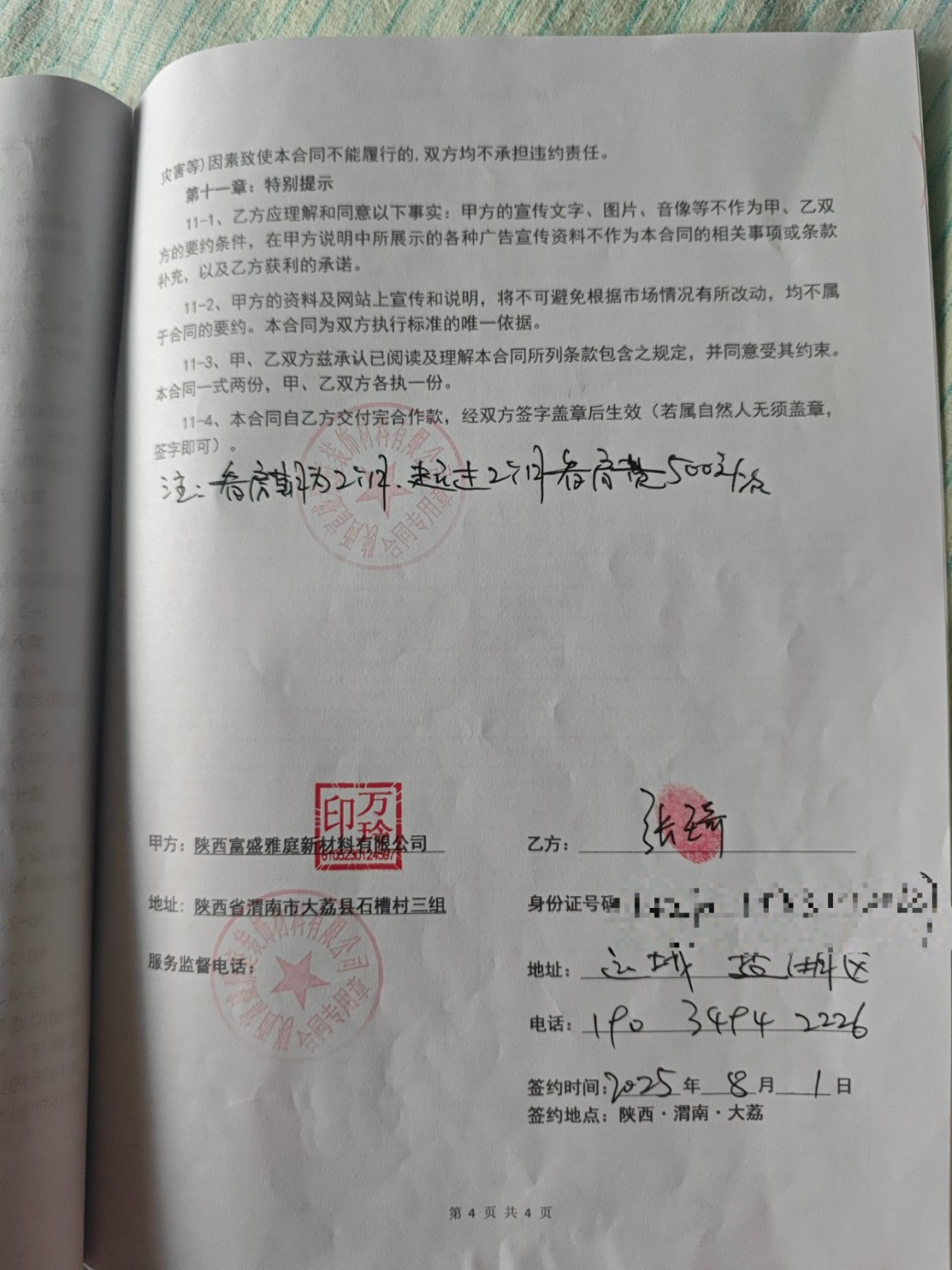 2025 年 3 月,我在抖音刷到陜西富盛雅庭裝飾材料有限公司(聯(lián)系人李穎)“全屋整裝拎包入住” 的廣告,被低價吸引。?