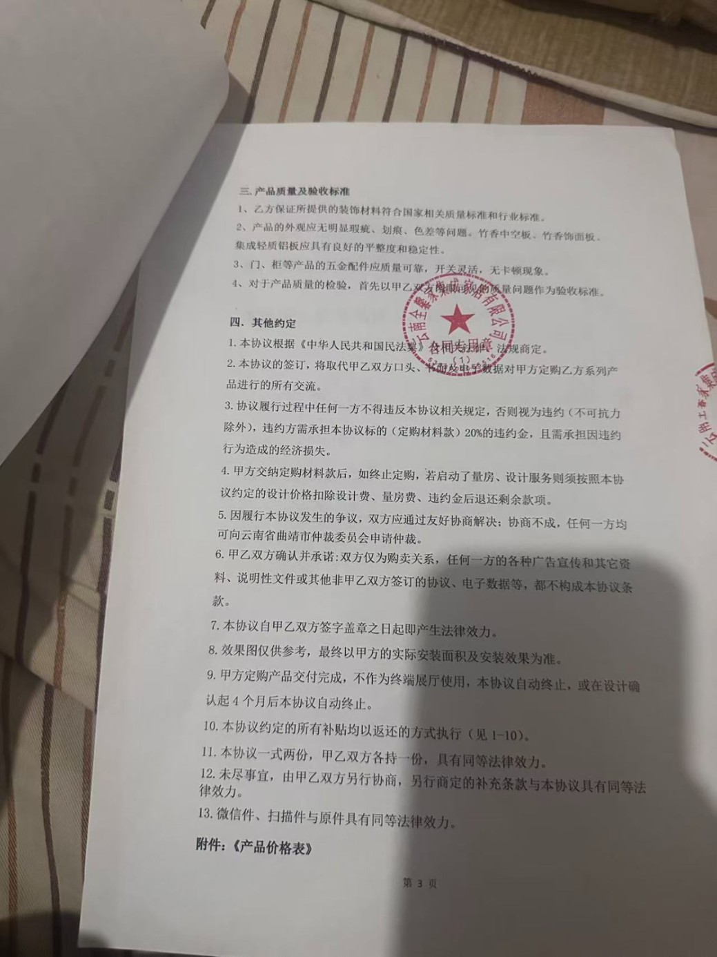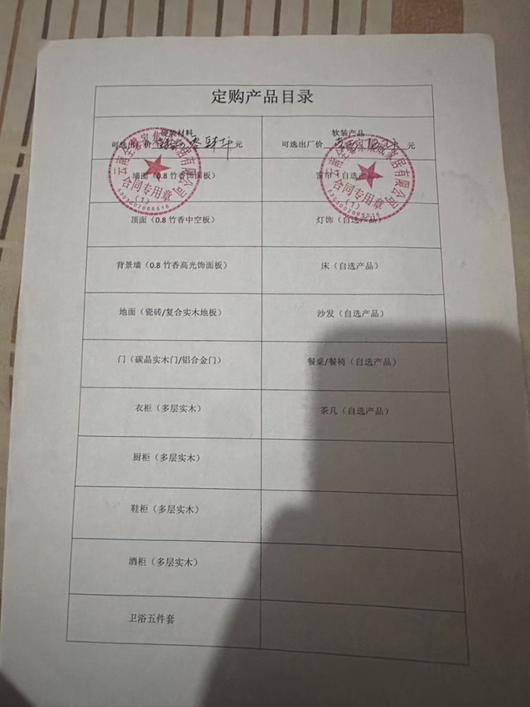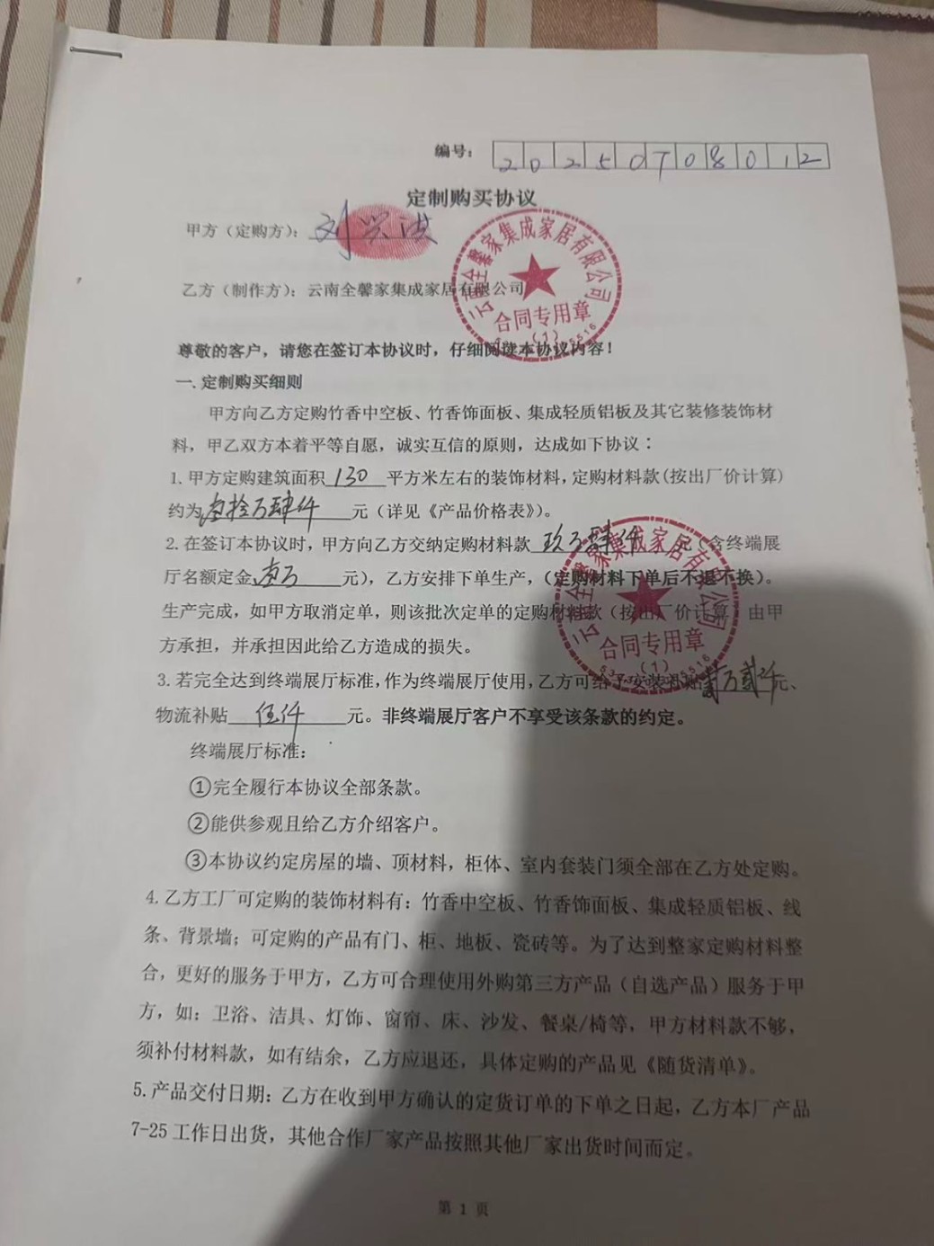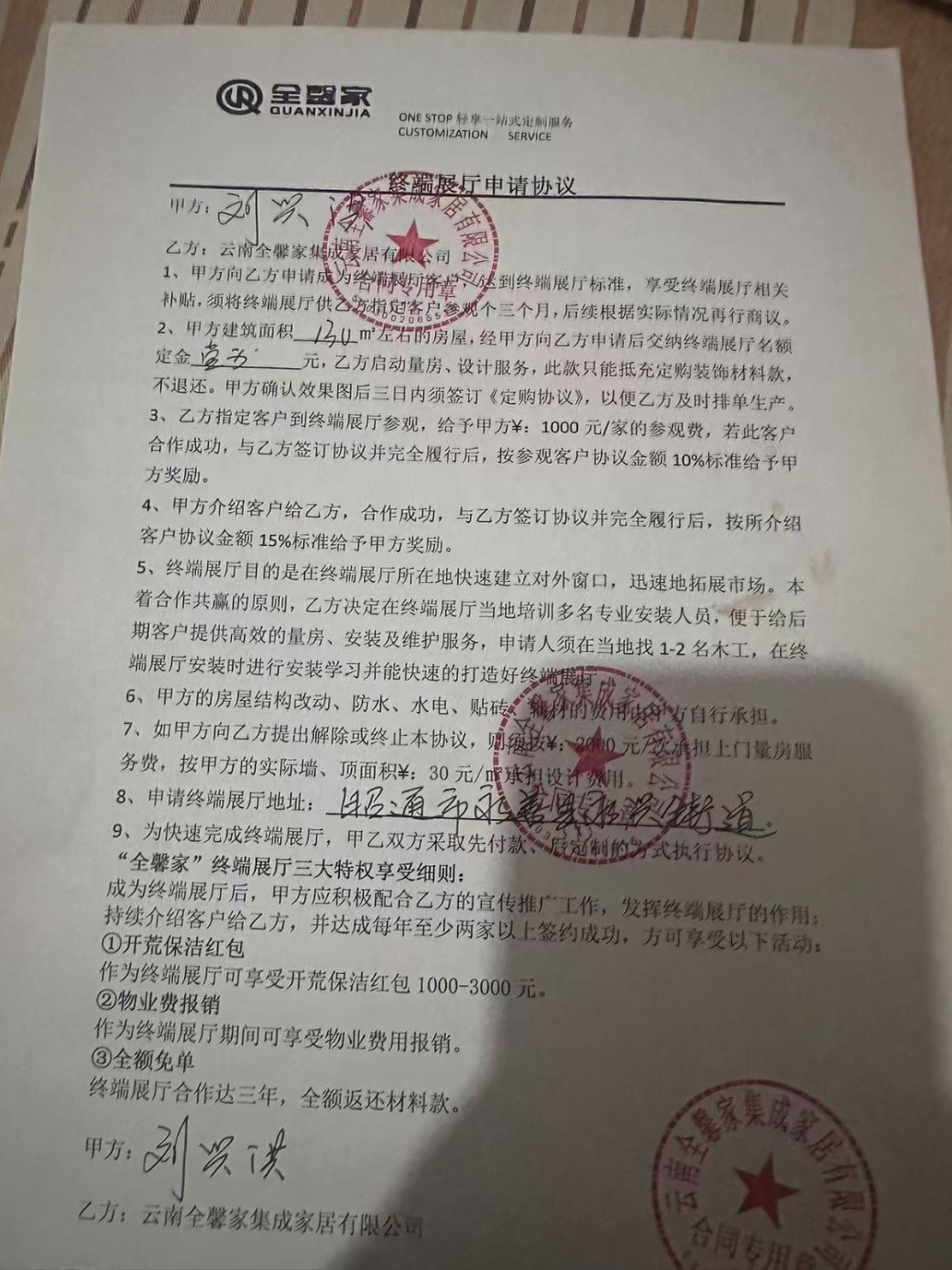2025年5月2日我們?nèi)说竭_(dá)工廠考察,接待我們的人自稱銷售總監(jiān)(姓張),他說960一個地平方面積(包含硬裝軟裝),我們提出不要地磚減去80元每平方。最后談成結(jié)果是880一個地平方(包含墻板,吊頂,燈具,衛(wèi)浴五件套,衣柜,沙發(fā),餐桌椅,茶幾,實木門,電動窗簾,推拉玻璃門),砸金蛋送600-800升的海爾冰箱,3匹美的客廳立柜式空調(diào),我們自行負(fù)責(zé)房屋結(jié)構(gòu)改動、封窗、水電、防水、貼地磚、輔材。然后簽訂終端展廳申請協(xié)議,交付定金一萬元之后我們便離開了。