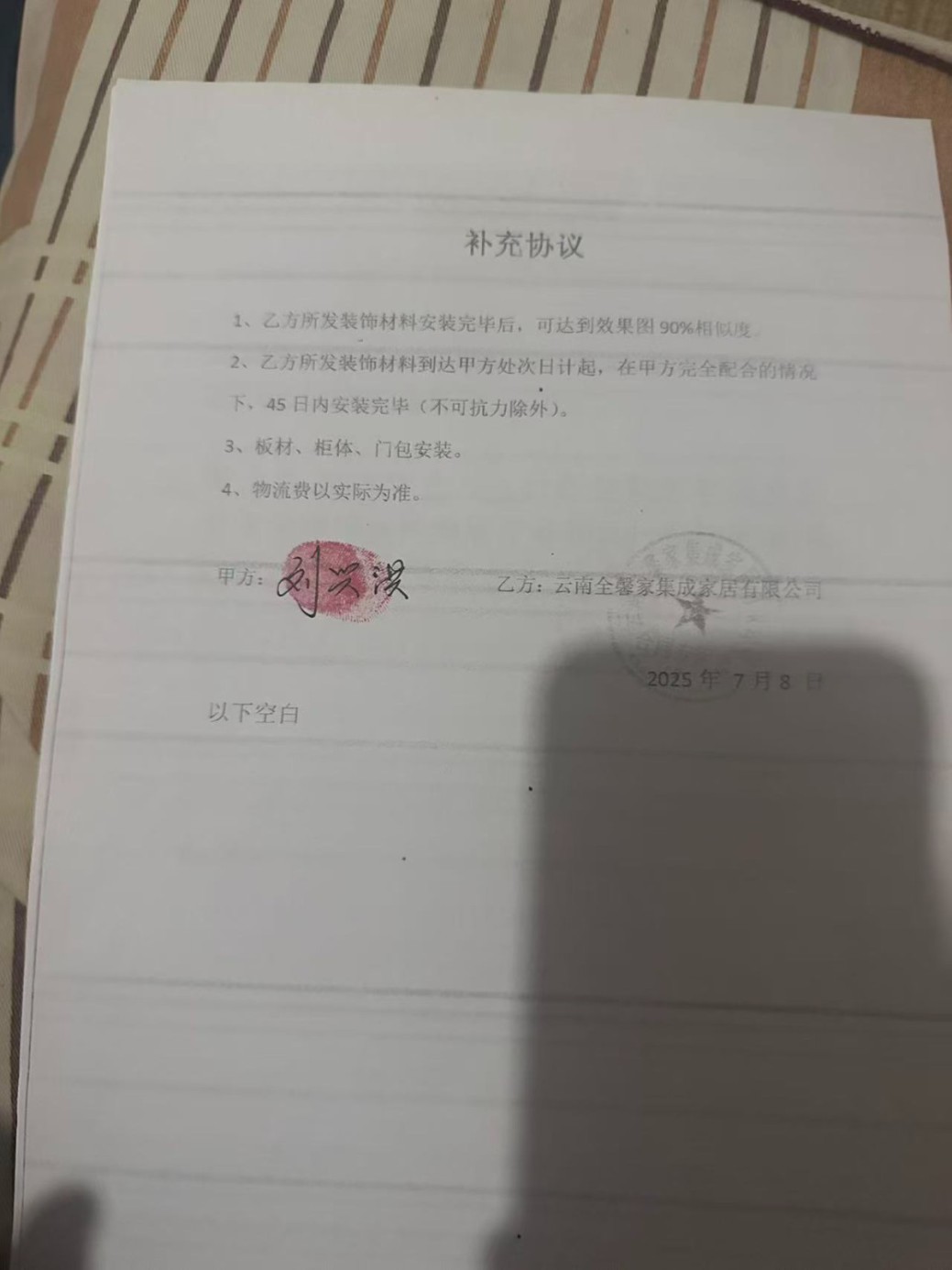 2025年7月8日張總監(jiān)協(xié)同一人(姓魏)來到我們當(dāng)?shù)貐f(xié)商簽訂協(xié)議,他口頭承諾簽訂契約開始45天內(nèi)裝修完工交房,超出裝修時間每天賠付1000-2000元,我們只需要墊付物流費(fèi)和工人搬運(yùn)費(fèi)用,他們公司派安裝人員來進(jìn)行安裝,我們反復(fù)確定總價104000元就能全部做下來直接拎包入住后續(xù)無任何其他費(fèi)用,工廠簽訂付款的10000元,這次需要付款84000元總款項百分之90剩余10000由裝修結(jié)束驗收之后付清。談妥之后我們便去了銀行匯款84000,張總監(jiān)和我一起到銀行收款人并非公司而是個人(姓舒),他們收到款項之后口頭承諾簽訂協(xié)議一個星期就能生產(chǎn)完墻板和吊頂材料,承諾實際裝修和設(shè)計圖相似度百分之90以上。隨后我們簽訂“定制購買協(xié)議”之后他們便離開。