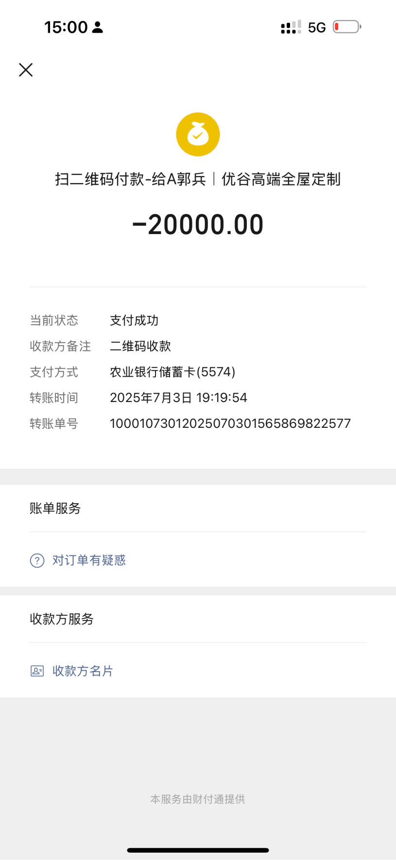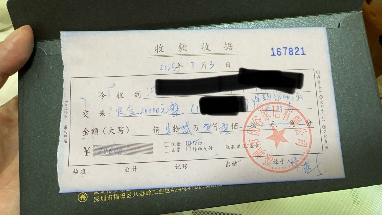 經(jīng)郭某再三邀請,7 月 3日,我前往該公司。銷售和老板全程熱情接待,拼命宣傳公司資歷深、口碑好,還抓住我們圖省事的心理,說能 “以不比市場價(jià)高,板材更高級”,承諾材料可挑、贈送多項(xiàng)物品,口頭保證絕無增項(xiàng)、工程有保障。期間他們反復(fù)強(qiáng)調(diào)他們交付落地的能力,以及郭某本人的設(shè)計(jì)能力,交 2萬定金就能按照我的預(yù)算給我出圖紙。就這樣,我們被誘導(dǎo)下給郭某私人微信掃碼了2萬元,郭某表示私人收款可少交點(diǎn)稅,對方只給了收據(jù),沒開發(fā)票。