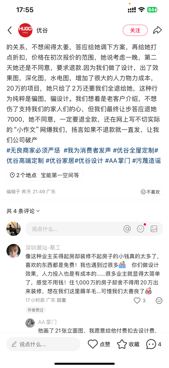 交定金前熱情似火,交完錢就失聯(lián),這樣的服務(wù)如何讓人信服?所謂的合理收費(fèi),預(yù)算內(nèi)落地更是廢話一句。這家毫無契約精神的公司,用虛假承諾、惡意增項(xiàng)、合同欺詐碾碎了消費(fèi)者的信任,還涉嫌偷稅漏稅。希望我的經(jīng)歷能讓大家避雷,選擇裝修公司一定要擦亮眼睛。