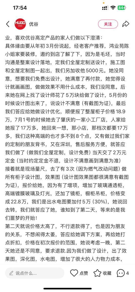 2025 年 7月上旬,經(jīng)熟人介紹,我添加了優(yōu)谷高端定制郭某的微信。簡單溝通裝修需求時(shí),我明確說了預(yù)算,對方一口承諾價(jià)格沒問題。現(xiàn)在想來,當(dāng)時(shí)那句 “沒問題”,竟成了我懊悔的開端。