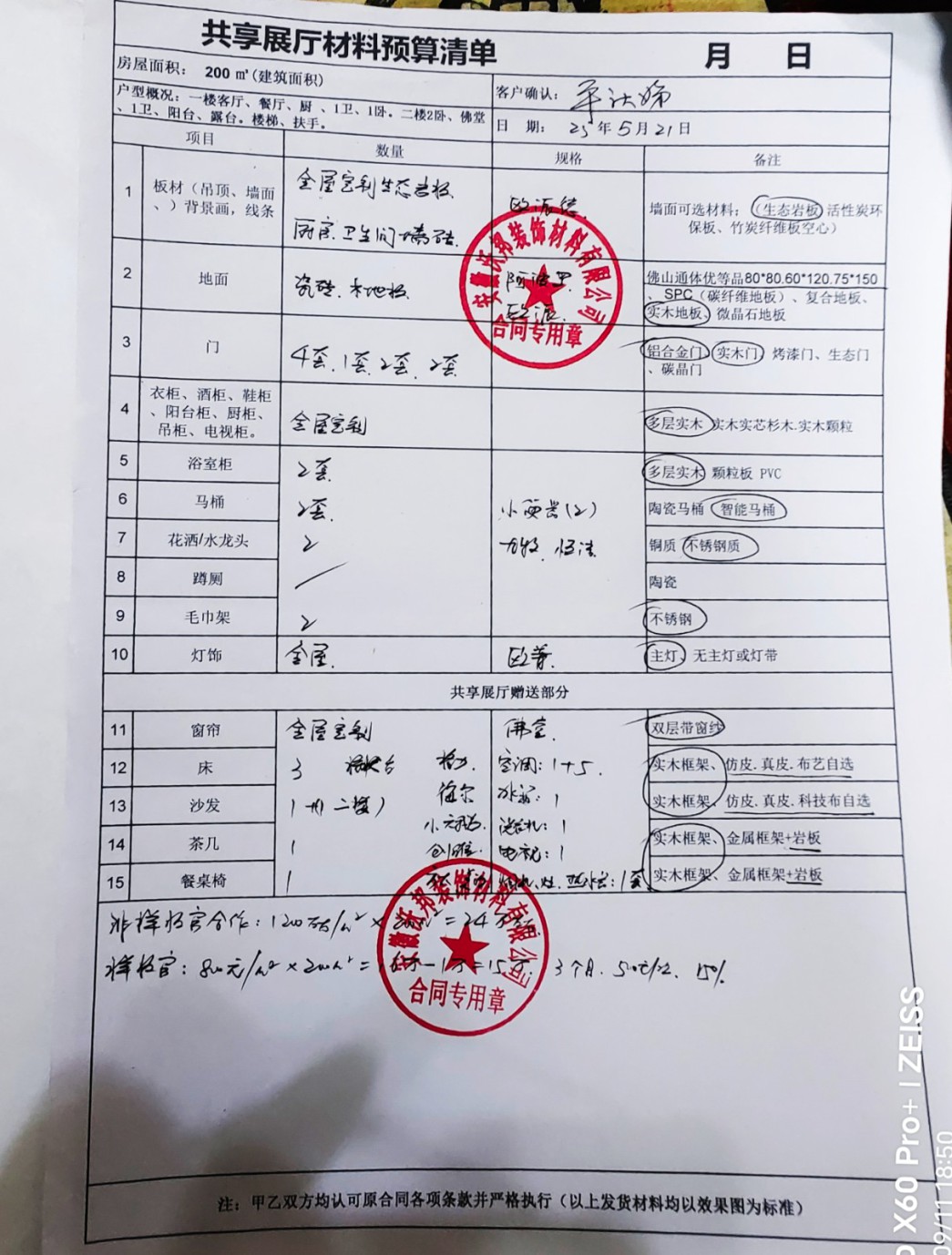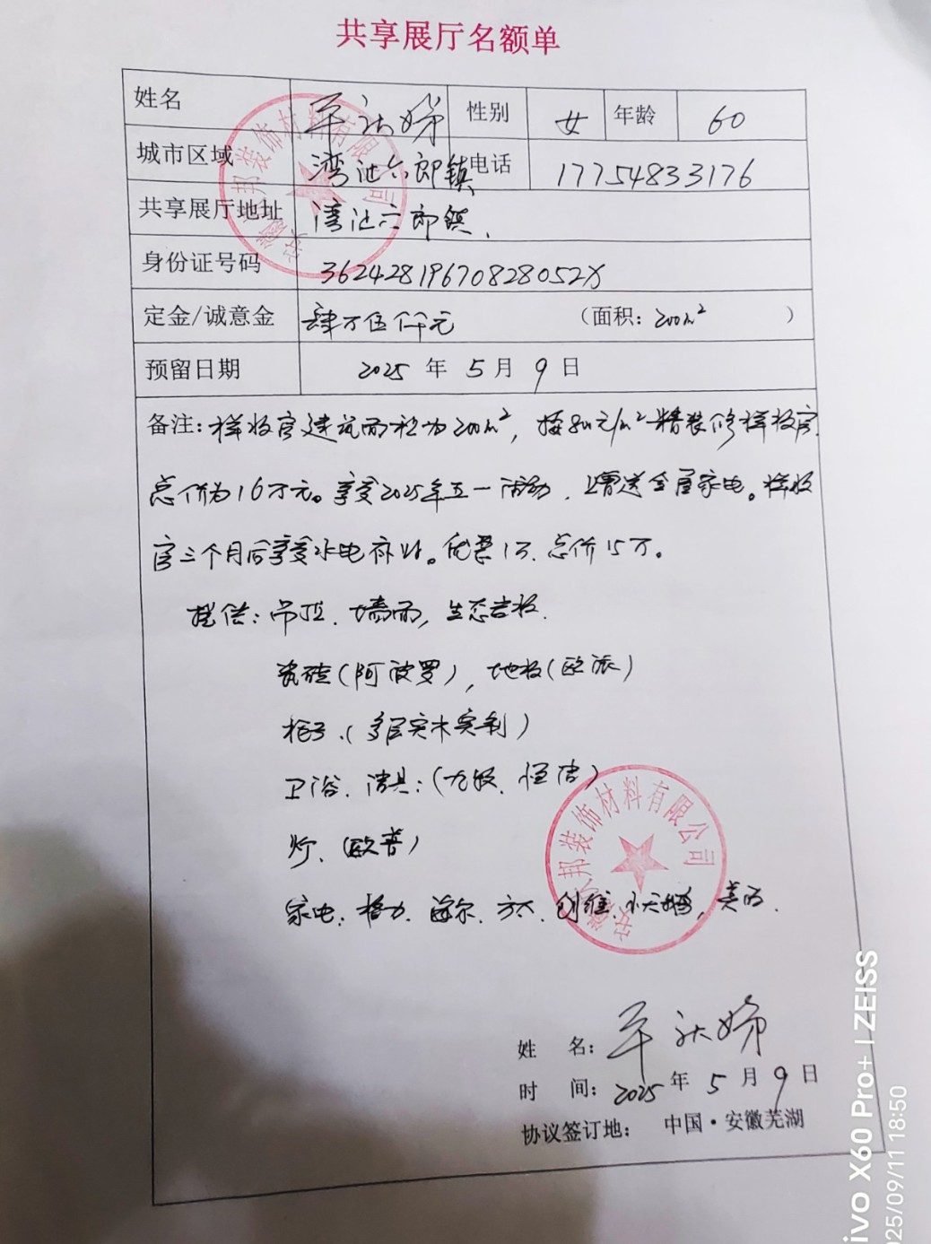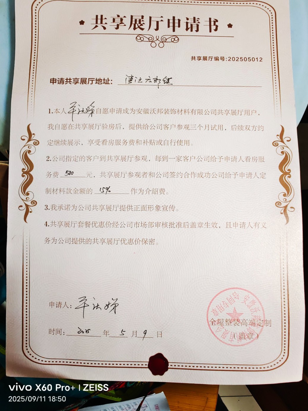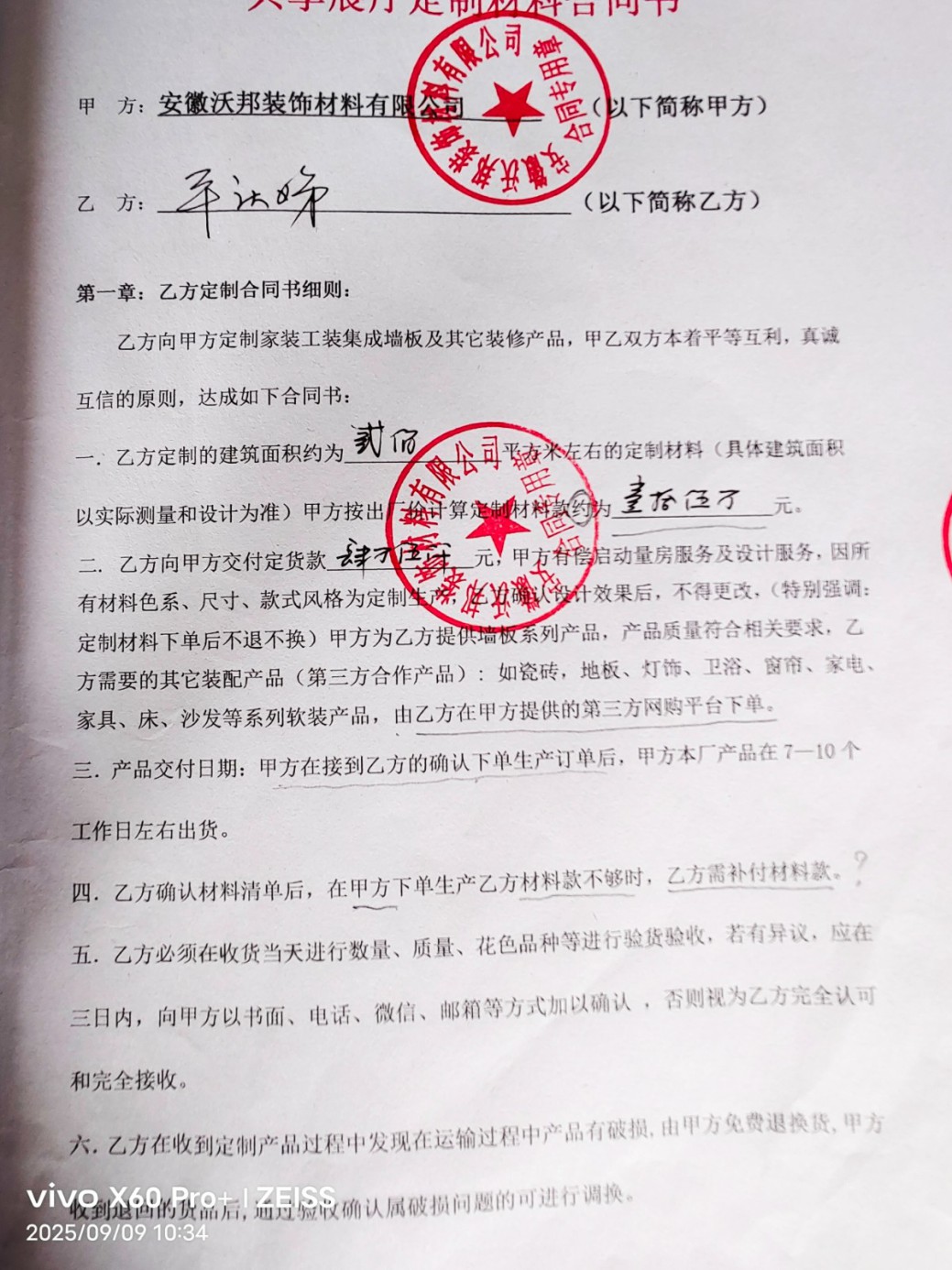 2025年5月,我計劃對位于蕪湖灣沚永太小區(qū)的房屋進(jìn)行裝修,因經(jīng)濟(jì)條件有限,我希望以剛需標(biāo)準(zhǔn)簡單裝修,后在抖音看到沃邦公司“全屋整裝,拎包入住”的宣傳,便咨詢了一下,留了聯(lián)系方式,后來多次收到對方的電話,沃邦公司工作人員態(tài)度熱情,向我介紹全屋整裝,并邀請我參觀樣板房,明確承諾按2025年五一活動優(yōu)惠價,800元/平方米的標(biāo)準(zhǔn)進(jìn)行精裝修(房屋建筑面積200平,實際面積不足150平),且只要將房屋作為其樣板房三個月,便贈送家具家電,同時給予水電工全額補貼。