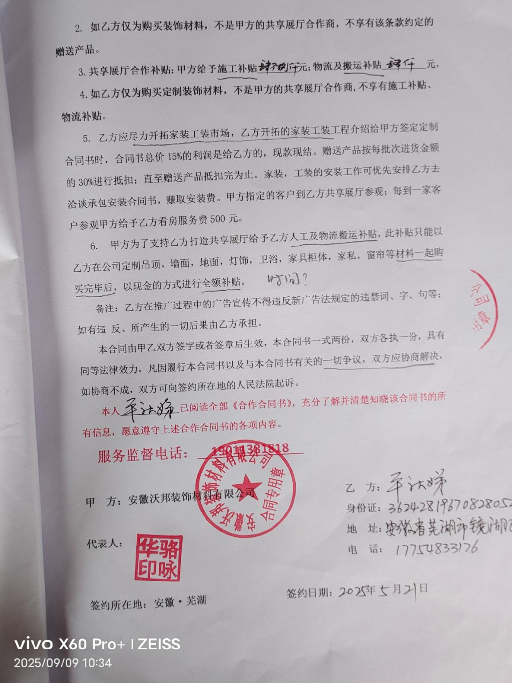 本人平慶娣,性別女年齡60歲,收入極低,現(xiàn)居住于蕪湖市弋江區(qū),聯(lián)系電話17754833176、13655534410此次特向貴部門提交訴求,是因遭遇沃邦裝飾材料有限公司(以下簡稱“沃邦公司”)的嚴(yán)重違約與欺詐行為,導(dǎo)致自身合法權(quán)益受損,生活陷入困境,懇請貴部門介入調(diào)查,幫助我維護(hù)正當(dāng)權(quán)益。