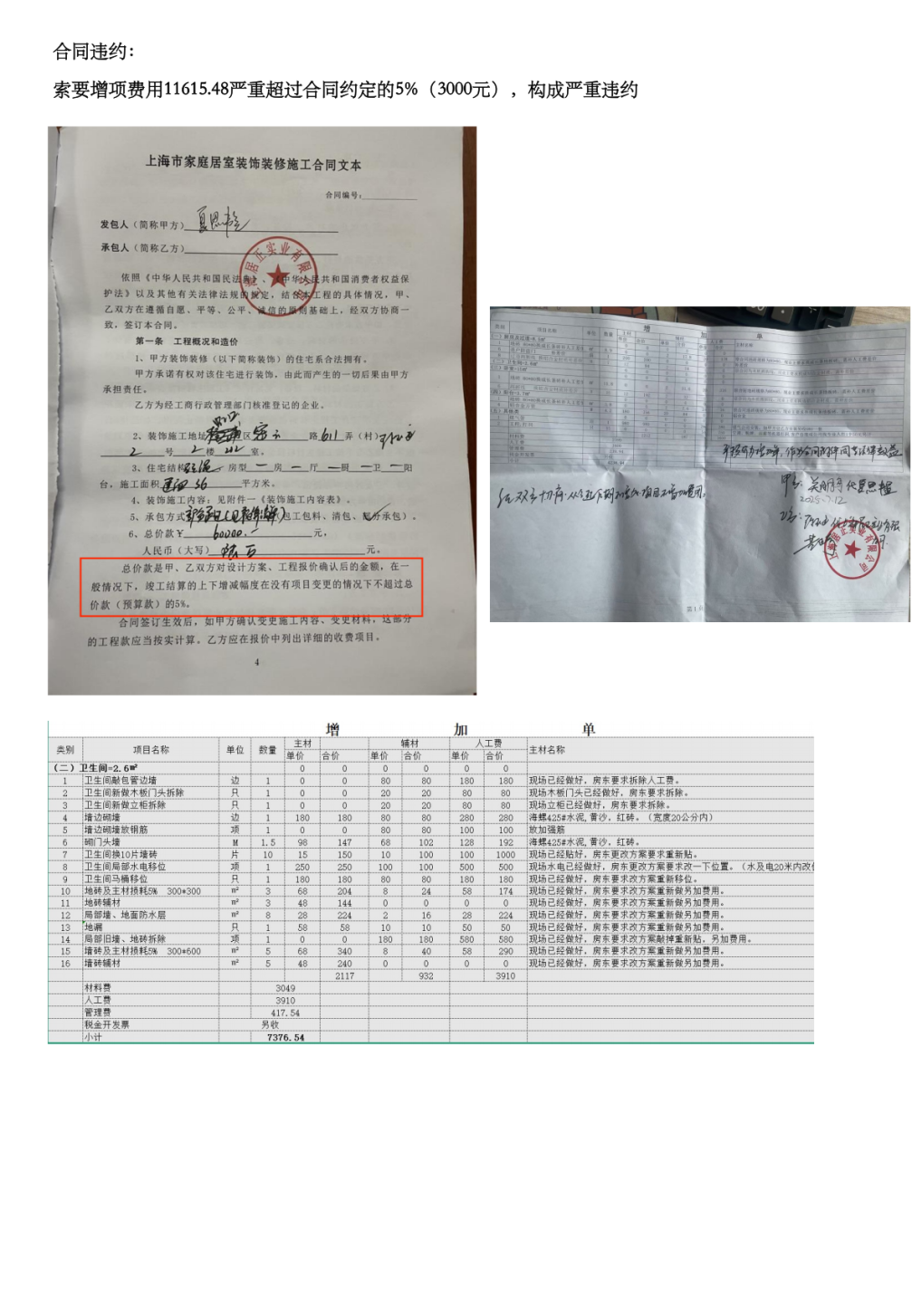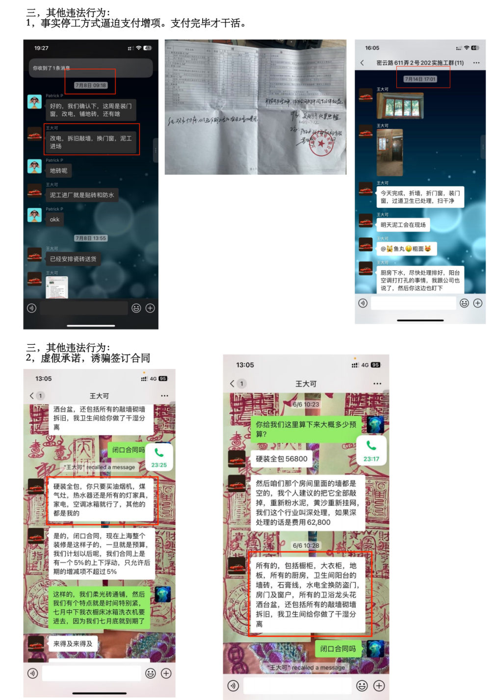 1,以事實(shí)停工方式脅迫支付超額增項(xiàng)費(fèi)用。合同明確約定增項(xiàng)金額不得超過總價(jià)5%。裝修公司在要求超額增項(xiàng)未果后,自2025年7月7日起至2025年7月13日無正當(dāng)理由停工長(zhǎng)達(dá)一周,以此事實(shí)行為向業(yè)主施壓,脅迫業(yè)主支付不合理費(fèi)用。