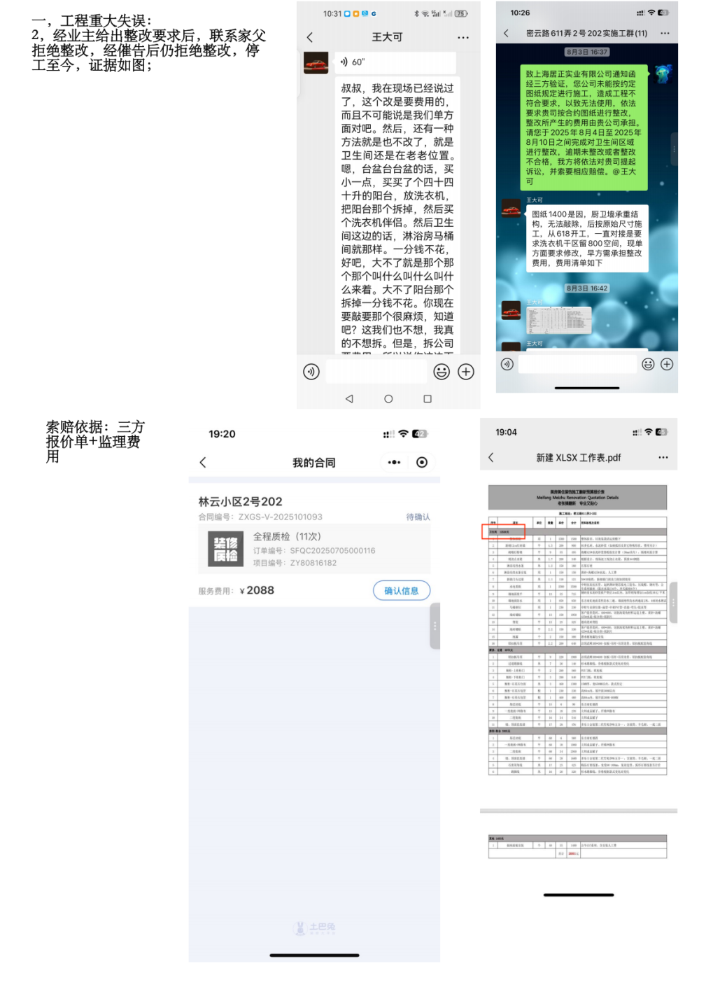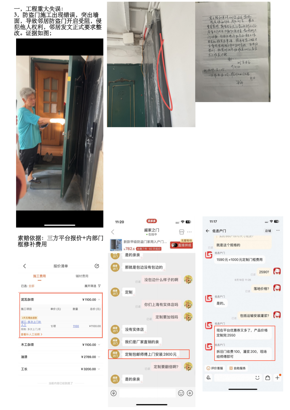 3、裝修過公司賠償業(yè)主各項(xiàng)損失共計(jì)28514元(衛(wèi)生間整改費(fèi)用12526元,防盜門定制更換費(fèi)用3900元,三方監(jiān)理費(fèi)2088元,精神損失費(fèi)10000元)