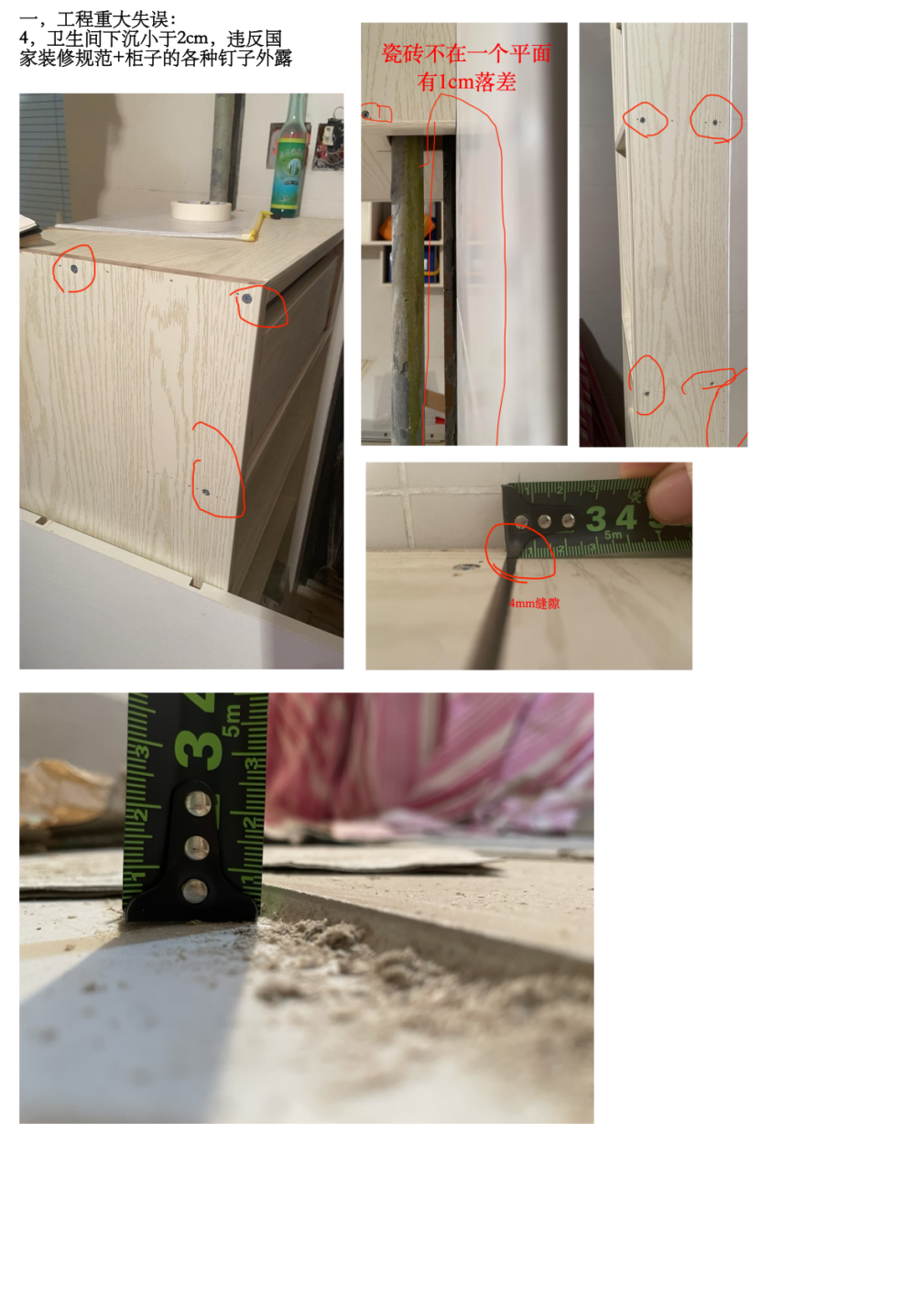 2,衛(wèi)生間濕區(qū)下沉小于2cm,失去擋水功能,無法正常使用,并對(duì)樓下鄰居有侵權(quán)隱患。 違反住宅室內(nèi)裝飾裝修工程質(zhì)量驗(yàn)收規(guī)范(JGJ/T 304-2013)。