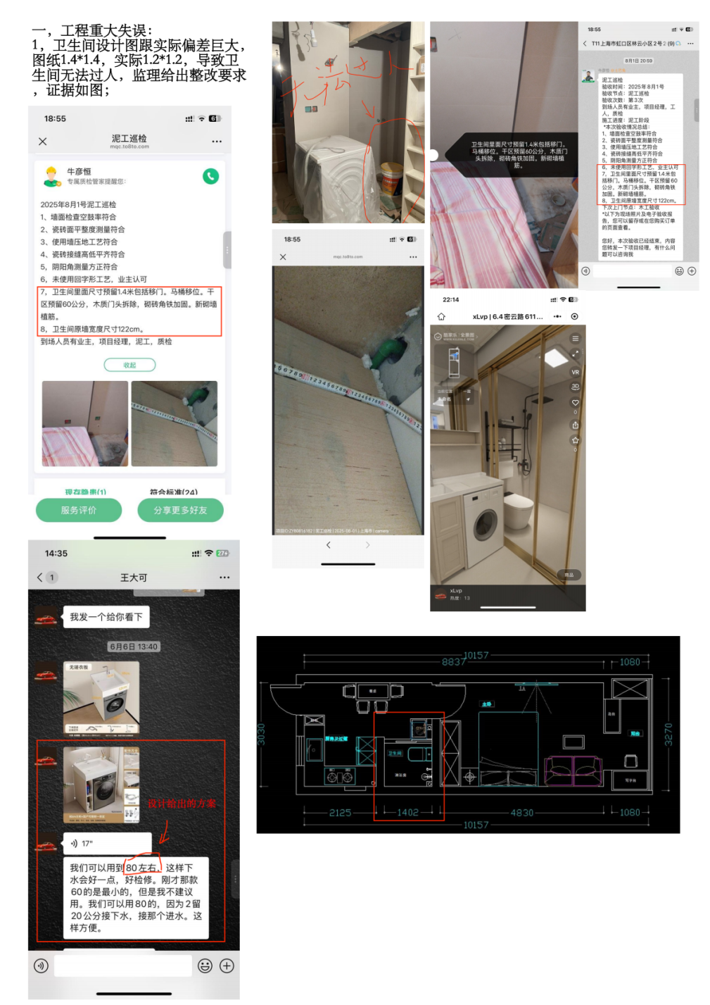 1,合同及附件設(shè)計(jì)圖紙明確約定衛(wèi)生間尺寸為1.4米×1.4米。實(shí)際施工尺寸僅為1.2米×1.2米,偏差達(dá)400mm(遠(yuǎn)超15mm允許偏差上限的13倍),淋浴區(qū)落地寬度不足0.4米,衛(wèi)生間入門寬度不足0.3米,無法過人,完全無法正常使用。經(jīng)過業(yè)主與三方監(jiān)理提出整改要求后,拒絕整改,并停止施工至今。