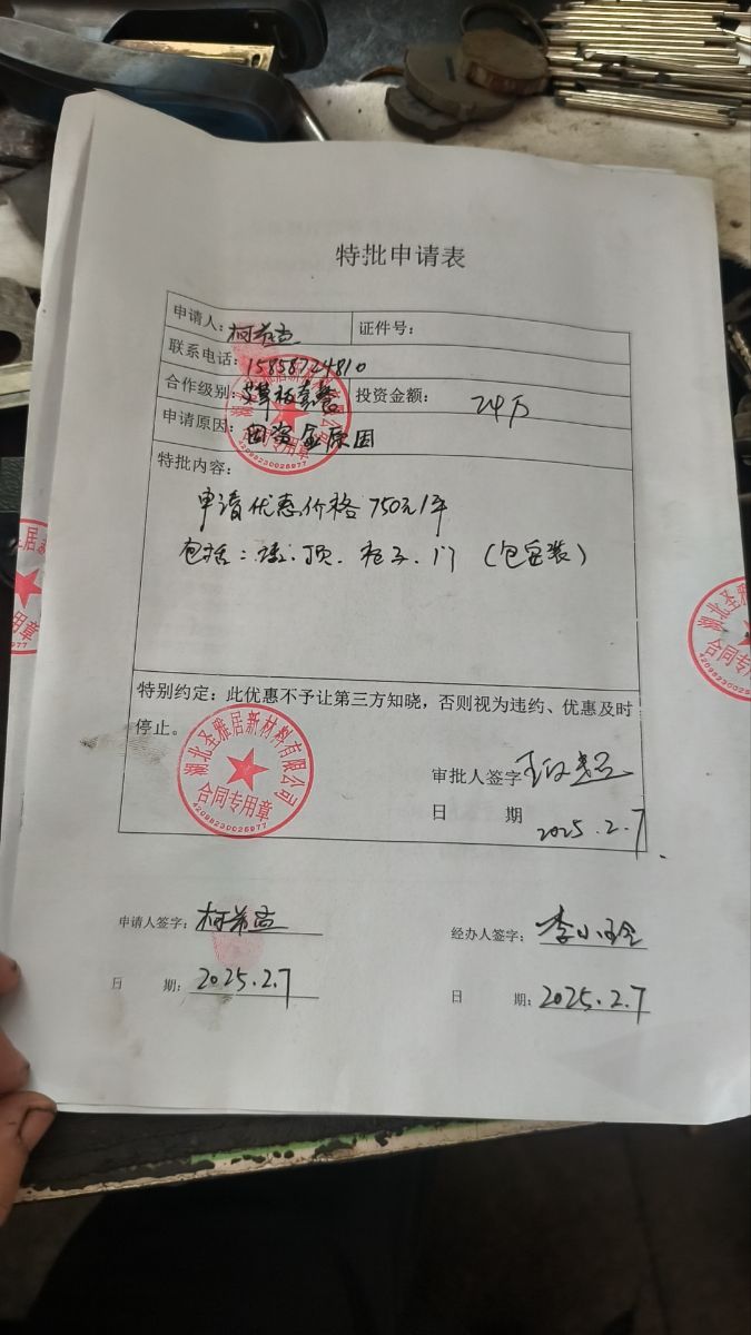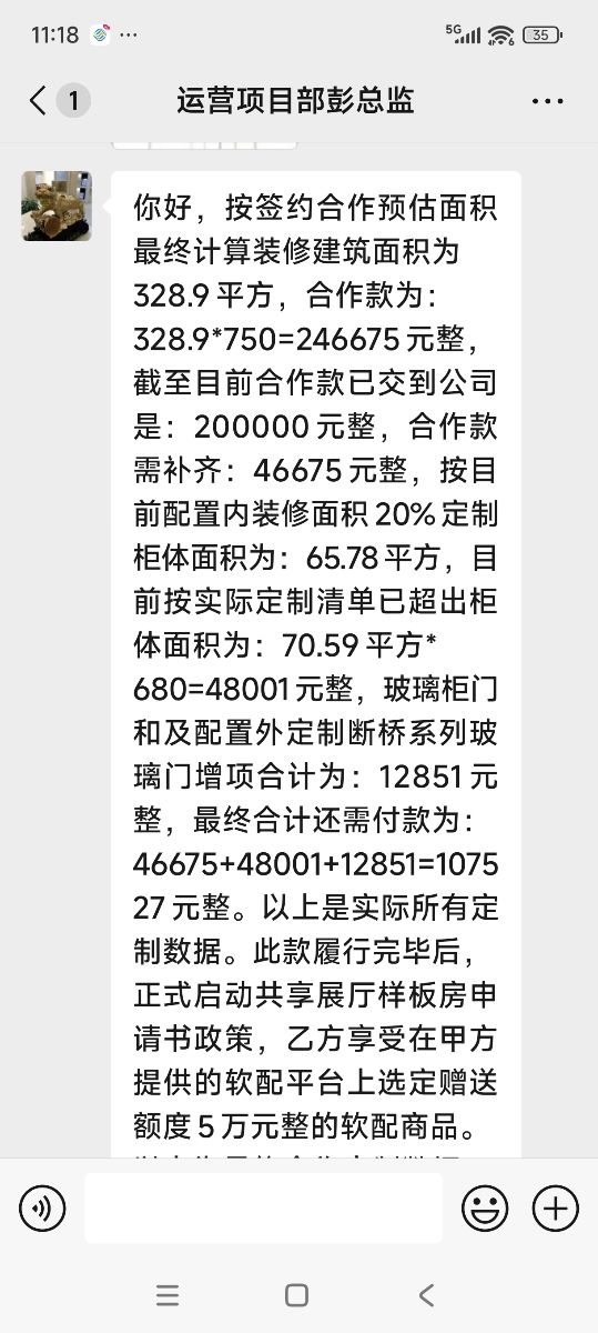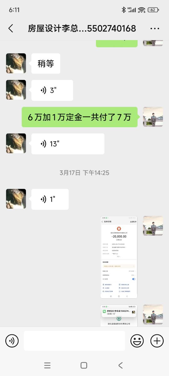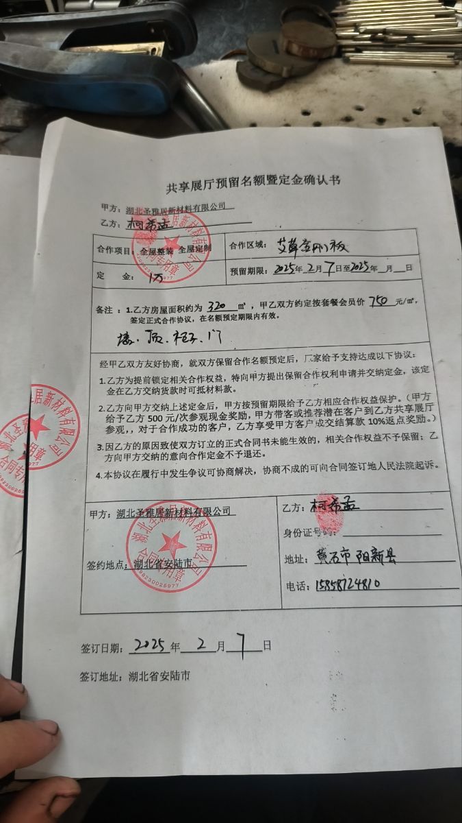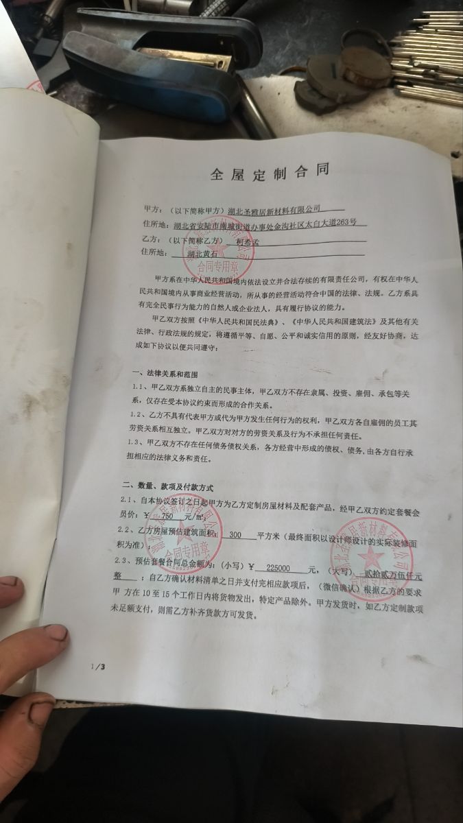 本人2025年2月在抖音平臺,刷到湖北圣雅居新材料有限公司廣告,它們在平臺上宣傳他們是裝修源頭工廠一站式服務(wù),材料,輔料,家居家電,人工安裝全包,打造本地樣板房,裝修直接拎包入住。被他們廣告吸引在平臺留下了電話號碼,他們業(yè)務(wù)員打電話叫我去參觀他們樣板房,看了他們樣板房2月7號交了1萬元訂金,和他們公司李寧總監(jiān)達(dá)成協(xié)議,預(yù)估我房子裝修面積為320平方,以24萬的價格裝修我全屋柜子,柜子門,全屋房間衛(wèi)生間門,全屋墻面,全屋吊頂,材料人工全包。