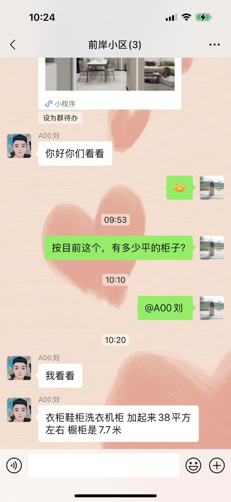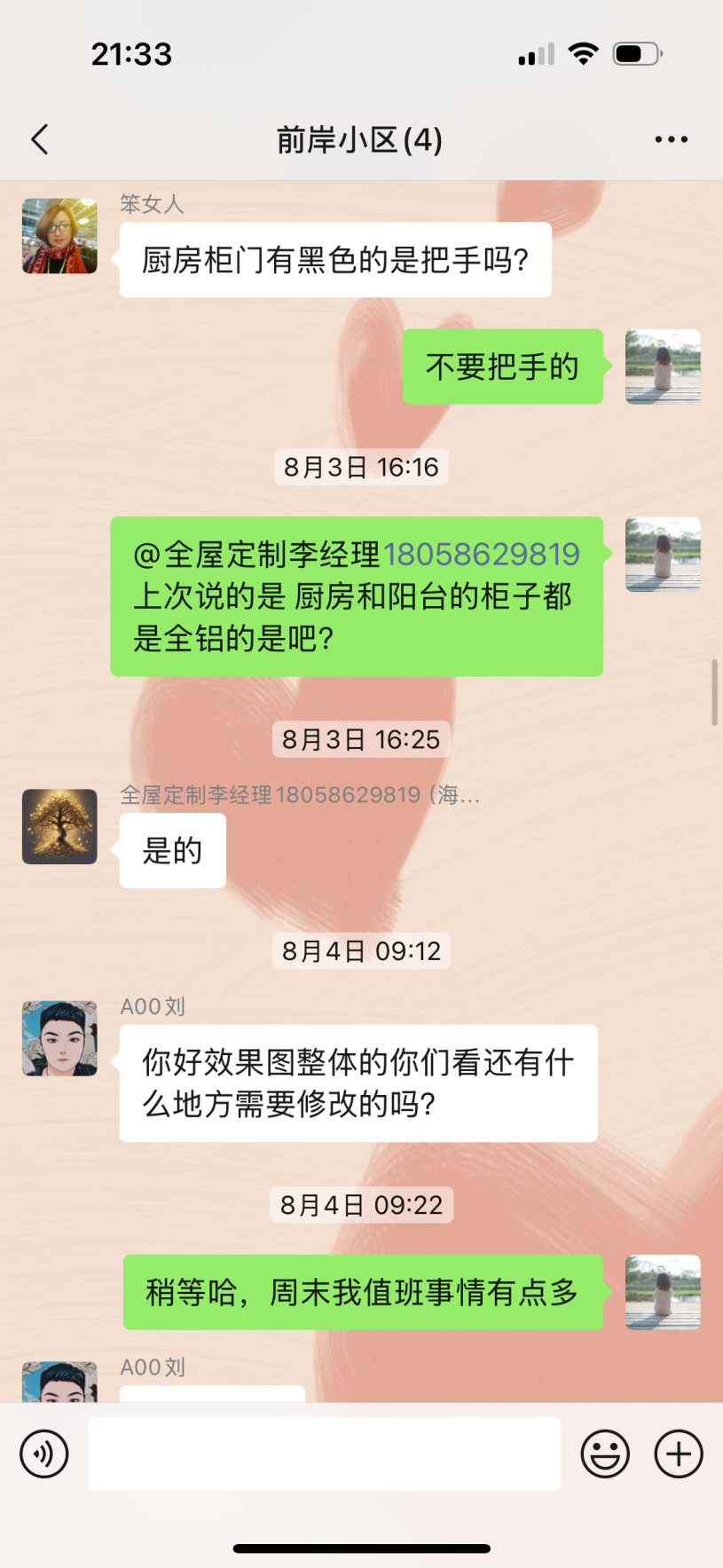 后面他們安排了一個(gè)量房師傅跟我母親聯(lián)系量了房,并且在7-30日設(shè)計(jì)師劉工(微信名:A00劉,手機(jī)15336520569)給到了我們房屋的基礎(chǔ)平面圖,30與31日兩天一直與設(shè)計(jì)師溝通墻體定位等問(wèn)題。31日下午確認(rèn)好后,8月2日劉設(shè)計(jì)出了第一次的方案(僅一套)。因?yàn)榍捌陉P(guān)于柜子的問(wèn)題,我們跟李經(jīng)理一直在溝通贈(zèng)送多少面積的問(wèn)題,我們就想讓設(shè)計(jì)師大致算一家設(shè)計(jì)方案給的大概柜子面積,便于后期談價(jià)格時(shí)我們大概自己有個(gè)預(yù)算可能會(huì)需要支付多少的柜子費(fèi)用。設(shè)計(jì)師說(shuō)差不多38平,但是具體要根據(jù)后期墻板設(shè)計(jì)好后再做柜子的測(cè)量+設(shè)計(jì)才知道。同時(shí)在后面幾天因?yàn)閭€(gè)別細(xì)節(jié)問(wèn)題改了大概3次左右效果圖(微調(diào))。然后跟李經(jīng)理后續(xù)的流程是怎么安排的,他表示需要簽合同,補(bǔ)款,然后下單、生產(chǎn)、安裝。溝通讓李經(jīng)理線上發(fā)一下合同,我們提前看一下細(xì)節(jié),這樣便于到時(shí)候現(xiàn)場(chǎng)的話不需要耽誤太多時(shí)間,他表示合同他們是不對(duì)外發(fā)的,都是線上溝通落實(shí)的。