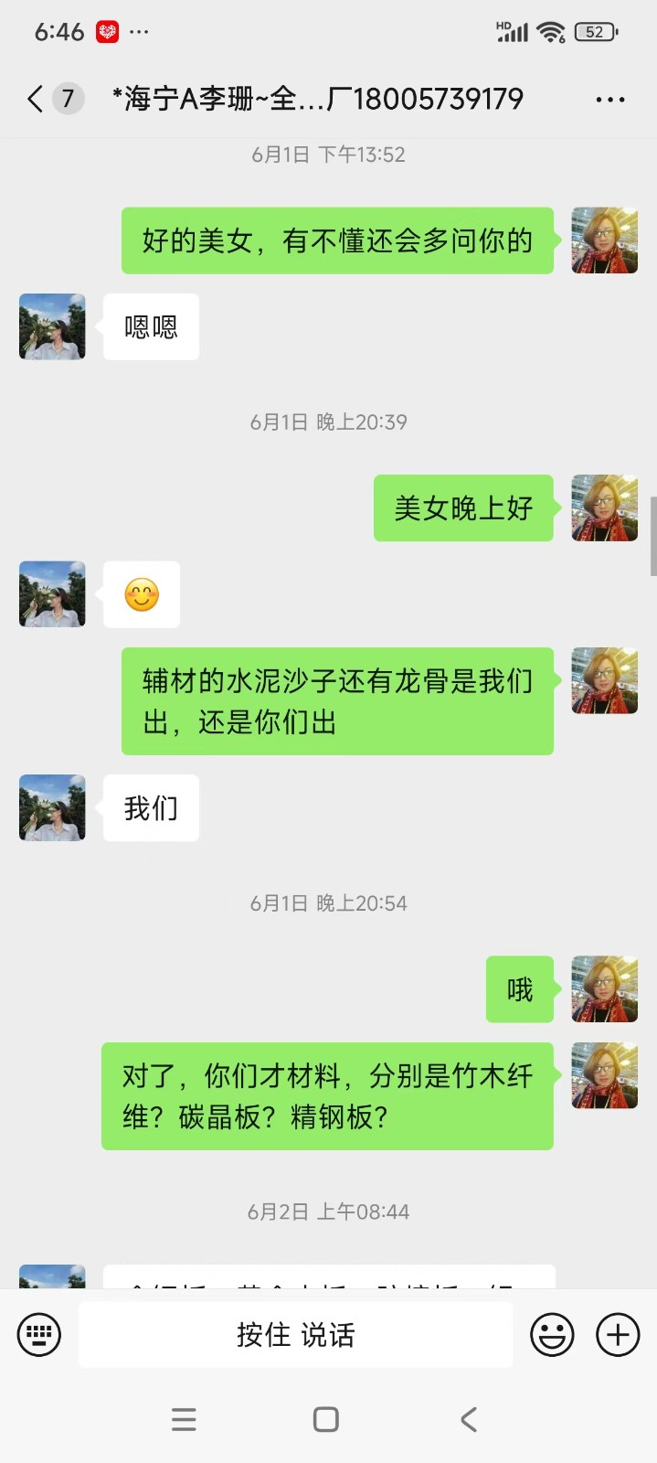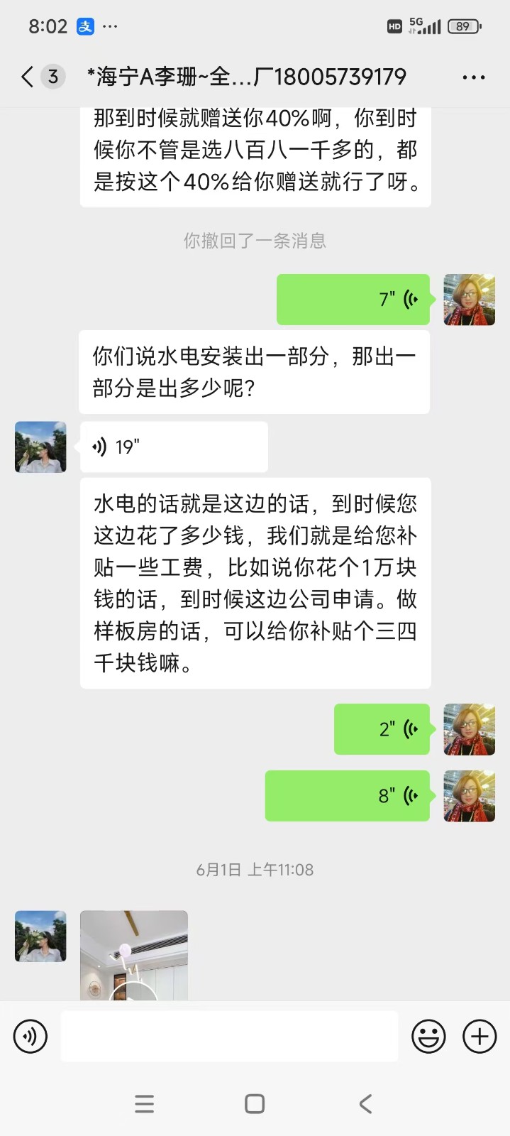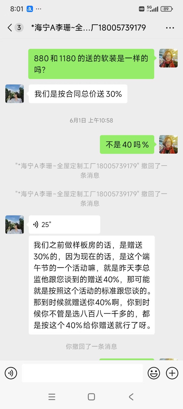 5月31日,我從上海,母親從溫州來(lái)到他們廠里,業(yè)務(wù)經(jīng)理(微信:全屋定制李經(jīng)理18058629819)送餐送水,強(qiáng)調(diào)板材質(zhì)量好、他們是工廠所以價(jià)格低、他們?cè)瓉?lái)是做外貿(mào)的,現(xiàn)在市場(chǎng)內(nèi)卷所以想通過(guò)整裝的方式帶動(dòng)一下板材。并且?guī)覀儏⒂^了他們展廳,并介紹了他們展廳基本都是全鋁柜體、柜門,防水防火防潮,無(wú)甲醛等等等等。針對(duì)我和母親也是希望考慮早點(diǎn)裝完入住的想法,對(duì)方表示他們的工期整體下來(lái)就一個(gè)半月-兩個(gè)月,比傳統(tǒng)裝修快很多,且不需要像傳統(tǒng)裝修放好幾個(gè)月,直接可以入住。此外,如果我們做樣板房:贈(zèng)送全款金額的40%全裝,水電施工、瓷磚施工補(bǔ)貼全包,且后期做樣板房他們帶來(lái)的人來(lái)看房還給到998元的開門紅包,當(dāng)場(chǎng)支付,且如果他們帶過(guò)去看房有成交還可以給到10%提成,如果是我們介紹的還有15%的提成。另外表示因?yàn)樗麄兪亲霭宀牡?,所以木工工人有,但是沒(méi)有水電工師傅、瓷磚師傅的,所以需要我們自己找人,提前墊付他們報(bào)銷。另外表示如果我們沒(méi)有人,他們可以介紹,但是因?yàn)楫惖爻杀靖卟粍澦愕模越ㄗh我們自己當(dāng)?shù)卣?,反正都是他們?bào)銷的。對(duì)于設(shè)計(jì)方案,他們提出會(huì)根據(jù)我們的裝修風(fēng)格想法提供3套設(shè)計(jì)方案,然后在根據(jù)我們的傾向再做調(diào)整最后確定