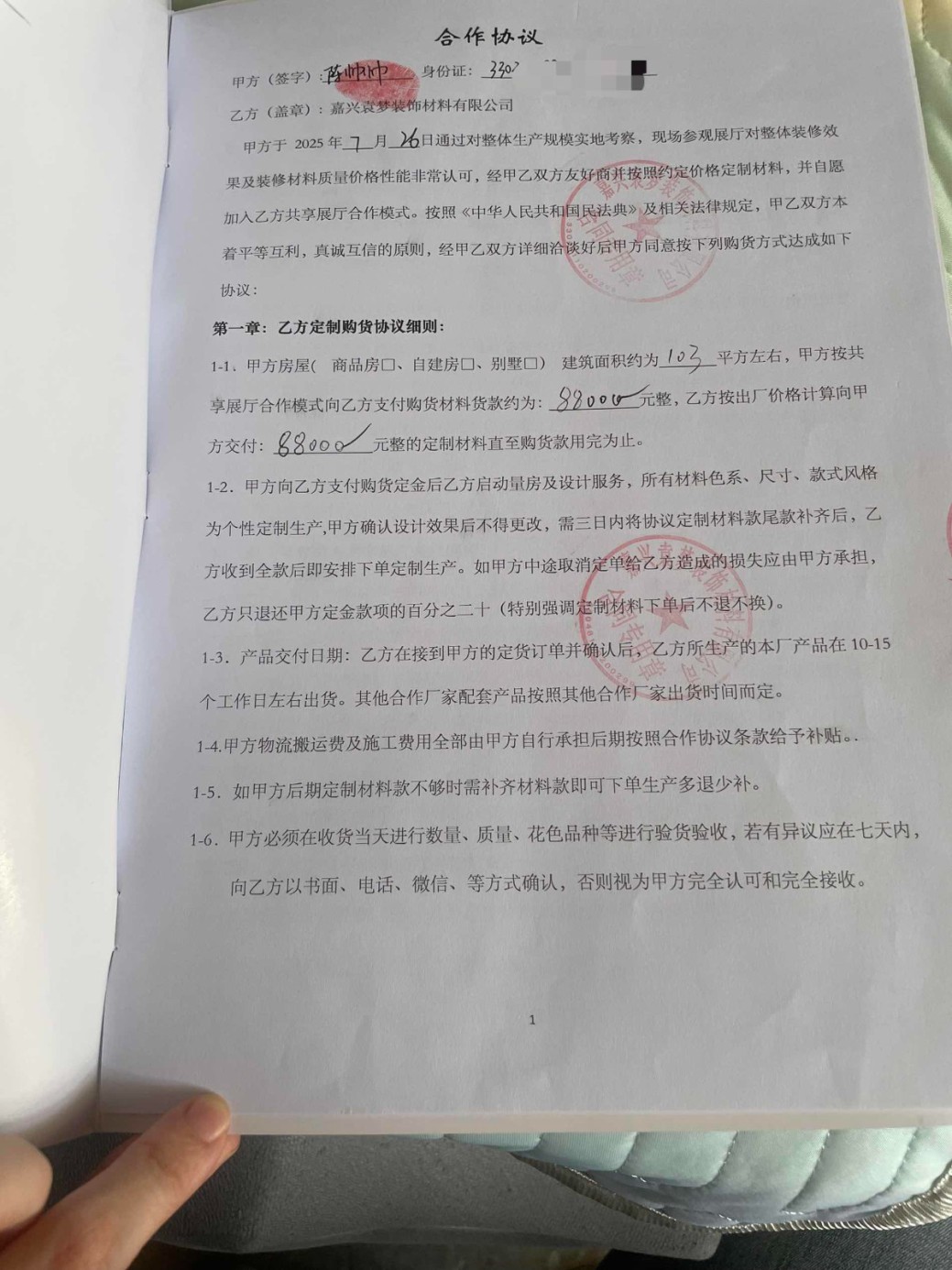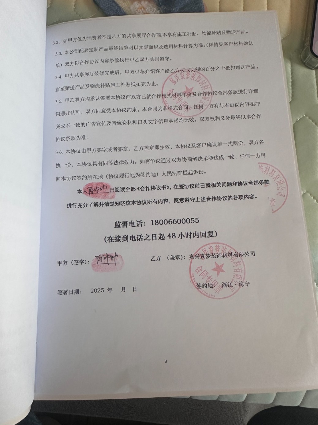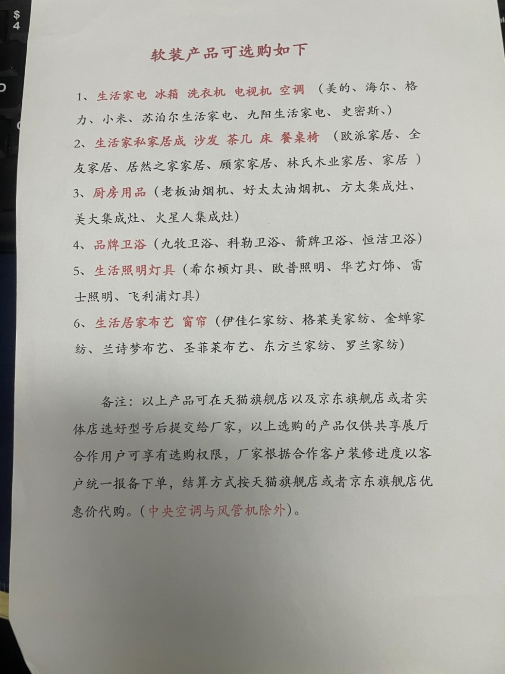 所有費(fèi)用均僅提供收據(jù)不提供發(fā)票。付款之后就有一些苗頭出現(xiàn)了。當(dāng)天晚上回去后我告知李經(jīng)理,額外送的三選一我么選擇柜機(jī)。然后后面讓他給鏈接,我們來(lái)選柜機(jī)類型,因?yàn)槿绻蛷d裝柜機(jī)要考慮預(yù)埋銅管、鉆空等問(wèn)題,而且不同品牌的銅管贈(zèng)送不一樣,我們自己要買銅管迷失等等,但是一直讓他給鏈接都不給發(fā),哪怕我自己根據(jù)他們軟裝清單的品牌上去京東上看好款式跟他確認(rèn)是不是可行也不給正面回復(fù)~加之家里親戚一直說(shuō)現(xiàn)在柜機(jī)不合適,所以我猶豫說(shuō)要不選風(fēng)管機(jī),直到我說(shuō)那要不然我選擇冰箱吧,我自己買風(fēng)管機(jī)好了,否則來(lái)不及了,他才回復(fù)好的。然后說(shuō)反正時(shí)候反正從你軟裝的款里面補(bǔ)貼給你就行了。然后開始覺(jué)得他們已經(jīng)開始有些怠慢了。另外他們又換了一個(gè)陳經(jīng)理聯(lián)系我(微信名“客服陳經(jīng)理13372321757”),說(shuō)是現(xiàn)在板材訂單到他那邊了,他是客服壓根我確認(rèn)一下我們的板材下單制作了,然后他發(fā)了個(gè)表格,我說(shuō)我怎么直到你們板材用量呀, 他說(shuō)讓我確認(rèn)下設(shè)計(jì)方案就可以。他們根據(jù)設(shè)計(jì)師的方案計(jì)算的板材,我說(shuō)那我只需要確認(rèn)方案沒(méi)問(wèn)題就可以了是吧。價(jià)格什么的我不用管哈,他說(shuō)是的。板材確認(rèn)后挺久都沒(méi)有制作好通知我說(shuō)發(fā)貨,然后后面因?yàn)檠b修流程的問(wèn)題最終我們說(shuō)讓瓷磚也運(yùn)過(guò)來(lái),衛(wèi)生間這些瓷磚先貼,選瓷磚的時(shí)候又是一個(gè)說(shuō)是定制部的人(微信名:定制部,手機(jī)號(hào)13606737905)對(duì)接溝通。一樣,在確認(rèn)瓷磚的時(shí)候我也問(wèn)了,我說(shuō)我就選擇款式哈,價(jià)格跟我沒(méi)關(guān)系。瓷磚(物流費(fèi)2000墊付、搬運(yùn)費(fèi)500墊付)來(lái)時(shí)我母親就催陳經(jīng)理,告知瓷磚加工加預(yù)計(jì)三五天就好了,他們可以提前安排,陳說(shuō)瓷磚貼完前一天告知他就可以,他們一兩天就安排好。9月20日貼好的瓷磚,9-22下午板材發(fā)到(物流費(fèi)1800墊付、搬運(yùn)費(fèi)350墊付),到的板材是三五產(chǎn)品,與前期看的樣品天差地別,就是垃圾貨,上面的覆膜一碰就巧,母親聯(lián)系陳經(jīng)理說(shuō)他們施工線就幾條,不可能不一樣的,死不認(rèn)賬。然后關(guān)于催促安裝師傅,催了好幾次陳經(jīng)理,直至9月25師傅(微信名:彪行天下 13606737559)才聯(lián)系我(說(shuō)是他才收到通知),然后要了發(fā)貨材料和效果圖后,第二天催促后,師傅發(fā)了個(gè)施工清單,寫著要兩萬(wàn)多安裝費(fèi),還有其他增項(xiàng)。聯(lián)系陳經(jīng)理,陳經(jīng)理說(shuō)他們公司沒(méi)有工人的,如果是李經(jīng)理談的讓我聯(lián)系李經(jīng)理,打電話給李經(jīng)理,告知李經(jīng)理8月離職(就是他們的套路),他們公司就沒(méi)有安裝,他們就是賣板材的,然后踢球說(shuō)讓我再聯(lián)系陳經(jīng)理。接下來(lái)就開始了一系列的無(wú)賴行為:不承認(rèn)包安裝板材;不承認(rèn)施工、物流補(bǔ)貼款裝修好交付后付;不承認(rèn)軟裝補(bǔ)貼是裝修過(guò)程中報(bào)備下單;所有的費(fèi)用全都需要裝修完成在樣板房期間介紹客戶成交后的提成做抵扣;說(shuō)我付的款是買材料的錢,他們就是材料工廠不是裝修公司;所有東西認(rèn)合同、材料清單只是一個(gè)清單且認(rèn)為內(nèi)容是在蓋章后我自己加的,哪怕是真的先寫字再蓋章他們也做不到;他們沒(méi)有全鋁柜板,只有顆粒板和實(shí)木板;我的款項(xiàng)只是定制他們材料的款項(xiàng),目前用了5萬(wàn)出頭的板材,一萬(wàn)六千多的瓷磚。如果我們要繼續(xù)就他們負(fù)責(zé)木工,我們其他的繼續(xù)進(jìn)行,后期材料多退少補(bǔ),開玩笑,按你們這種價(jià)格,后面地板、柜子又都是錢,就是個(gè)無(wú)底洞,如果要退款就扣除已經(jīng)用過(guò)的費(fèi)用后剩余的退回。這真的是滑天下之大稽,啥板子138/平,你們這撐死就是比硬紙板厚一點(diǎn)點(diǎn)罷了,更別說(shuō)什么環(huán)保等級(jí)了,一個(gè)三無(wú)產(chǎn)品是人家市面上板材的三五倍的價(jià)格?