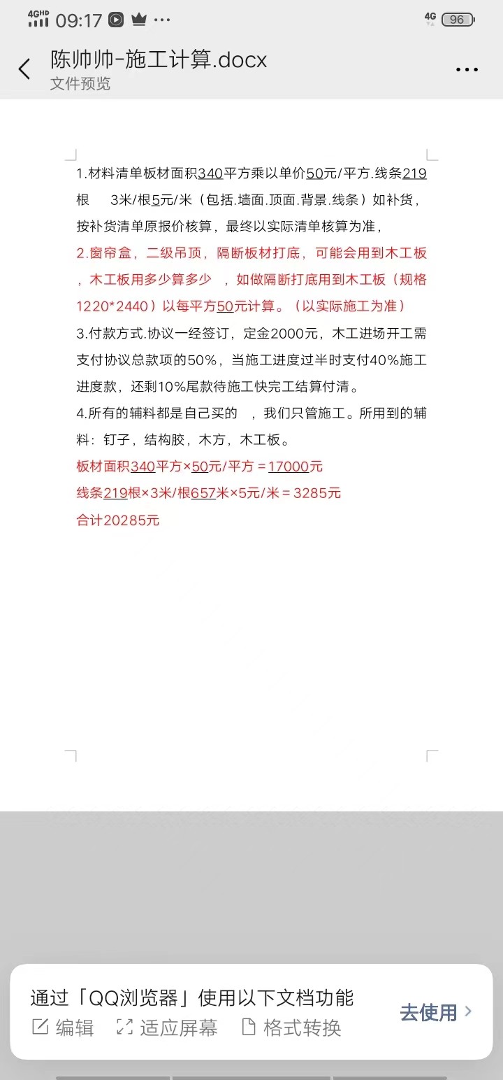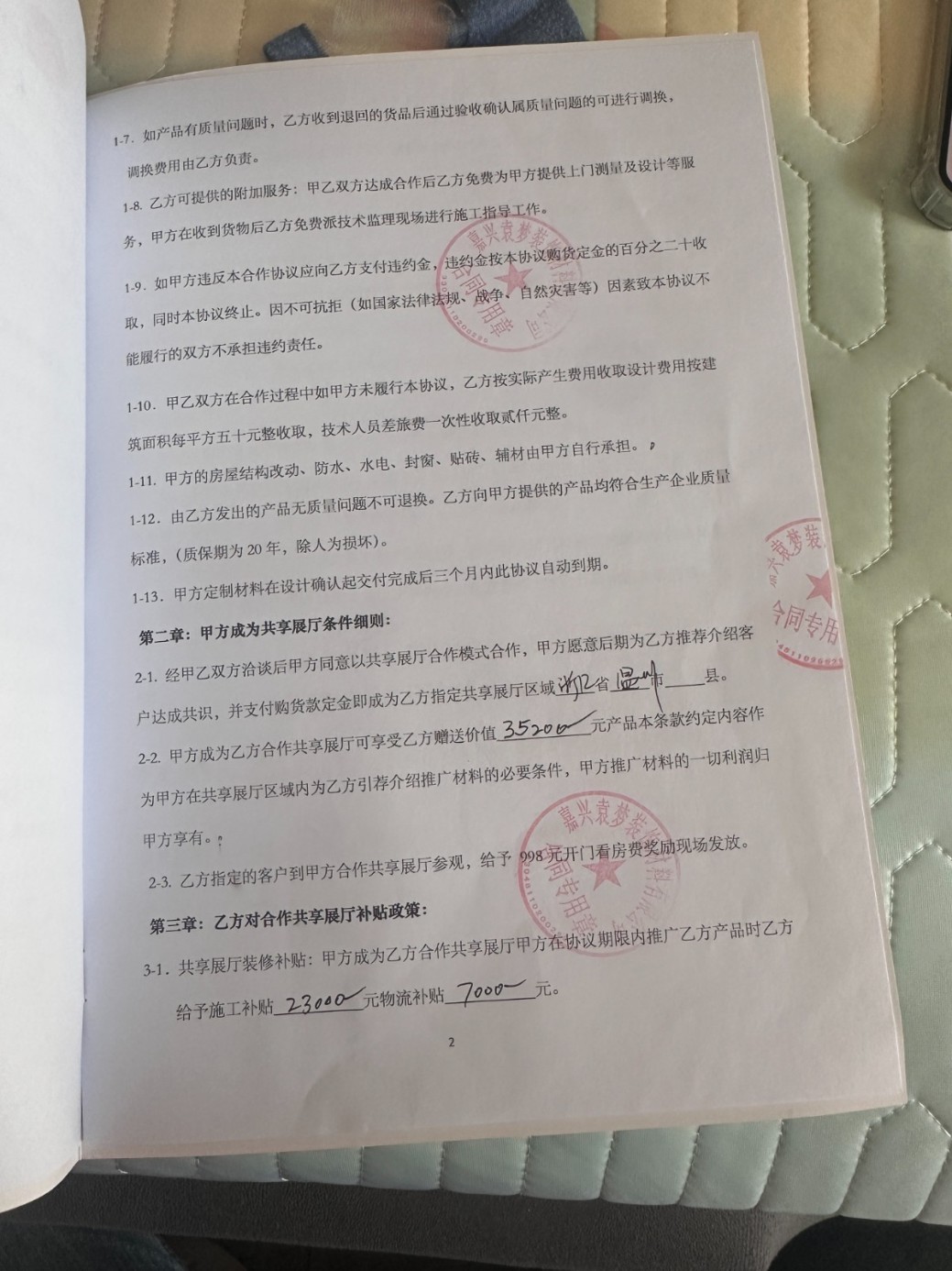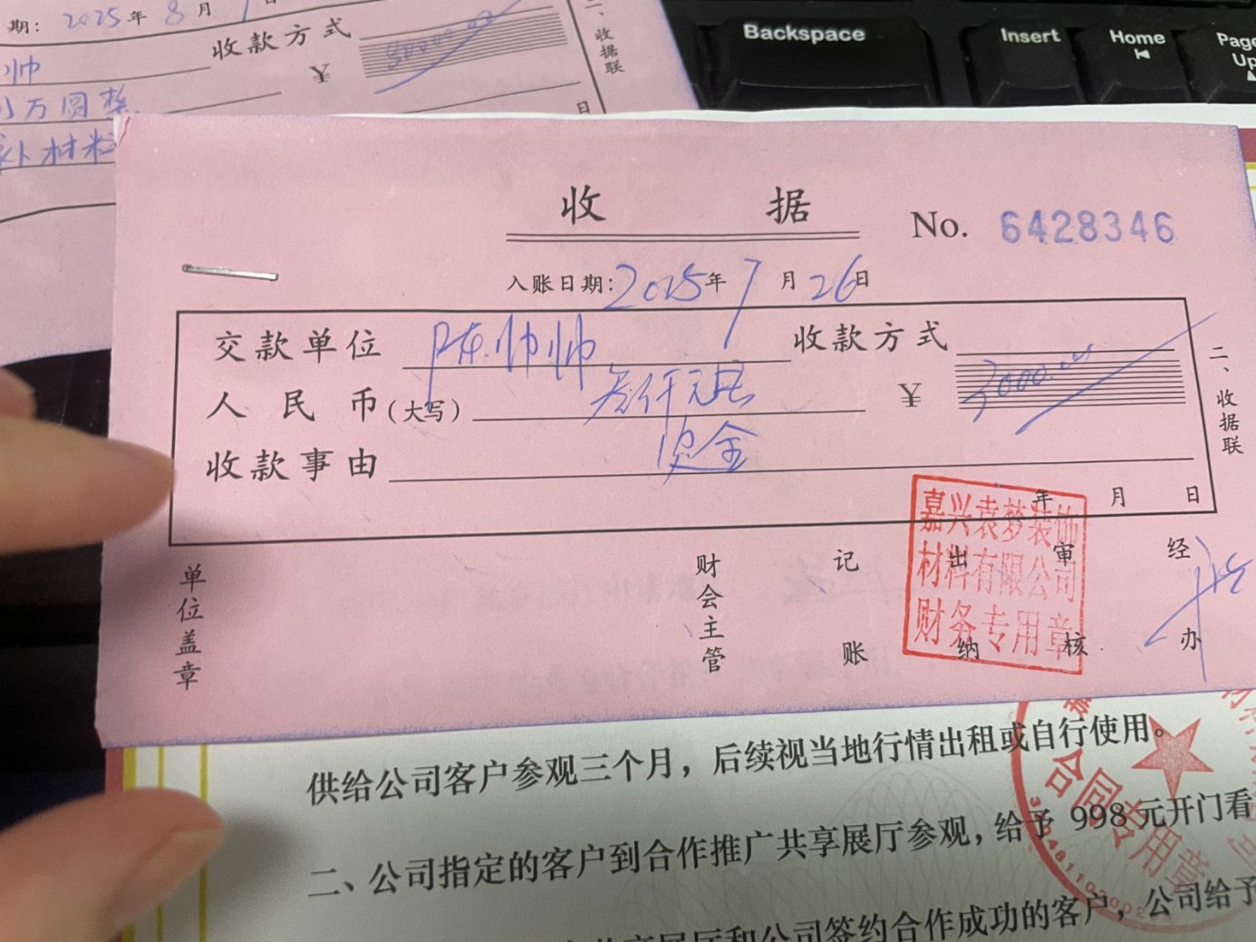 所有費(fèi)用均僅提供收據(jù)不提供發(fā)票。付款之后就有一些苗頭出現(xiàn)了。當(dāng)天晚上回去后我告知李經(jīng)理,額外送的三選一我么選擇柜機(jī)。然后后面讓他給鏈接,我們來(lái)選柜機(jī)類型,因?yàn)槿绻蛷d裝柜機(jī)要考慮預(yù)埋銅管、鉆空等問(wèn)題,而且不同品牌的銅管贈(zèng)送不一樣,我們自己要買銅管迷失等等,但是一直讓他給鏈接都不給發(fā),哪怕我自己根據(jù)他們軟裝清單的品牌上去京東上看好款式跟他確認(rèn)是不是可行也不給正面回復(fù)~加之家里親戚一直說(shuō)現(xiàn)在柜機(jī)不合適,所以我猶豫說(shuō)要不選風(fēng)管機(jī),直到我說(shuō)那要不然我選擇冰箱吧,我自己買風(fēng)管機(jī)好了,否則來(lái)不及了,他才回復(fù)好的。然后說(shuō)反正時(shí)候反正從你軟裝的款里面補(bǔ)貼給你就行了。然后開始覺(jué)得他們已經(jīng)開始有些怠慢了。另外他們又換了一個(gè)陳經(jīng)理聯(lián)系我(微信名“客服陳經(jīng)理13372321757”),說(shuō)是現(xiàn)在板材訂單到他那邊了,他是客服壓根我確認(rèn)一下我們的板材下單制作了,然后他發(fā)了個(gè)表格,我說(shuō)我怎么直到你們板材用量呀, 他說(shuō)讓我確認(rèn)下設(shè)計(jì)方案就可以。他們根據(jù)設(shè)計(jì)師的方案計(jì)算的板材,我說(shuō)那我只需要確認(rèn)方案沒(méi)問(wèn)題就可以了是吧。價(jià)格什么的我不用管哈,他說(shuō)是的。板材確認(rèn)后挺久都沒(méi)有制作好通知我說(shuō)發(fā)貨,然后后面因?yàn)檠b修流程的問(wèn)題最終我們說(shuō)讓瓷磚也運(yùn)過(guò)來(lái),衛(wèi)生間這些瓷磚先貼,選瓷磚的時(shí)候又是一個(gè)說(shuō)是定制部的人(微信名:定制部,手機(jī)號(hào)13606737905)對(duì)接溝通。一樣,在確認(rèn)瓷磚的時(shí)候我也問(wèn)了,我說(shuō)我就選擇款式哈,價(jià)格跟我沒(méi)關(guān)系。瓷磚(物流費(fèi)2000墊付、搬運(yùn)費(fèi)500墊付)來(lái)時(shí)我母親就催陳經(jīng)理,告知瓷磚加工加預(yù)計(jì)三五天就好了,他們可以提前安排,陳說(shuō)瓷磚貼完前一天告知他就可以,他們一兩天就安排好。9月20日貼好的瓷磚,9-22下午板材發(fā)到(物流費(fèi)1800墊付、搬運(yùn)費(fèi)350墊付),到的板材是三五產(chǎn)品,與前期看的樣品天差地別,就是垃圾貨,上面的覆膜一碰就巧,母親聯(lián)系陳經(jīng)理說(shuō)他們施工線就幾條,不可能不一樣的,死不認(rèn)賬。然后關(guān)于催促安裝師傅,催了好幾次陳經(jīng)理,直至9月25師傅(微信名:彪行天下 13606737559)才聯(lián)系我(說(shuō)是他才收到通知),然后要了發(fā)貨材料和效果圖后,第二天催促后,師傅發(fā)了個(gè)施工清單,寫著要兩萬(wàn)多安裝費(fèi),還有其他增項(xiàng)。聯(lián)系陳經(jīng)理,陳經(jīng)理說(shuō)他們公司沒(méi)有工人的,如果是李經(jīng)理談的讓我聯(lián)系李經(jīng)理,打電話給李經(jīng)理,告知李經(jīng)理8月離職(就是他們的套路),他們公司就沒(méi)有安裝,他們就是賣板材的,然后踢球說(shuō)讓我再聯(lián)系陳經(jīng)理。接下來(lái)就開始了一系列的無(wú)賴行為:不承認(rèn)包安裝板材;不承認(rèn)施工、物流補(bǔ)貼款裝修好交付后付;不承認(rèn)軟裝補(bǔ)貼是裝修過(guò)程中報(bào)備下單;所有的費(fèi)用全都需要裝修完成在樣板房期間介紹客戶成交后的提成做抵扣;說(shuō)我付的款是買材料的錢,他們就是材料工廠不是裝修公司;所有東西認(rèn)合同、材料清單只是一個(gè)清單且認(rèn)為內(nèi)容是在蓋章后我自己加的,哪怕是真的先寫字再蓋章他們也做不到;他們沒(méi)有全鋁柜板,只有顆粒板和實(shí)木板;我的款項(xiàng)只是定制他們材料的款項(xiàng),目前用了5萬(wàn)出頭的板材,一萬(wàn)六千多的瓷磚。如果我們要繼續(xù)就他們負(fù)責(zé)木工,我們其他的繼續(xù)進(jìn)行,后期材料多退少補(bǔ),開玩笑,按你們這種價(jià)格,后面地板、柜子又都是錢,就是個(gè)無(wú)底洞,如果要退款就扣除已經(jīng)用過(guò)的費(fèi)用后剩余的退回。這真的是滑天下之大稽,啥板子138/平,你們這撐死就是比硬紙板厚一點(diǎn)點(diǎn)罷了,更別說(shuō)什么環(huán)保等級(jí)了,一個(gè)三無(wú)產(chǎn)品是人家市面上板材的三五倍的價(jià)格?